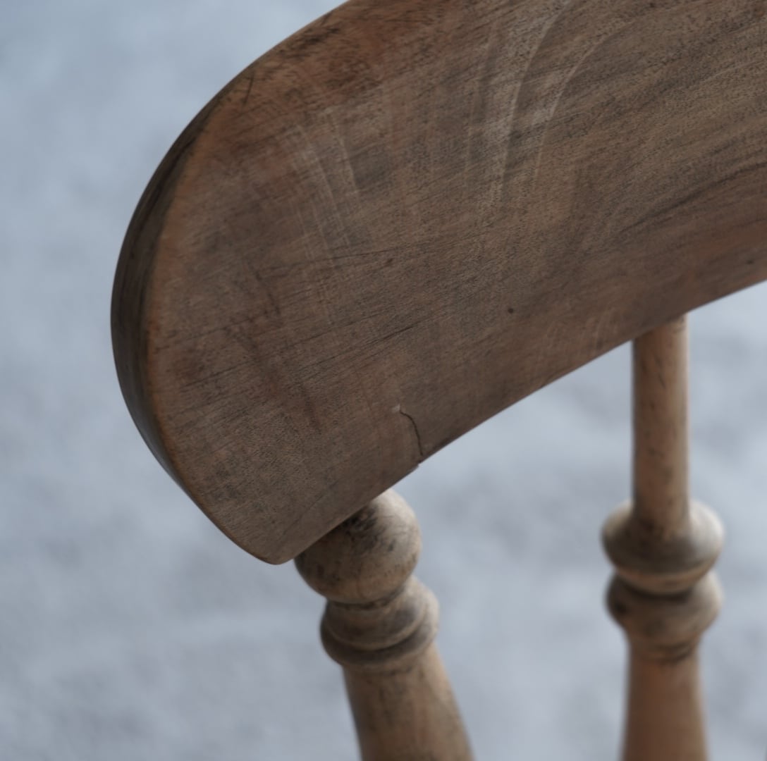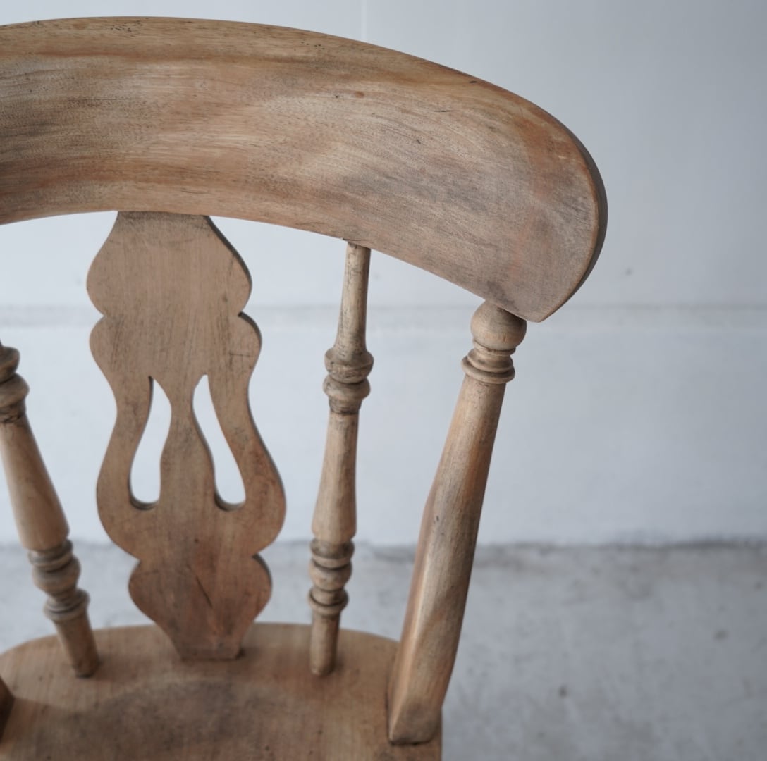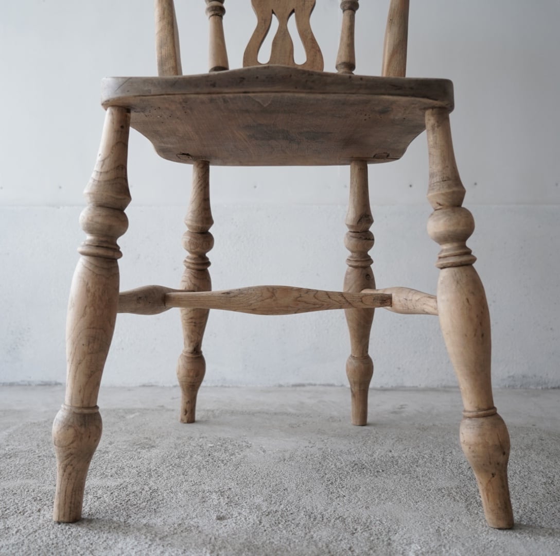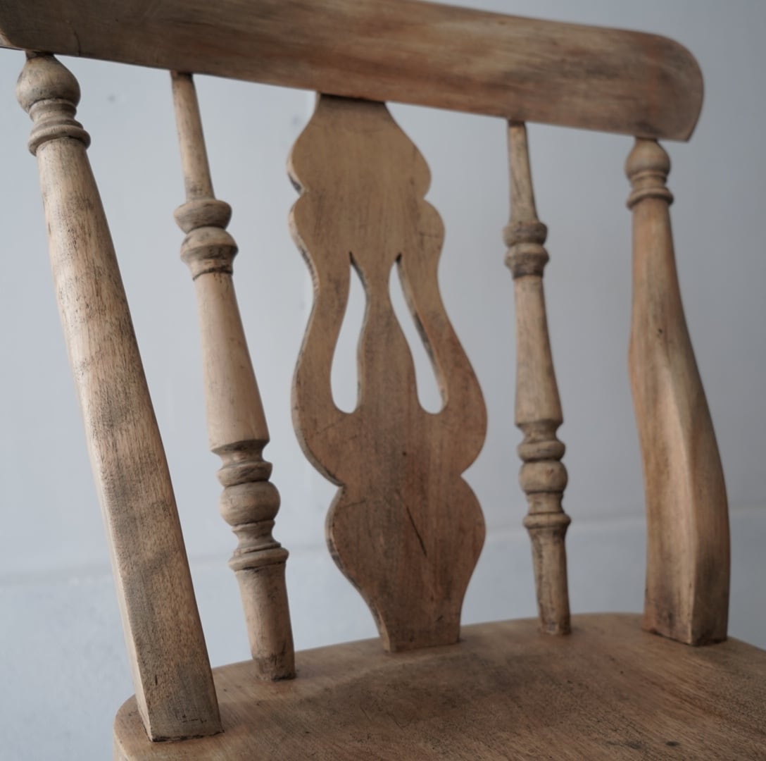 無垢材のナチュラルな木味と背もたれにあしらわれた弦楽器フィドルのモチーフが美しいアンティークチェア。