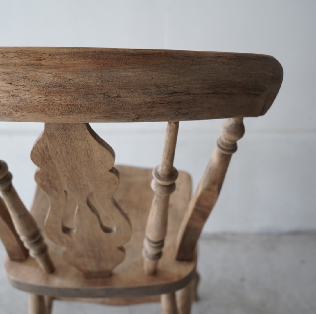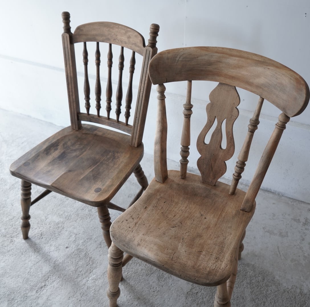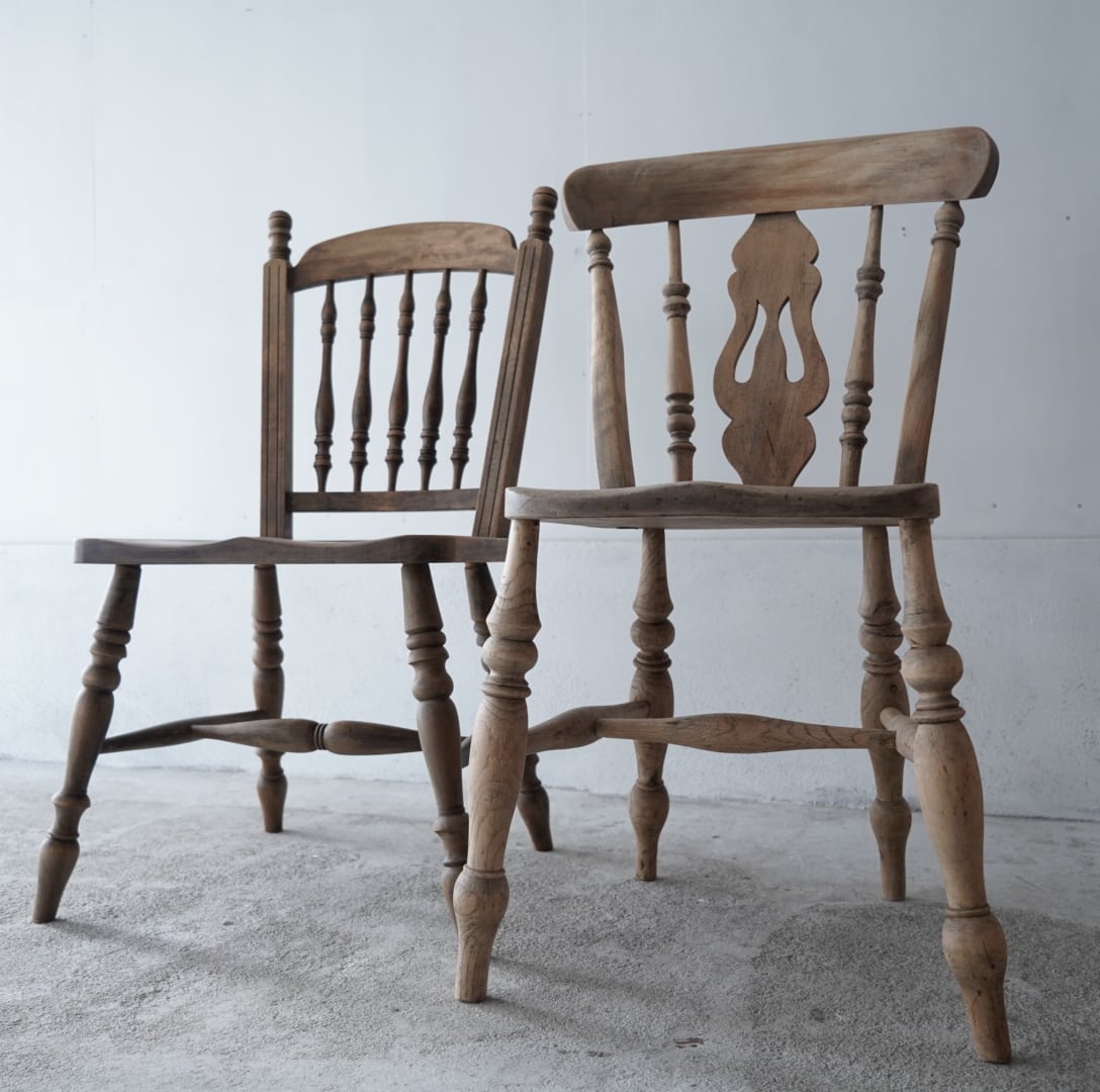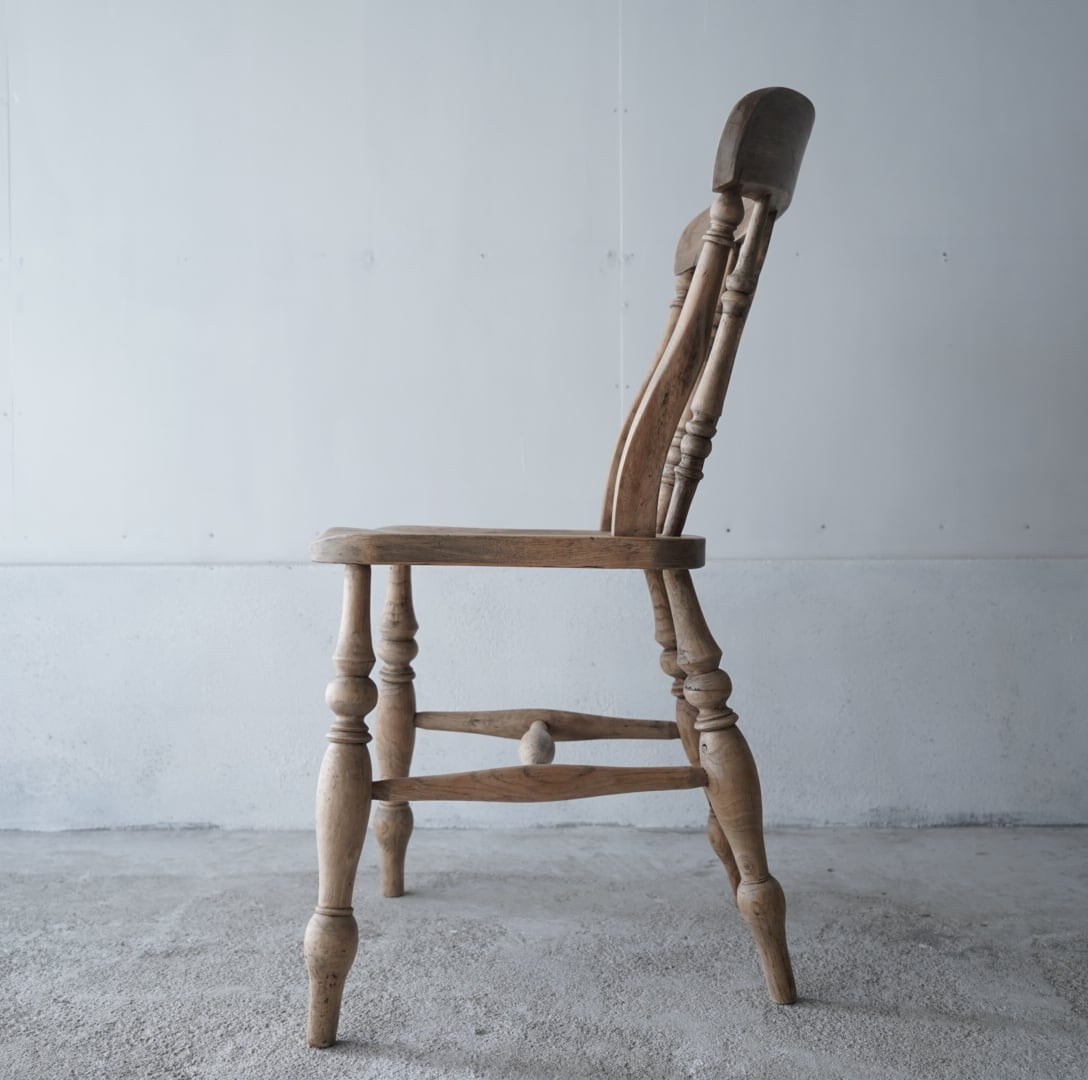 無垢材のナチュラルな木味と背もたれにあしらわれた弦楽器フィドルのモチーフが美しいアンティークチェア。