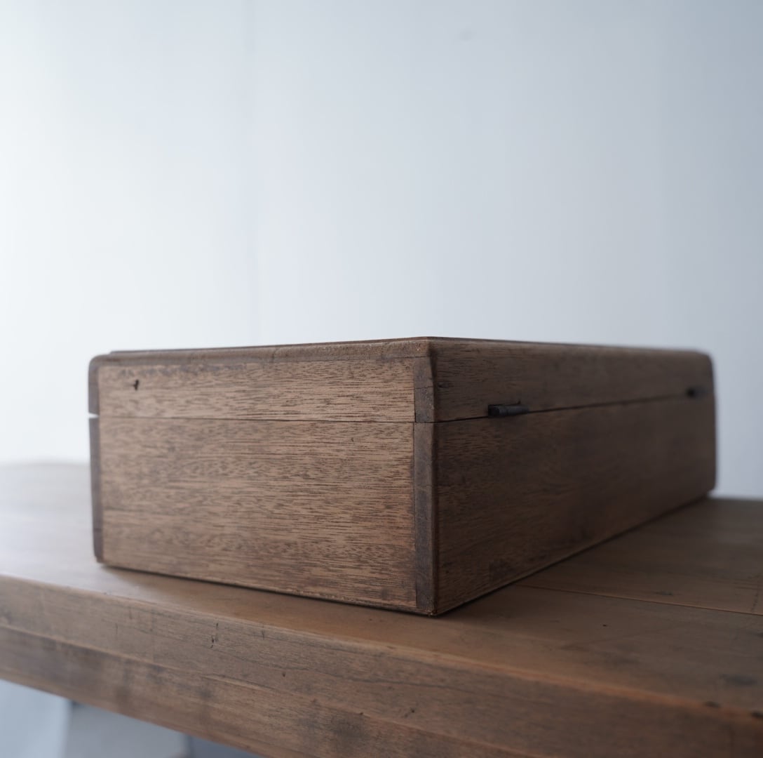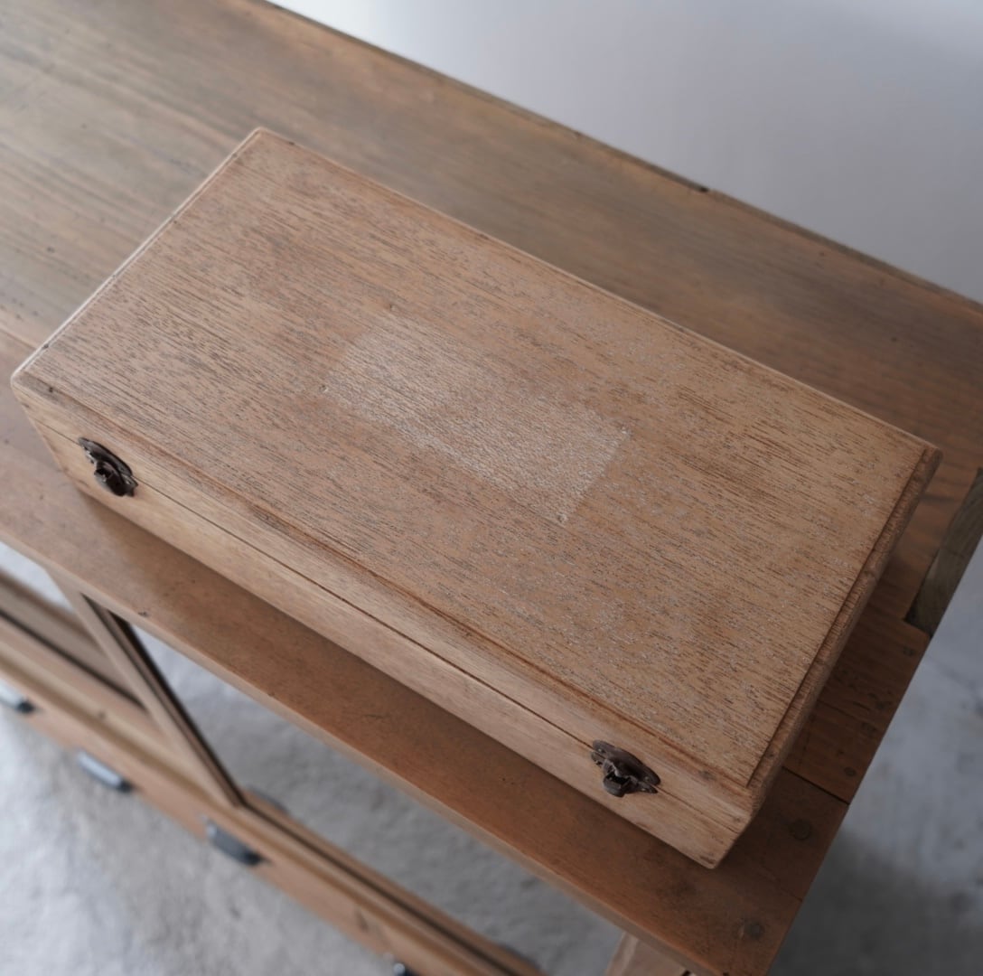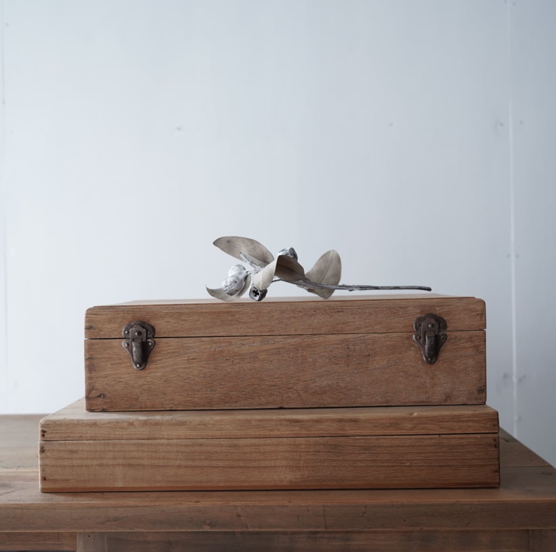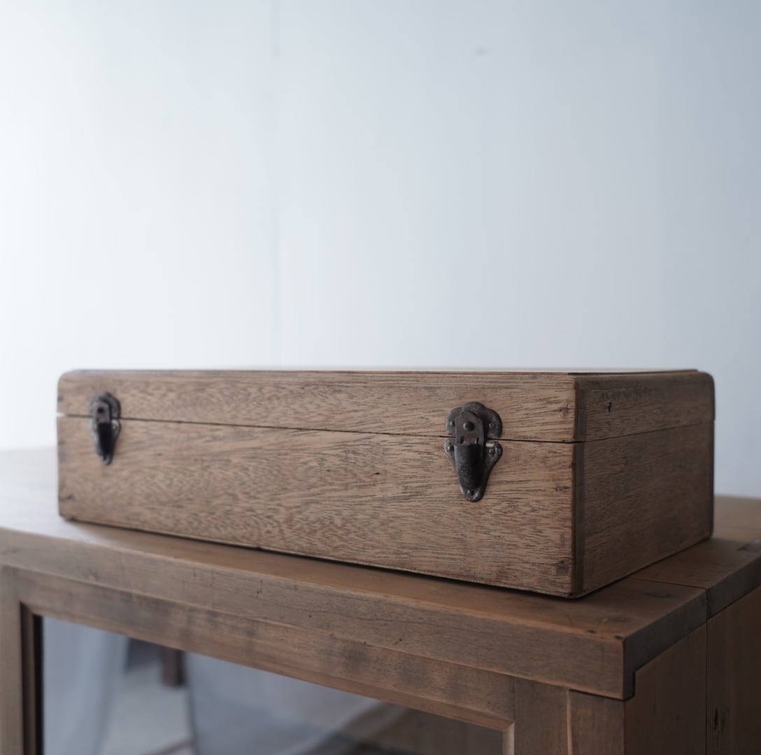 無垢材の素朴な風合いと経年変化のある金具が可愛らしい木箱。