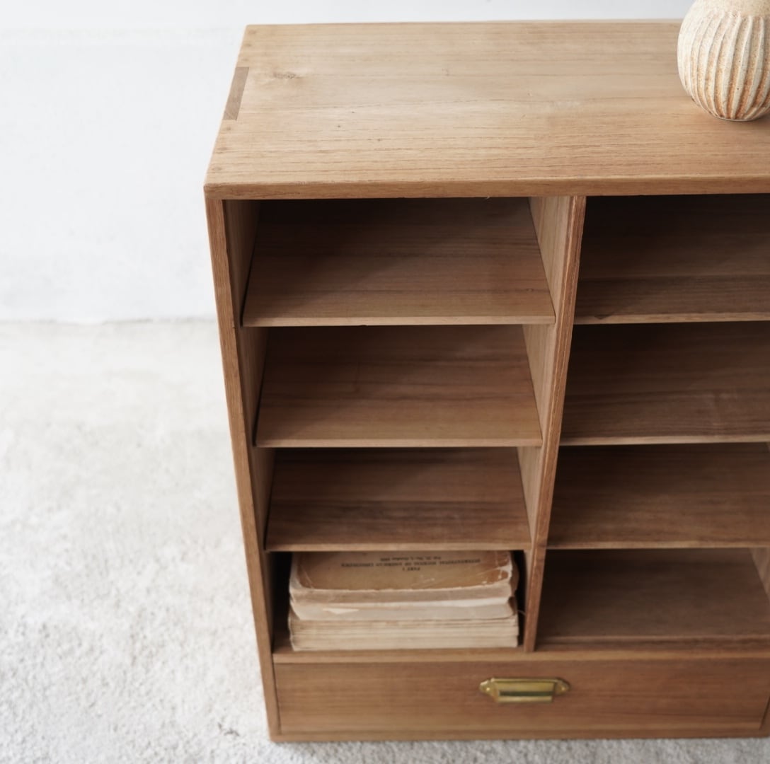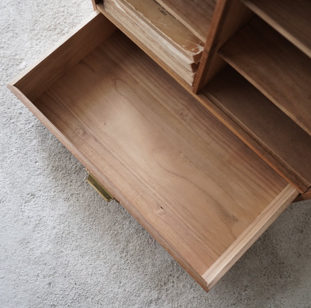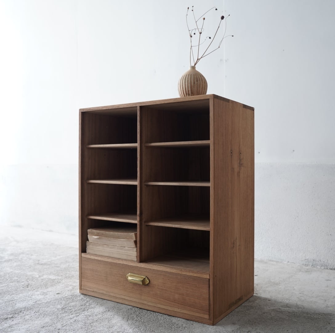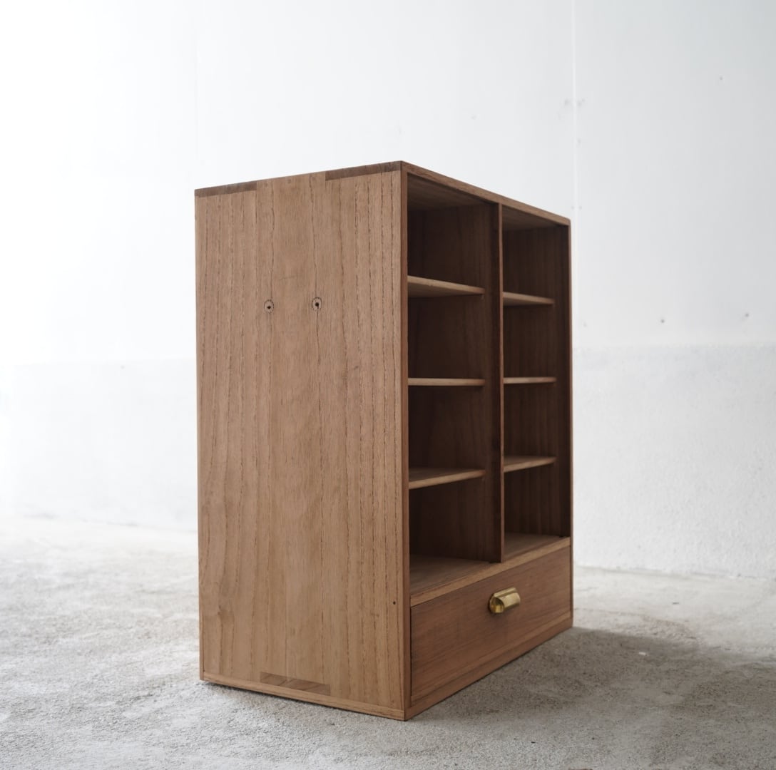 無垢材のナチュラルな木味と真鍮取手の引き出しが魅力的な木製棚。