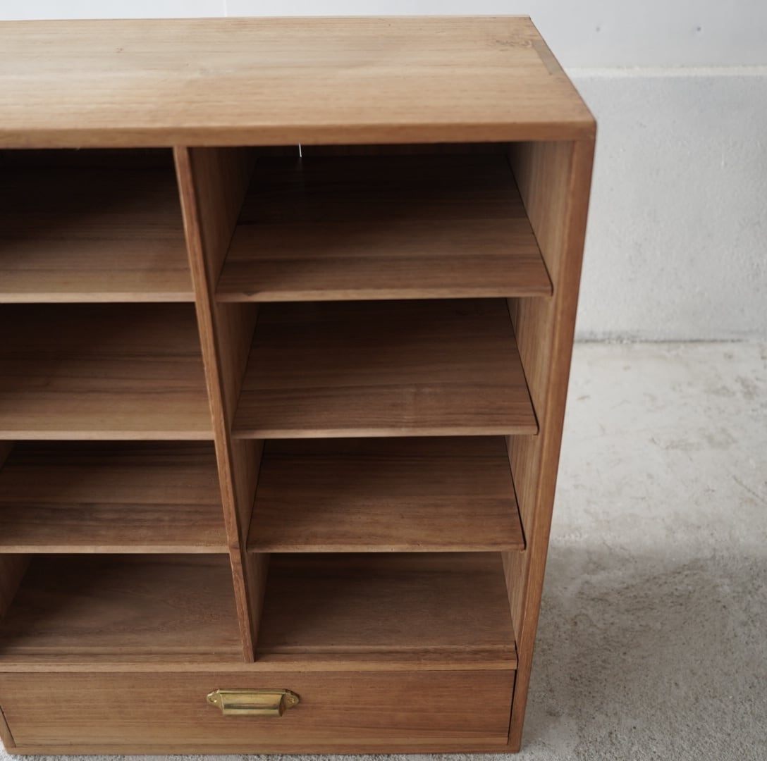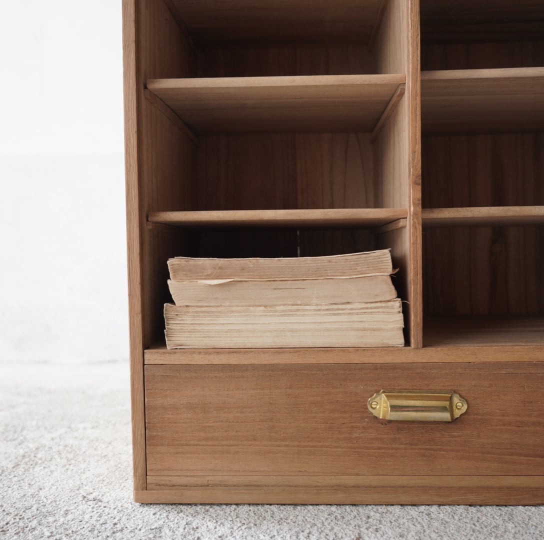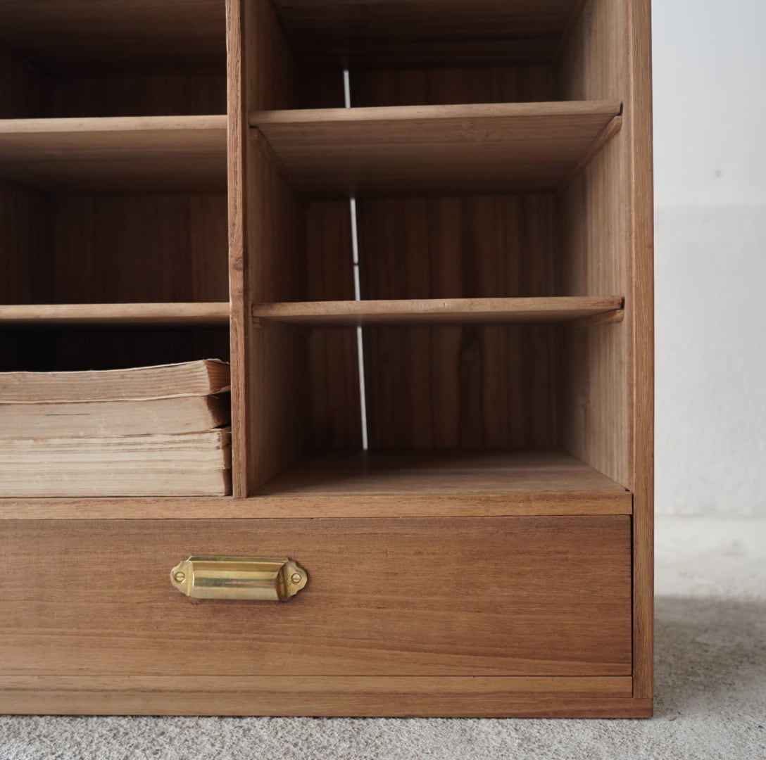 無垢材のナチュラルな木味と真鍮取手の引き出しが魅力的な木製棚。