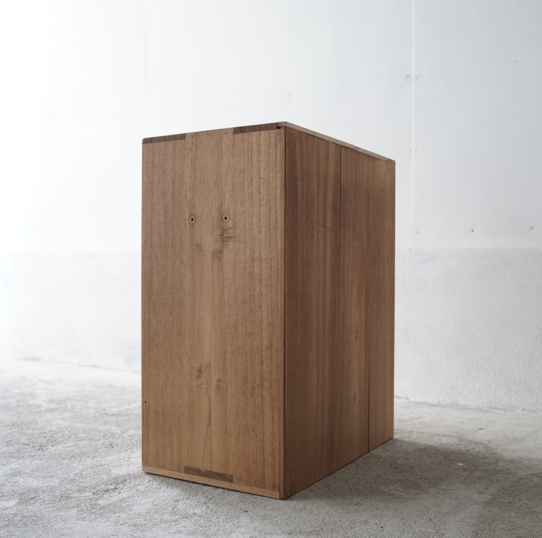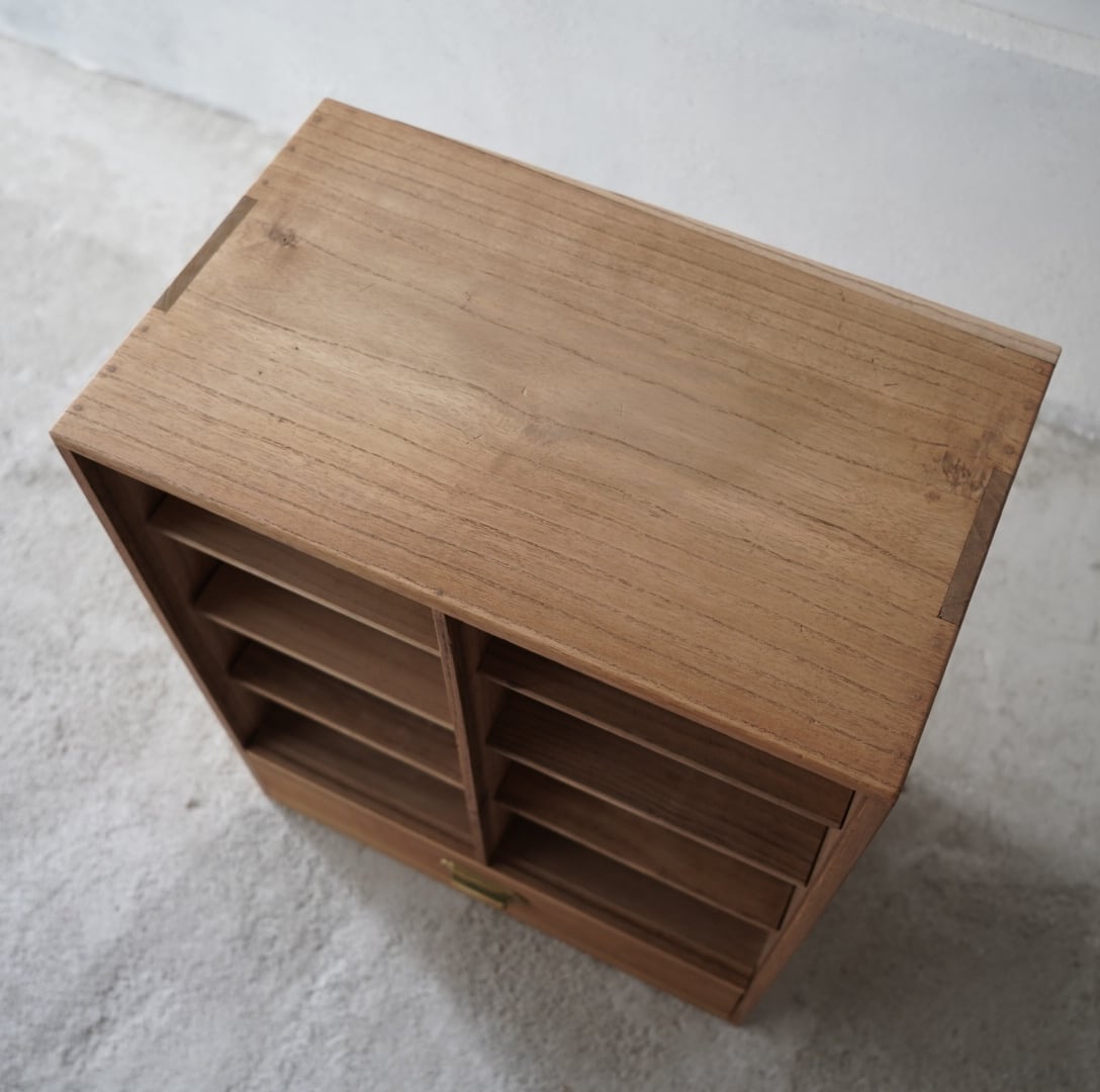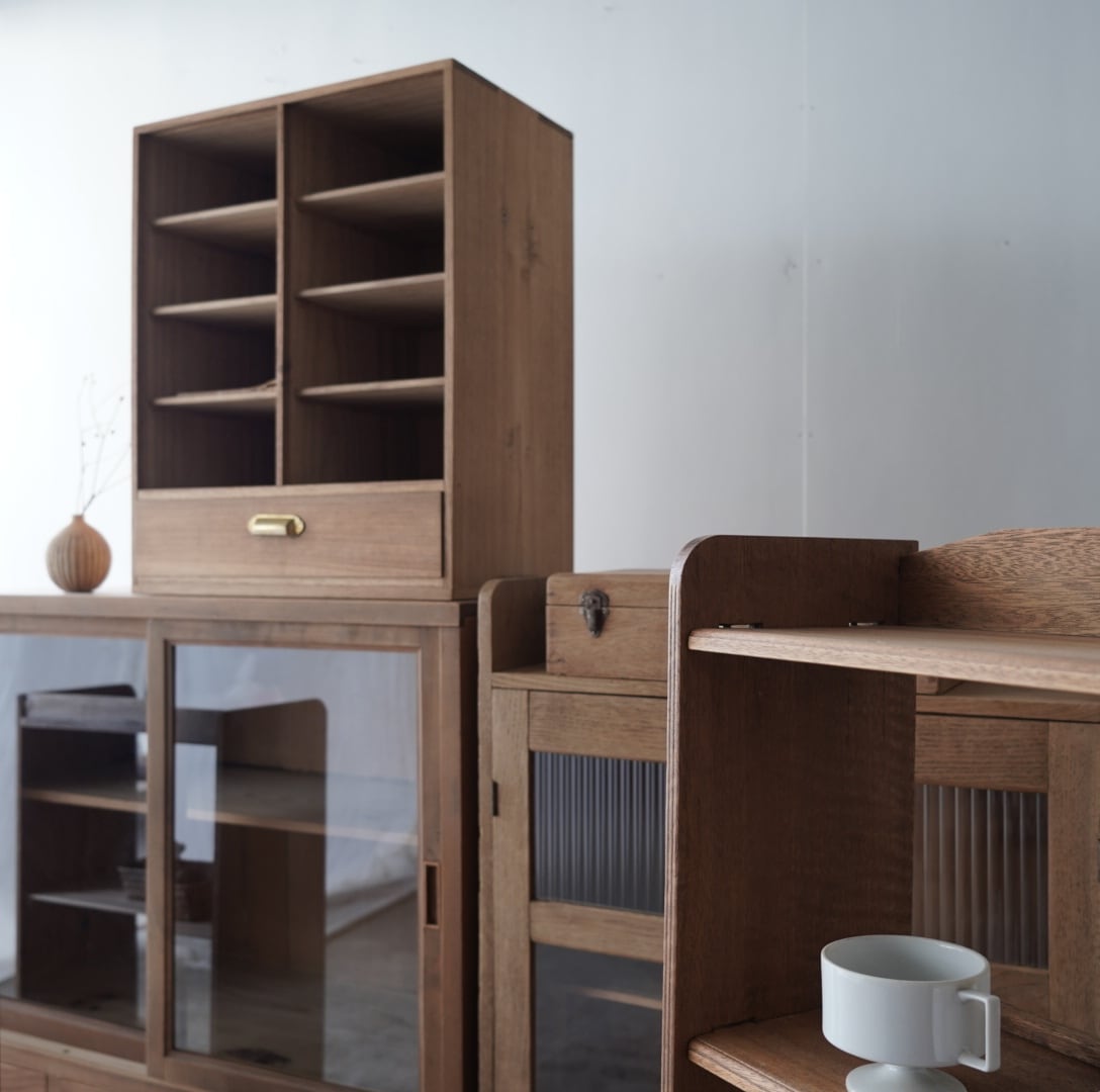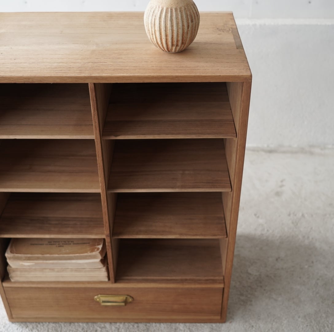 無垢材のナチュラルな木味と真鍮取手の引き出しが魅力的な木製棚。