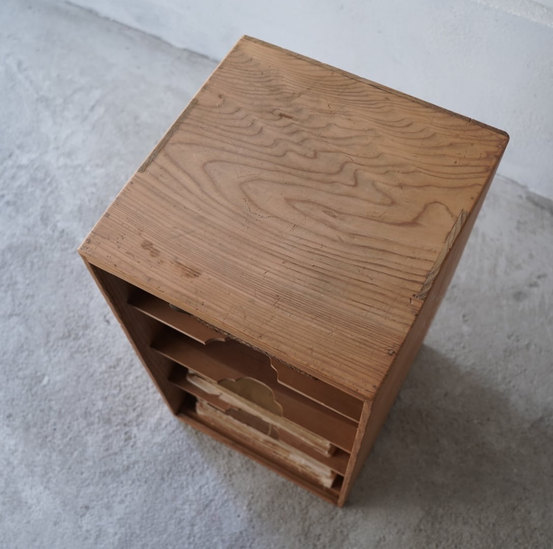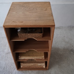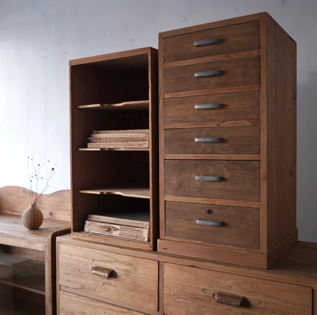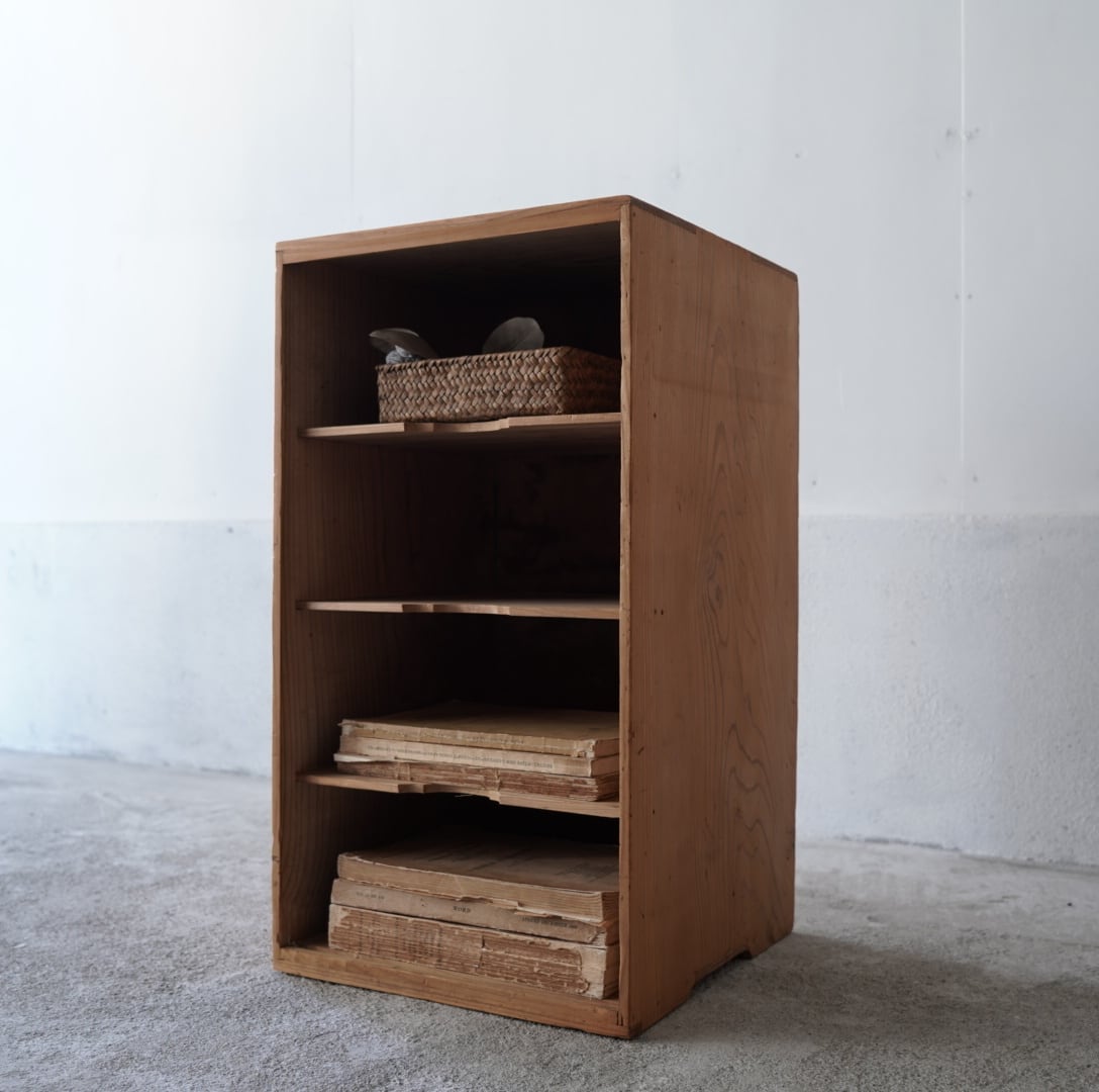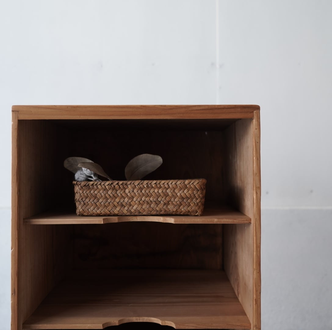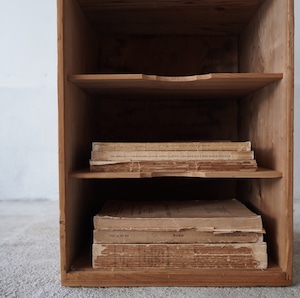 無垢材の素朴な風合いが魅力的な古い木製棚。