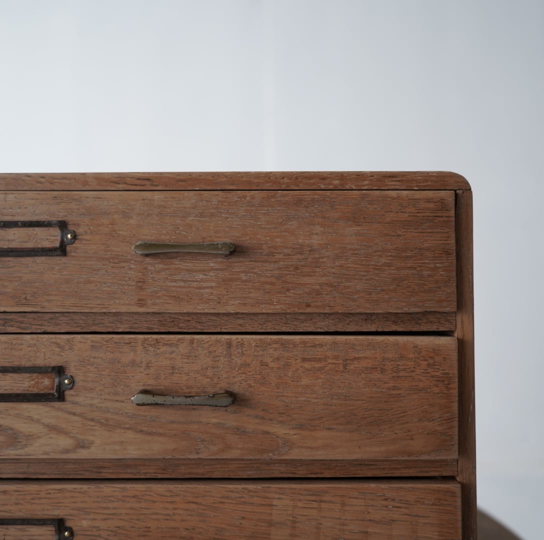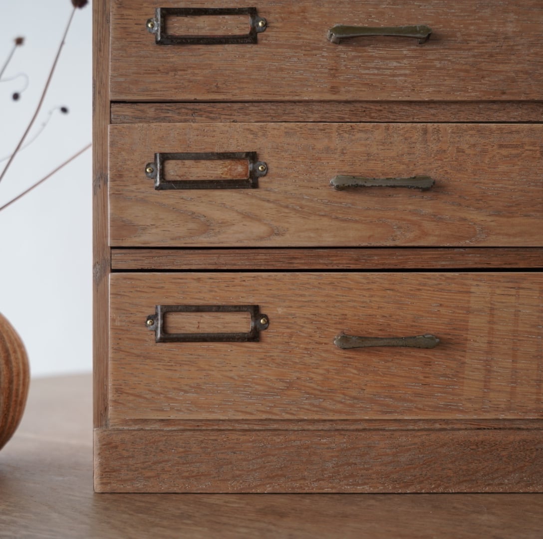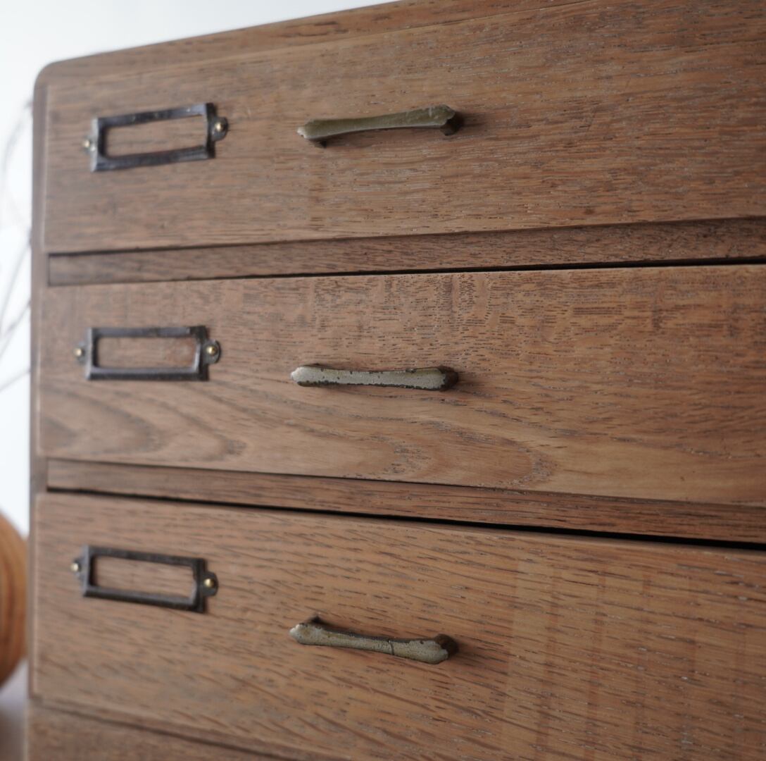 ナチュラルな木味、並んだ金属の取手とネームプレートが可愛らしい3杯の引き出し。