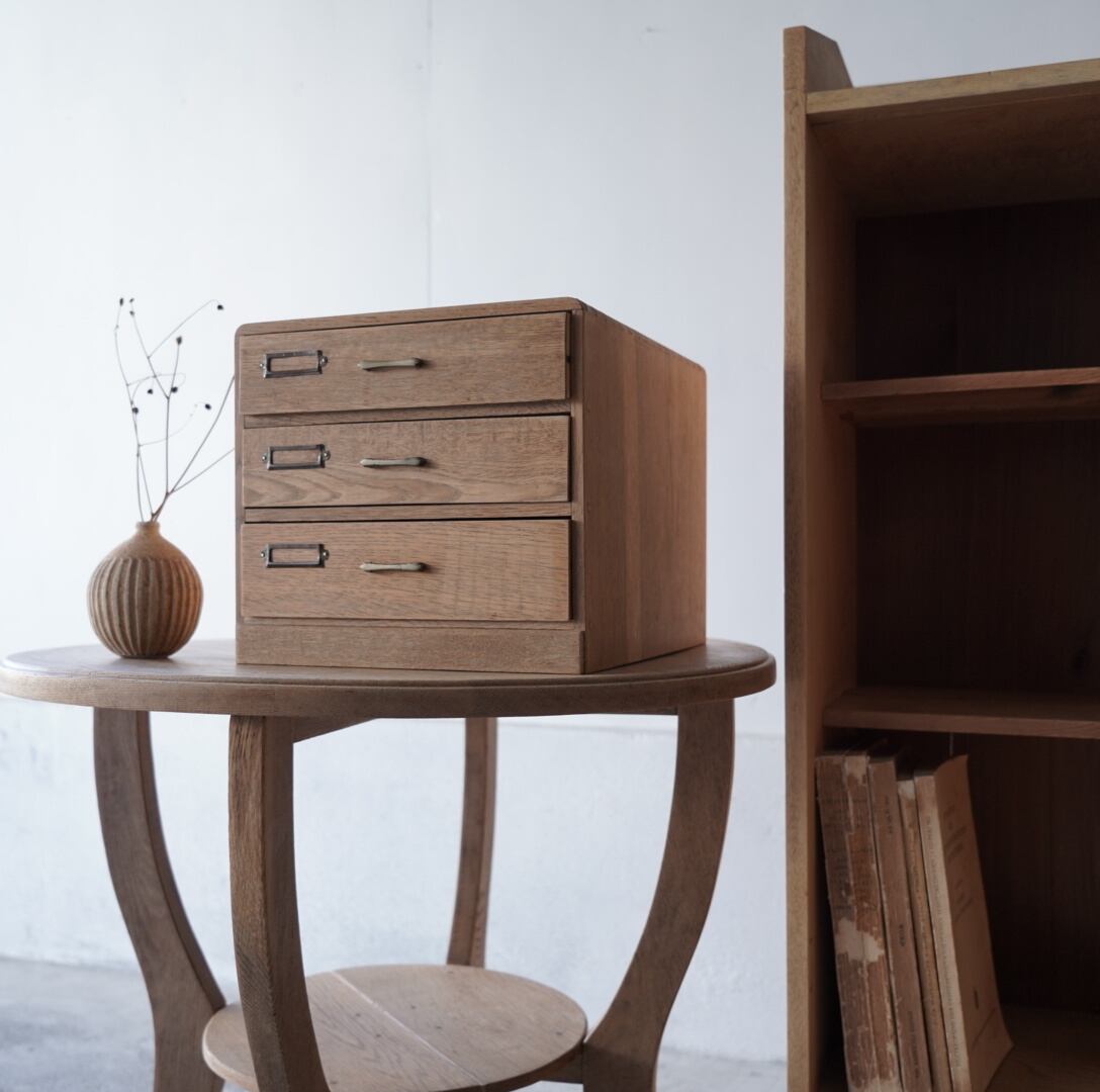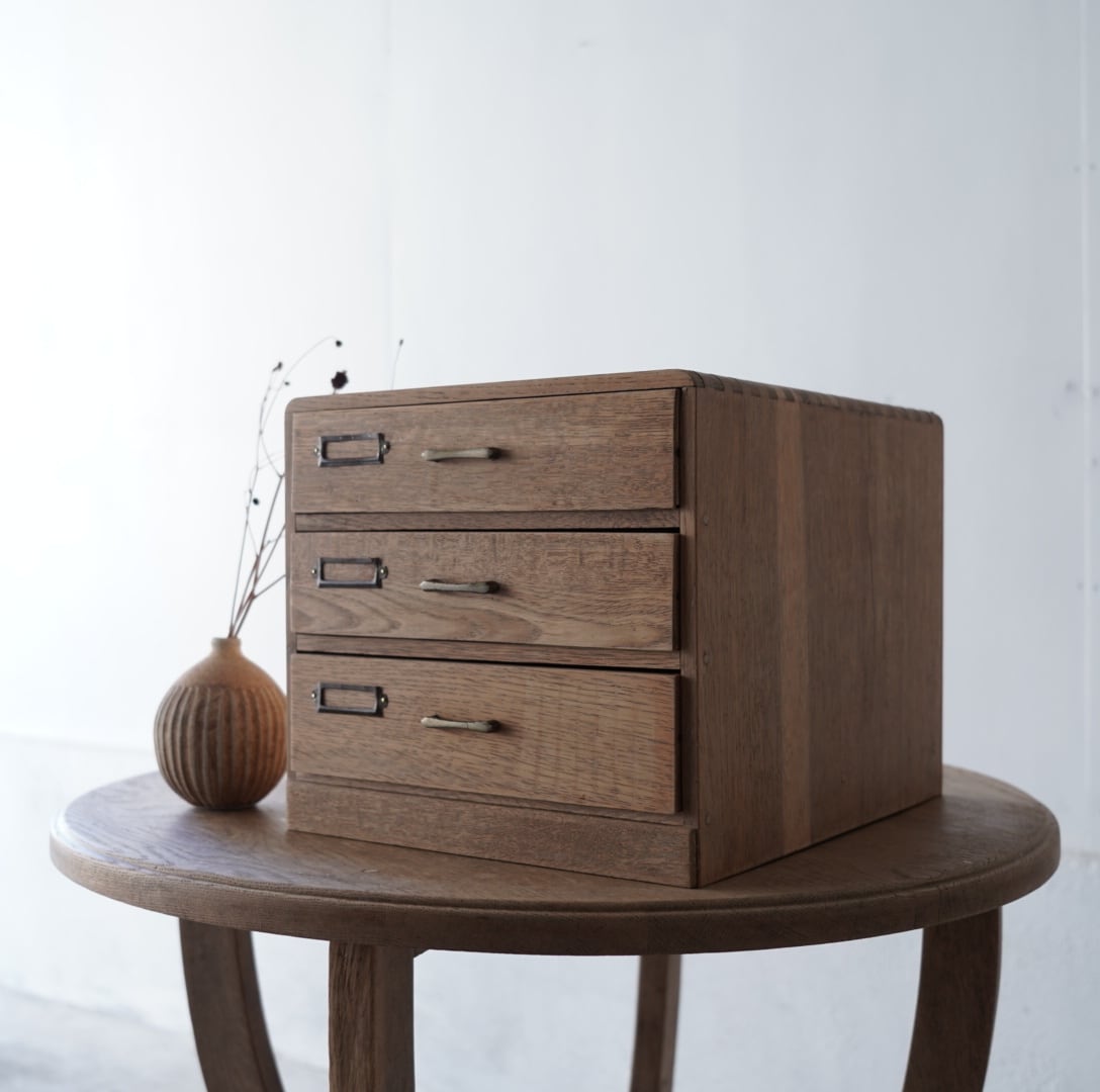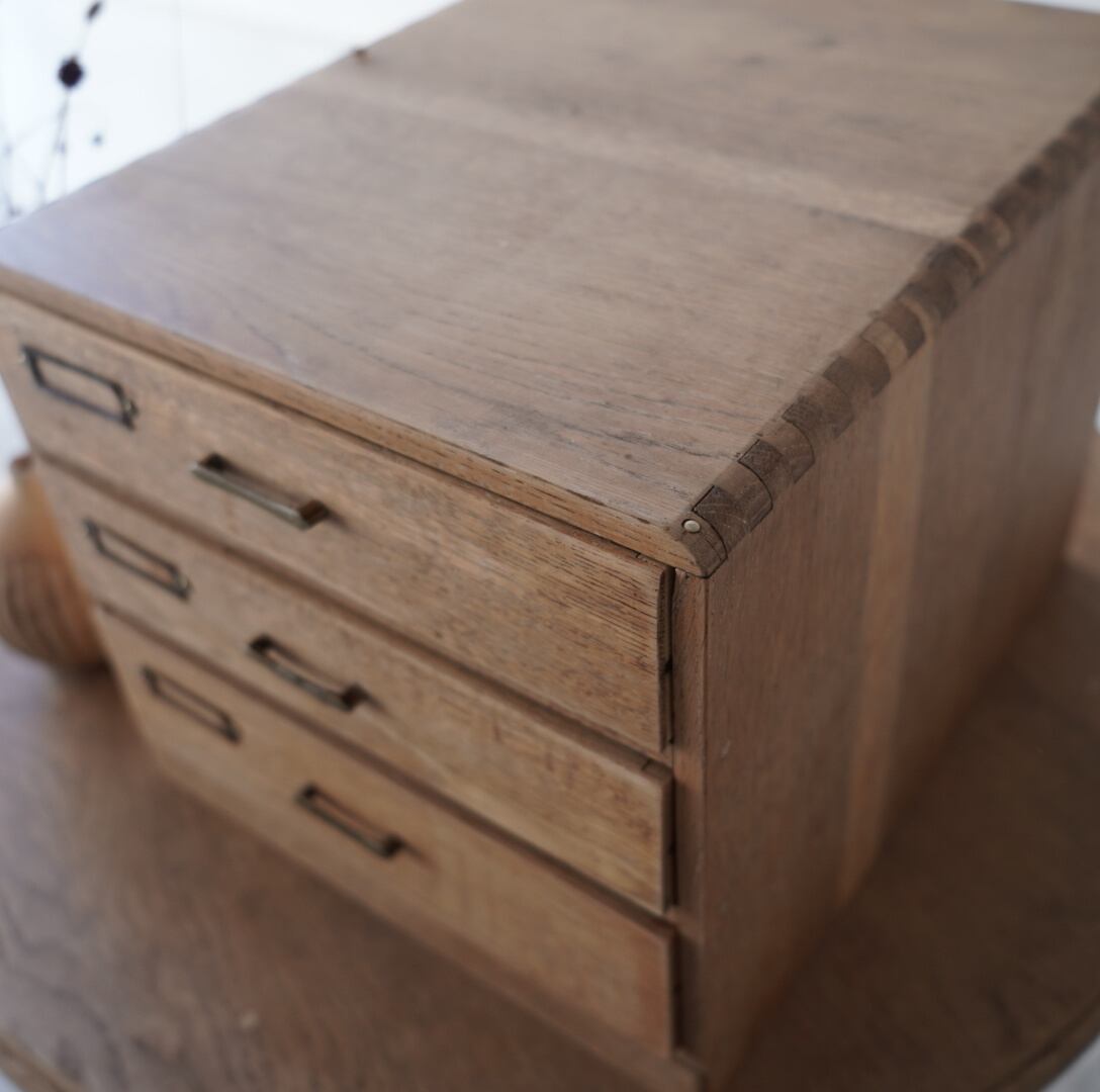 ナチュラルな木味、並んだ金属の取手とネームプレートが可愛らしい3杯の引き出し。