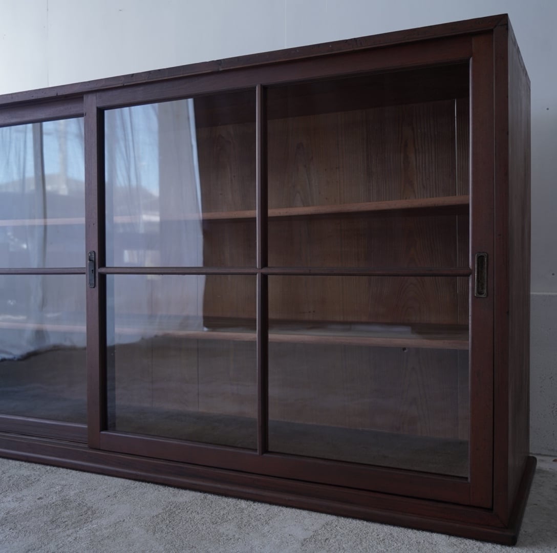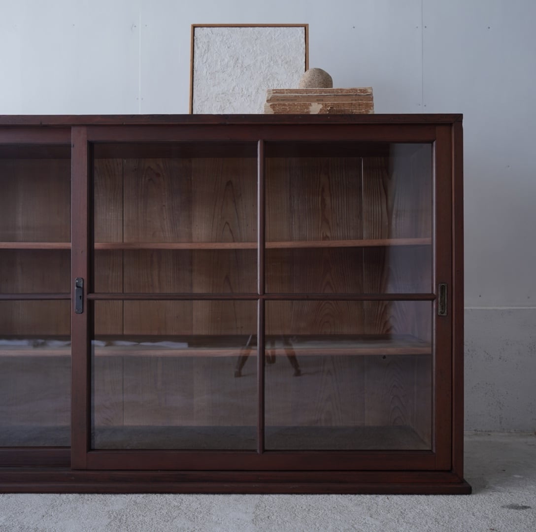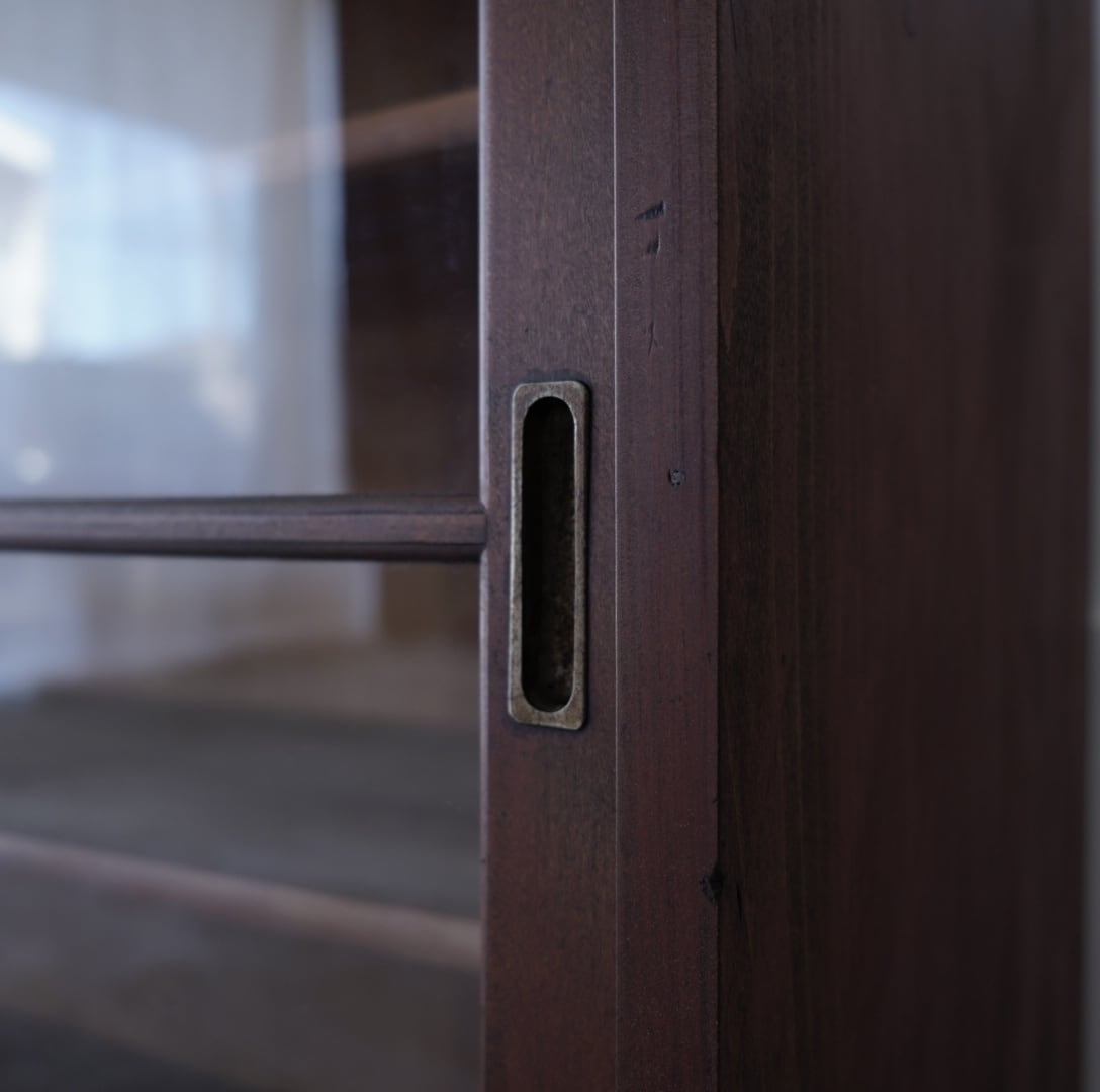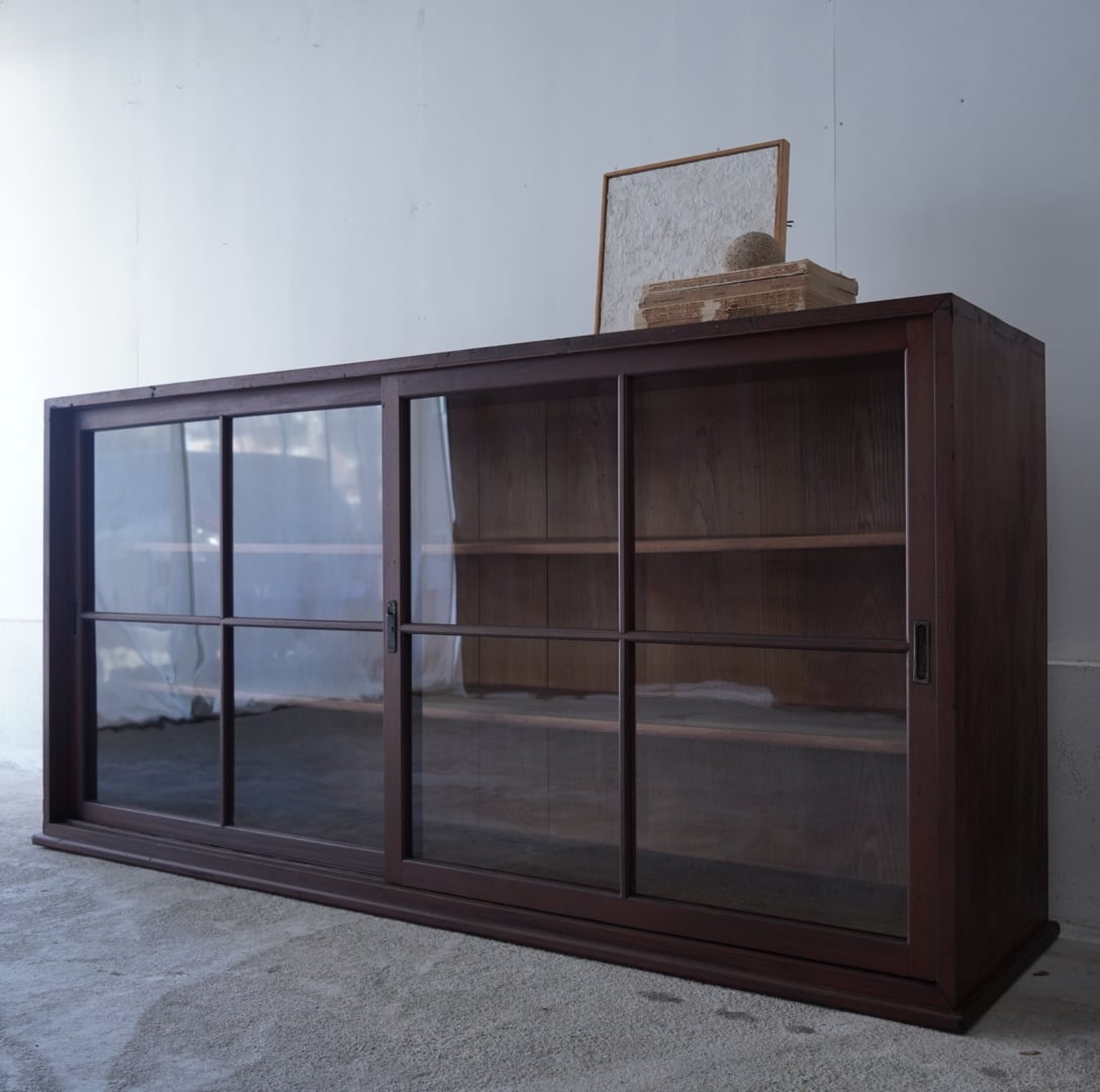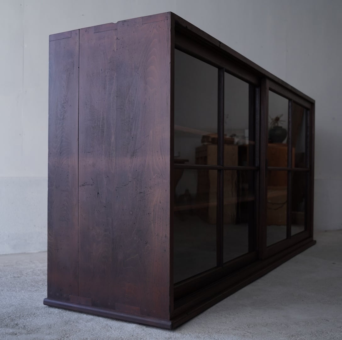 深みのある木味と大きな十字ガラスの引き戸が美しいキャビネット。