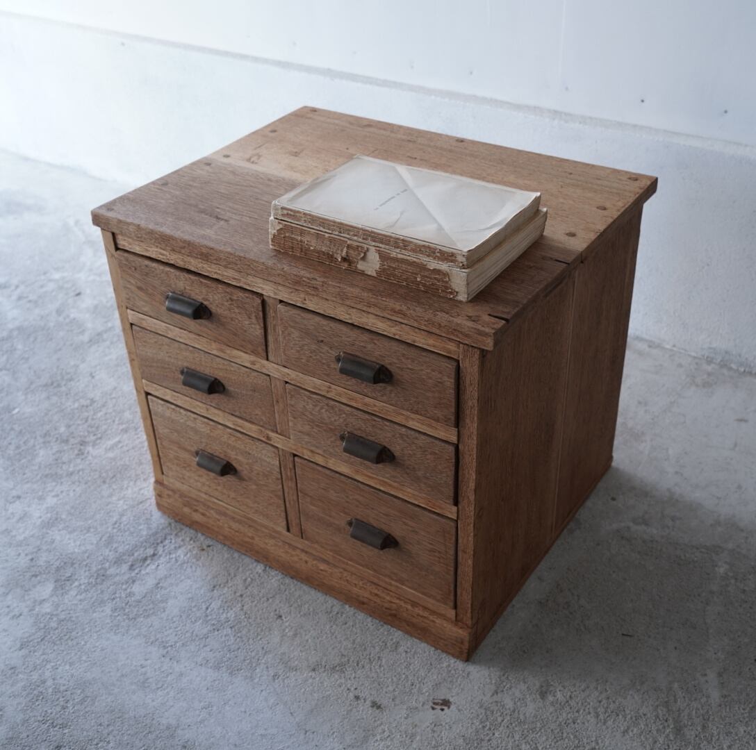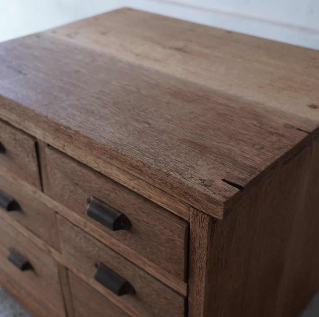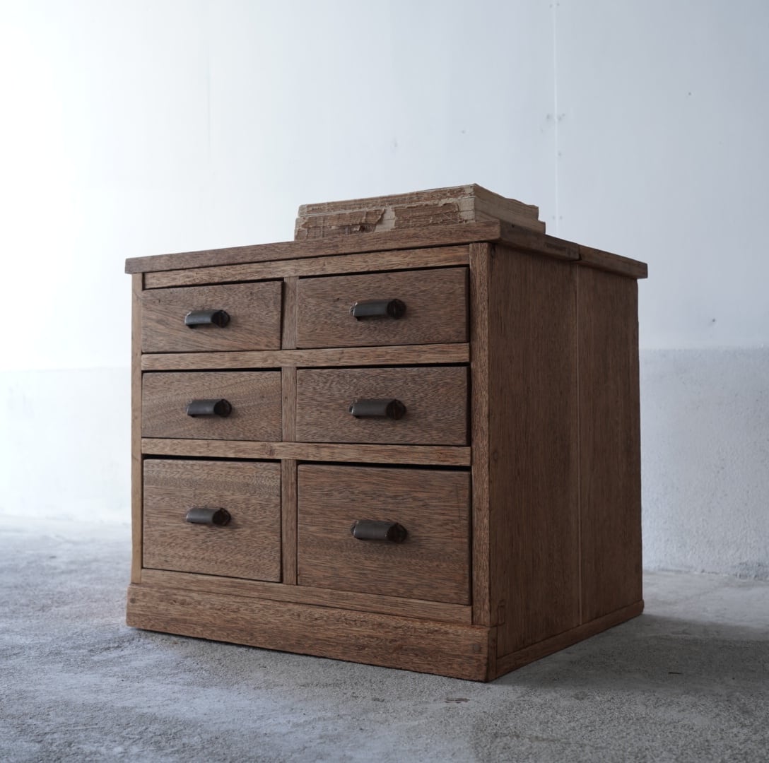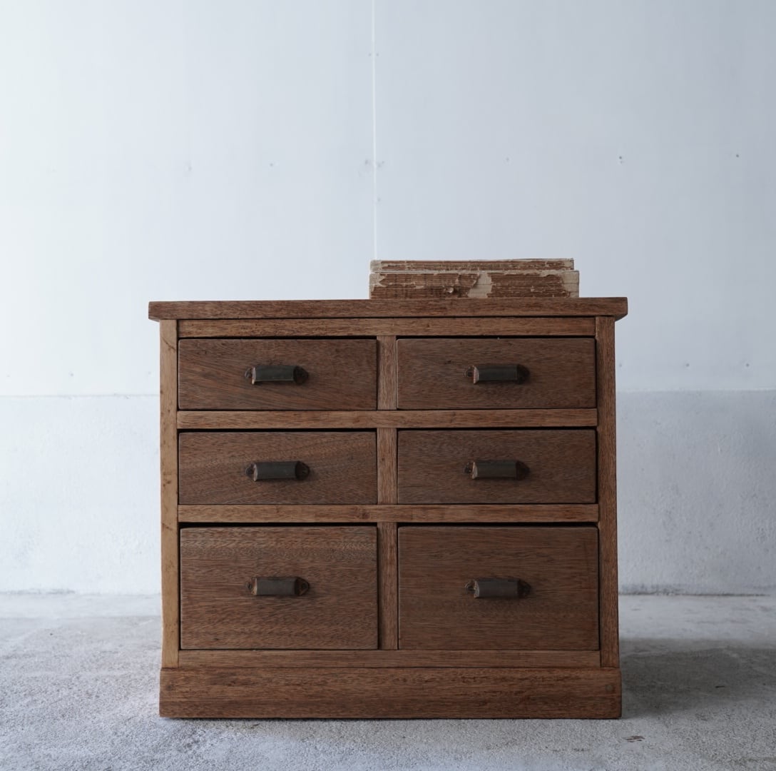 無垢材の温かみのある木味と並んだ真鍮取手が美しい6杯の引き出し。