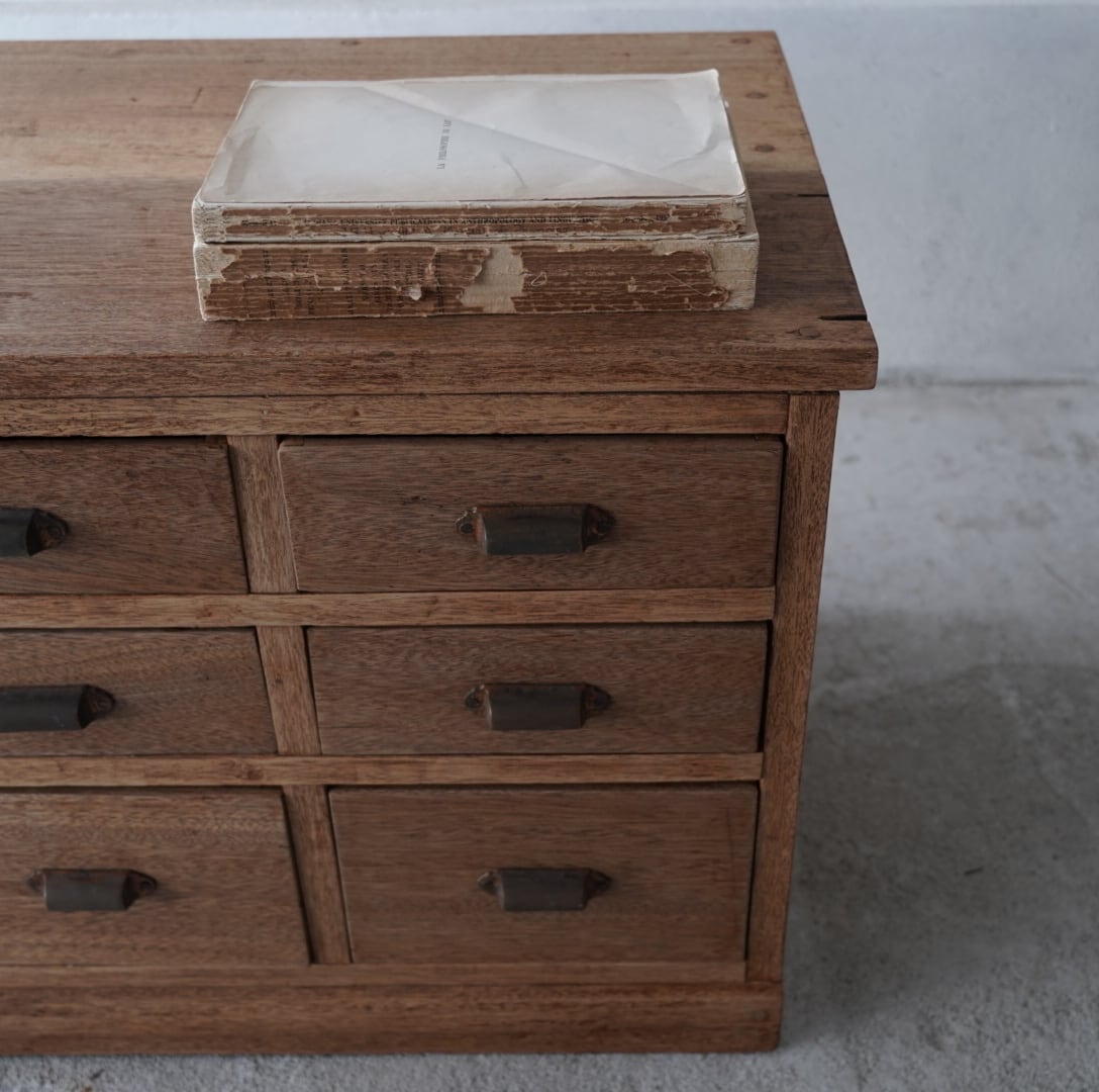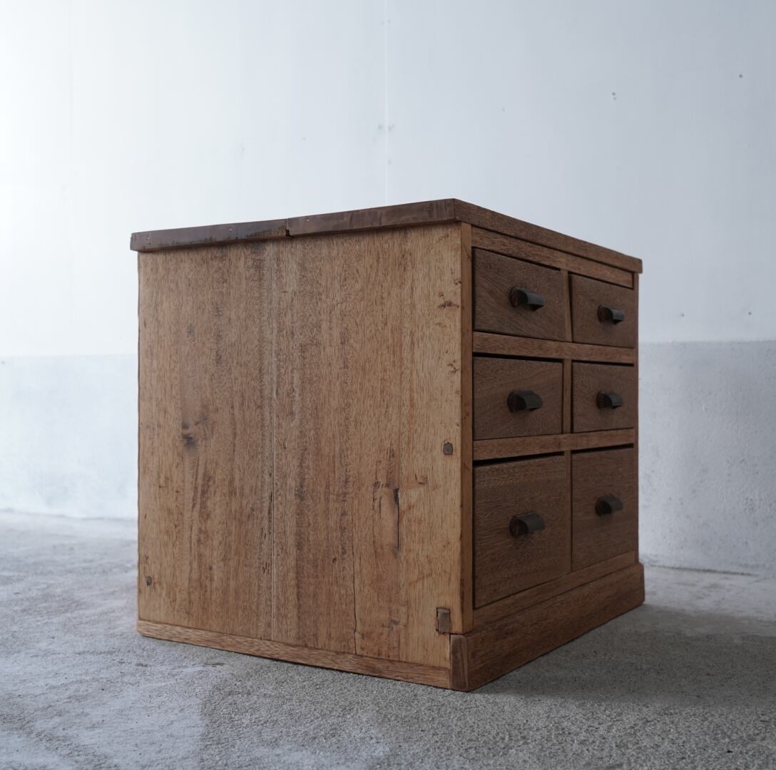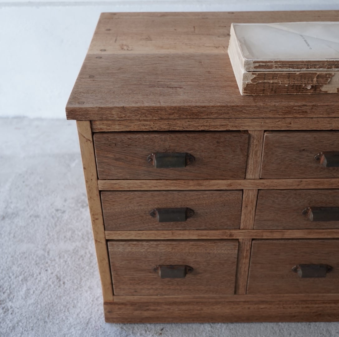 無垢材の温かみのある木味と並んだ真鍮取手が美しい6杯の引き出し。