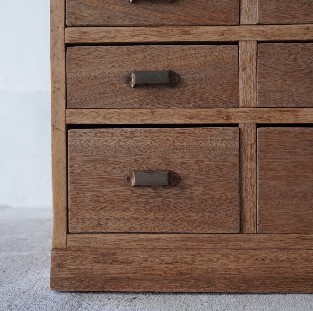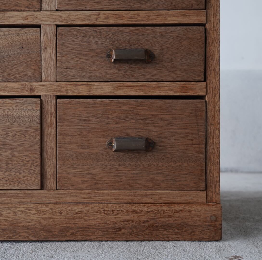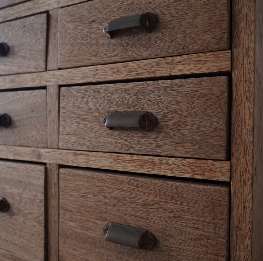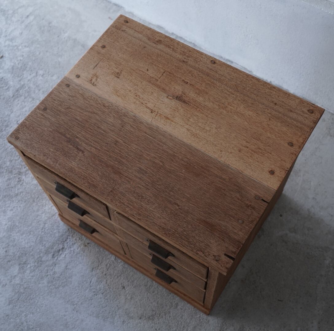 無垢材の温かみのある木味と並んだ真鍮取手が美しい6杯の引き出し。