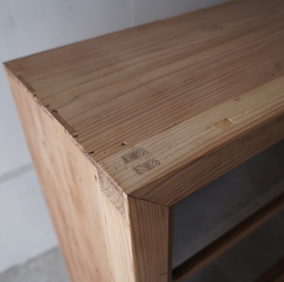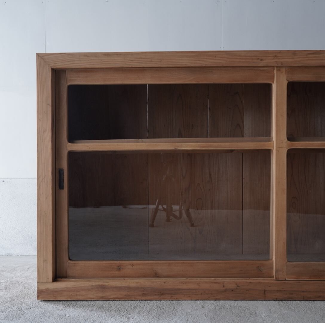 無垢材のナチュラルな木味と格子ガラスの引き戸が美しいキャビネット。