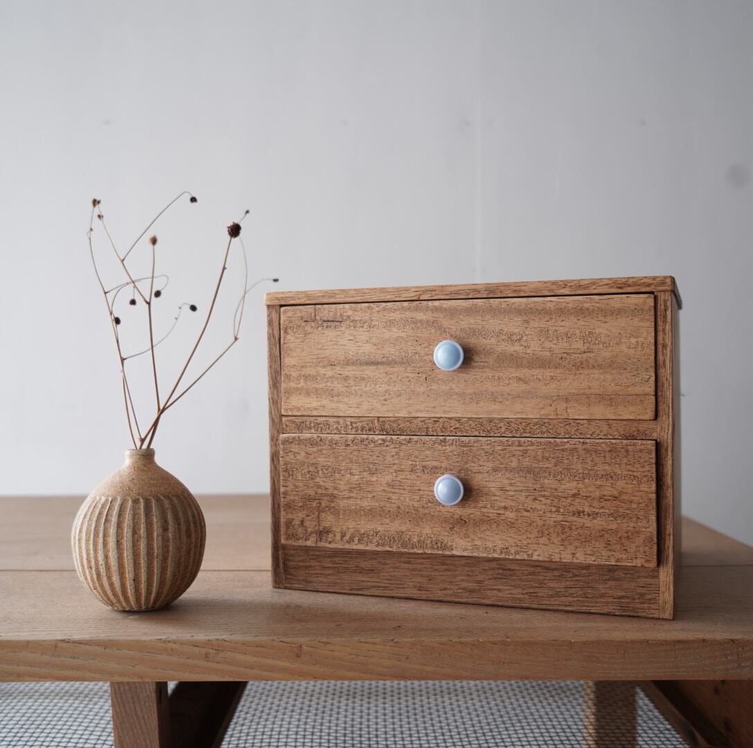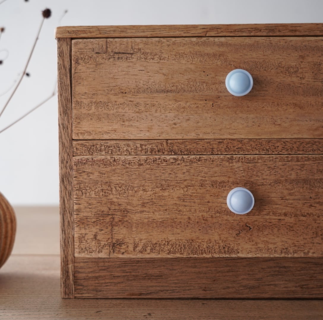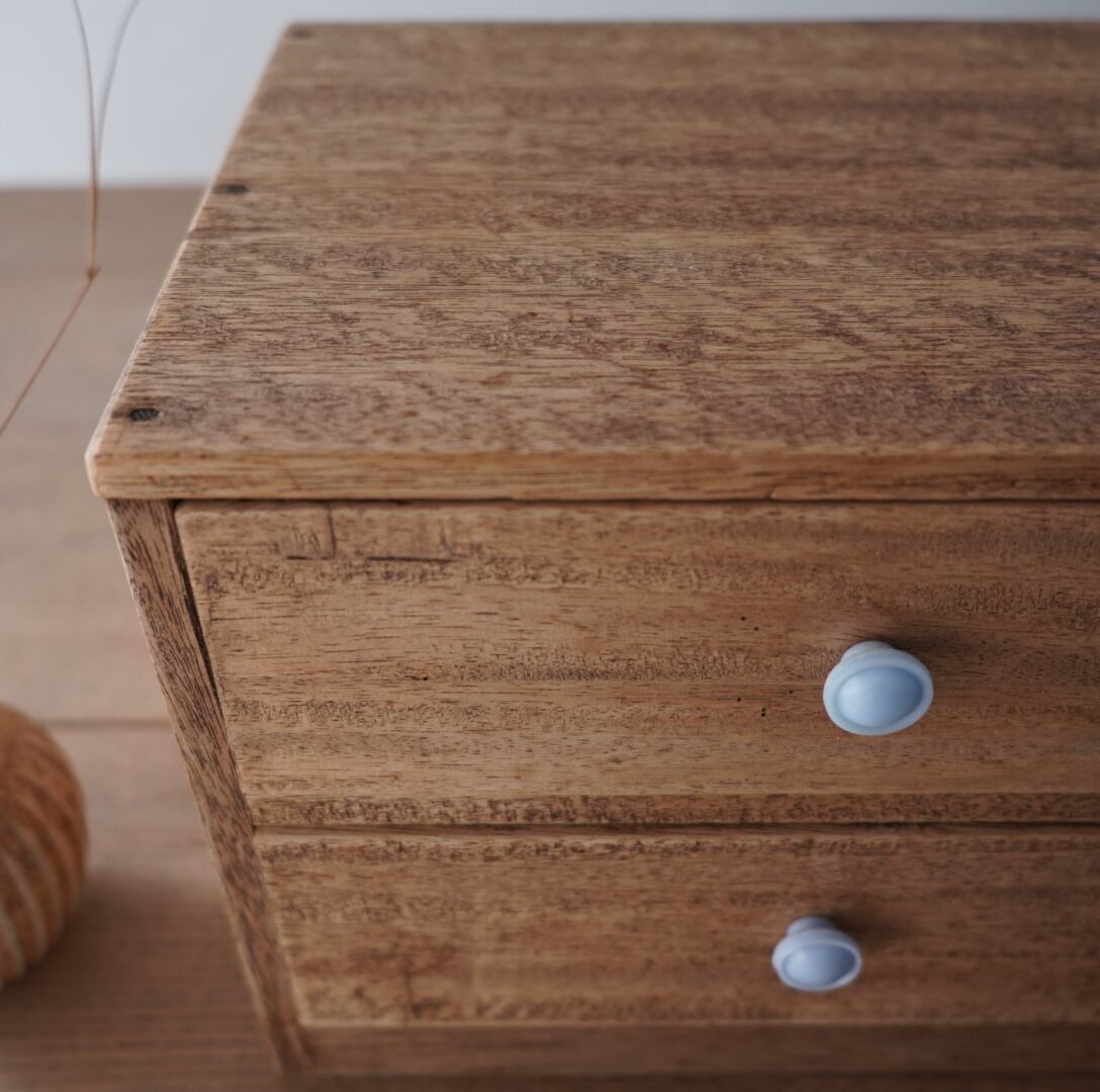 ナチュラルな木味と水色のつまみが可愛らしい2杯の引き出し。