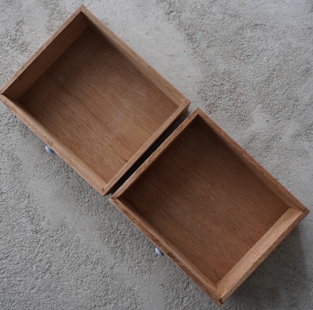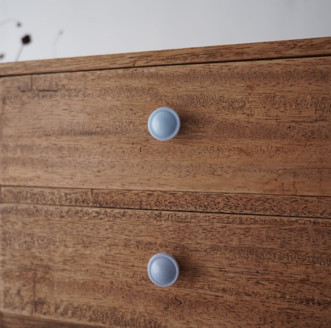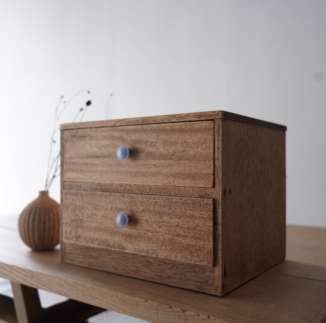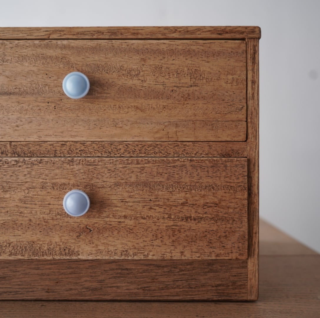 ナチュラルな木味と水色のつまみが可愛らしい2杯の引き出し。