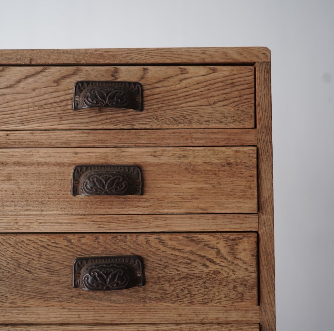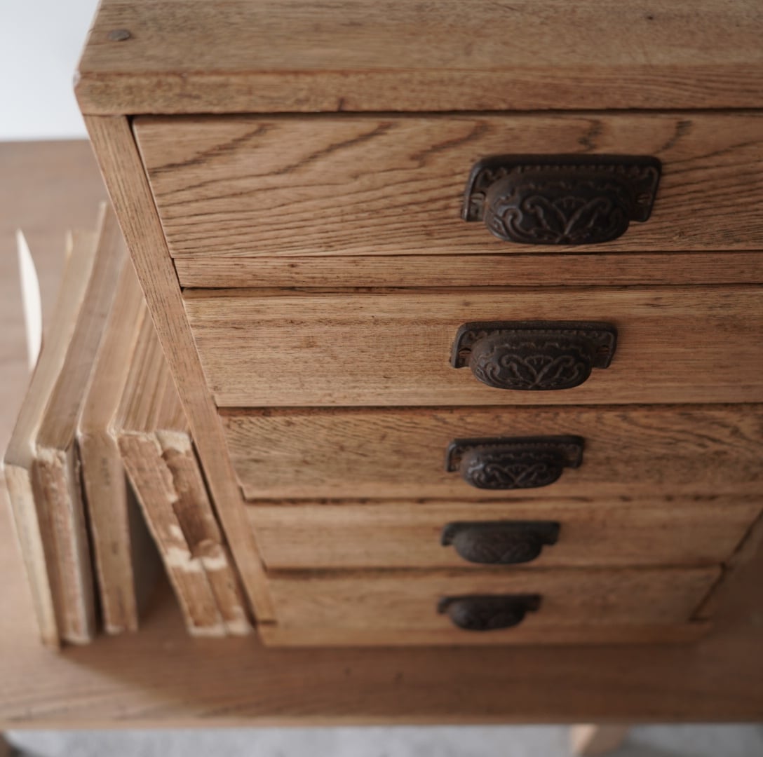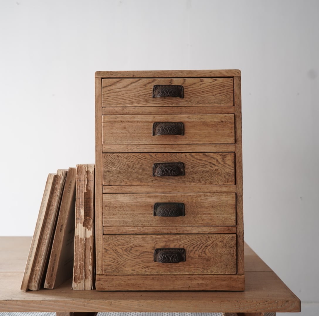 温かみのある木味と黒い金属の装飾取手が魅力的な5杯の引き出し。