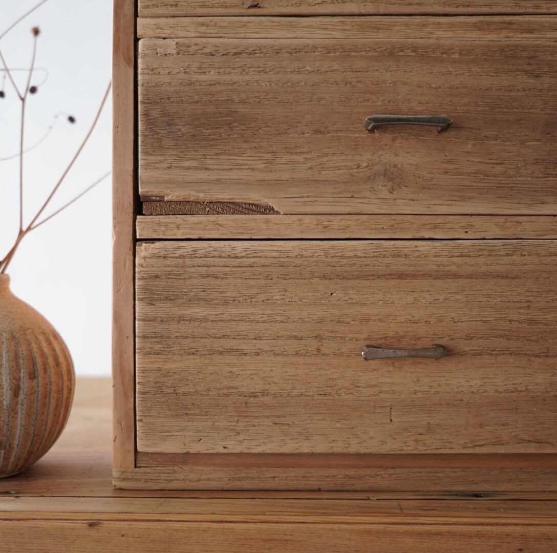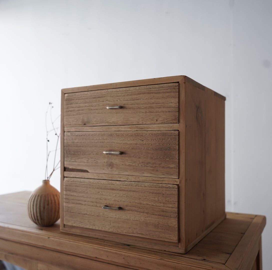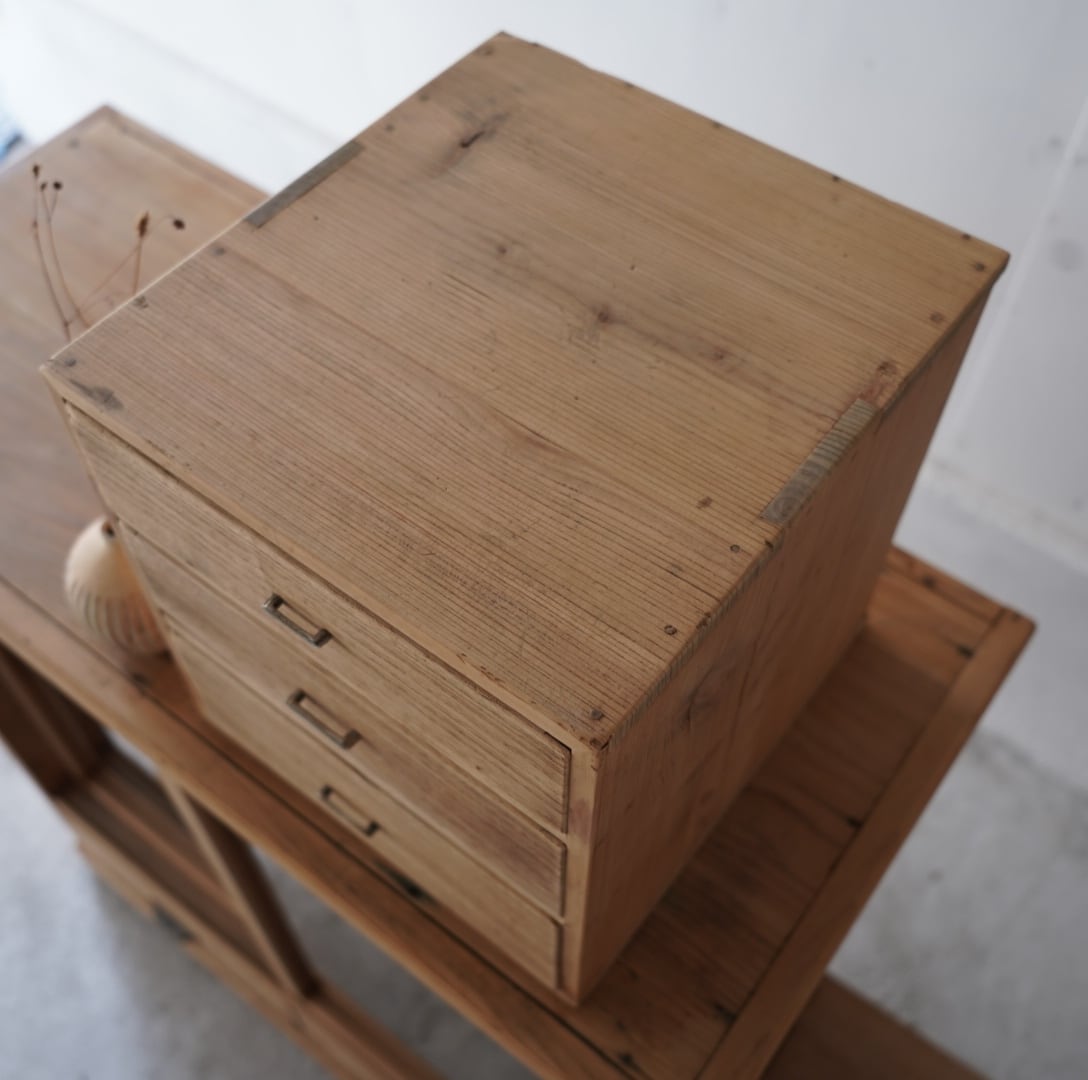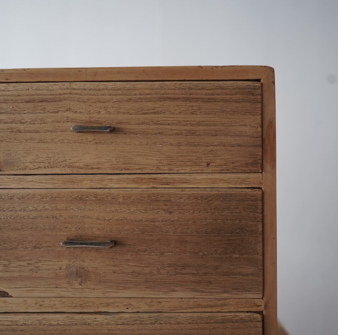 古い無垢材の素朴な風合いと金属の小さなつまみが可愛らしい3杯の引き出し。