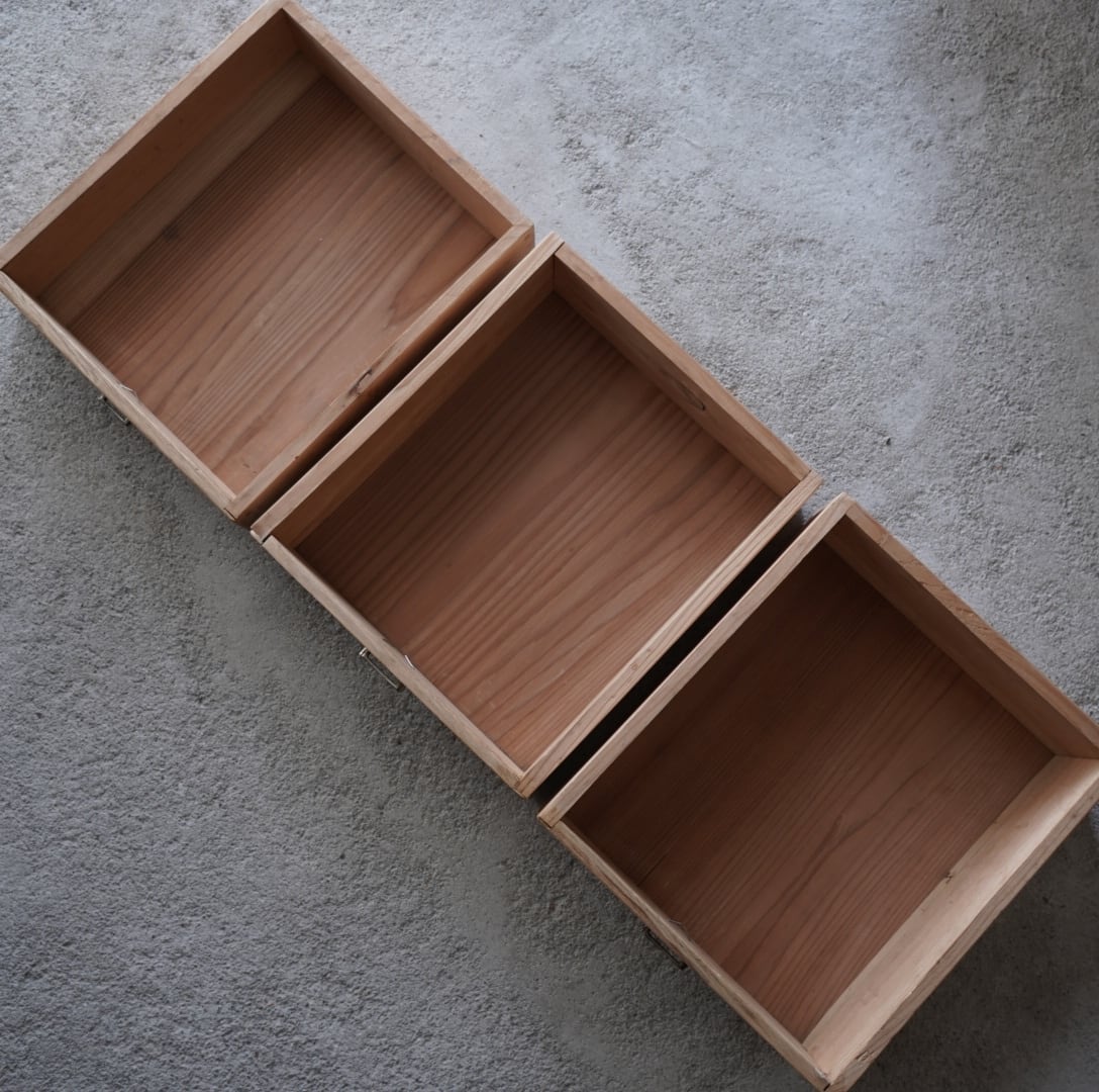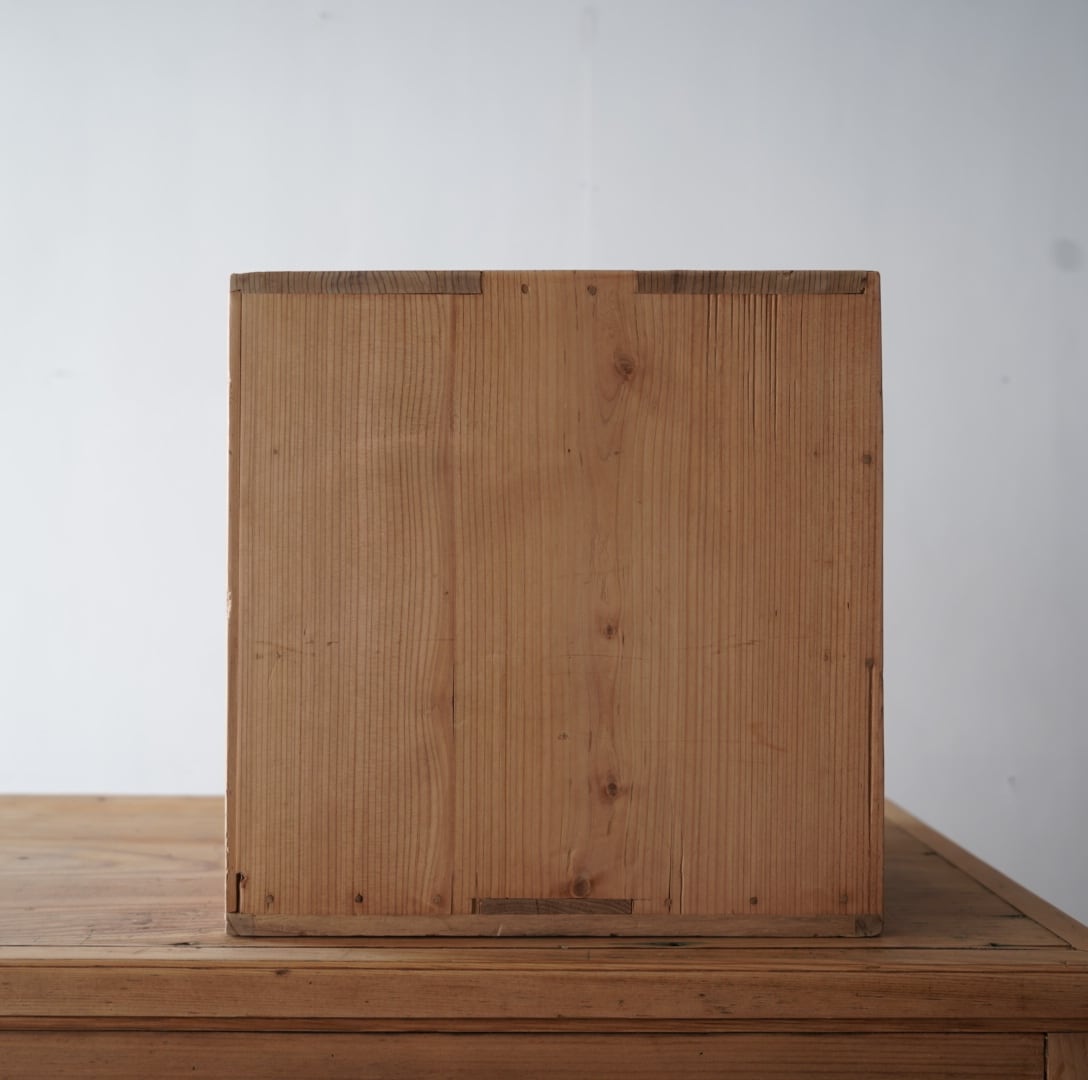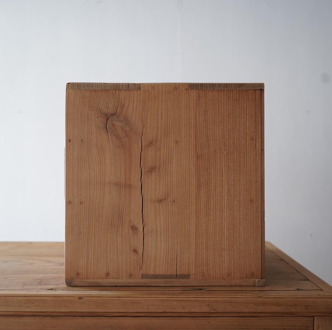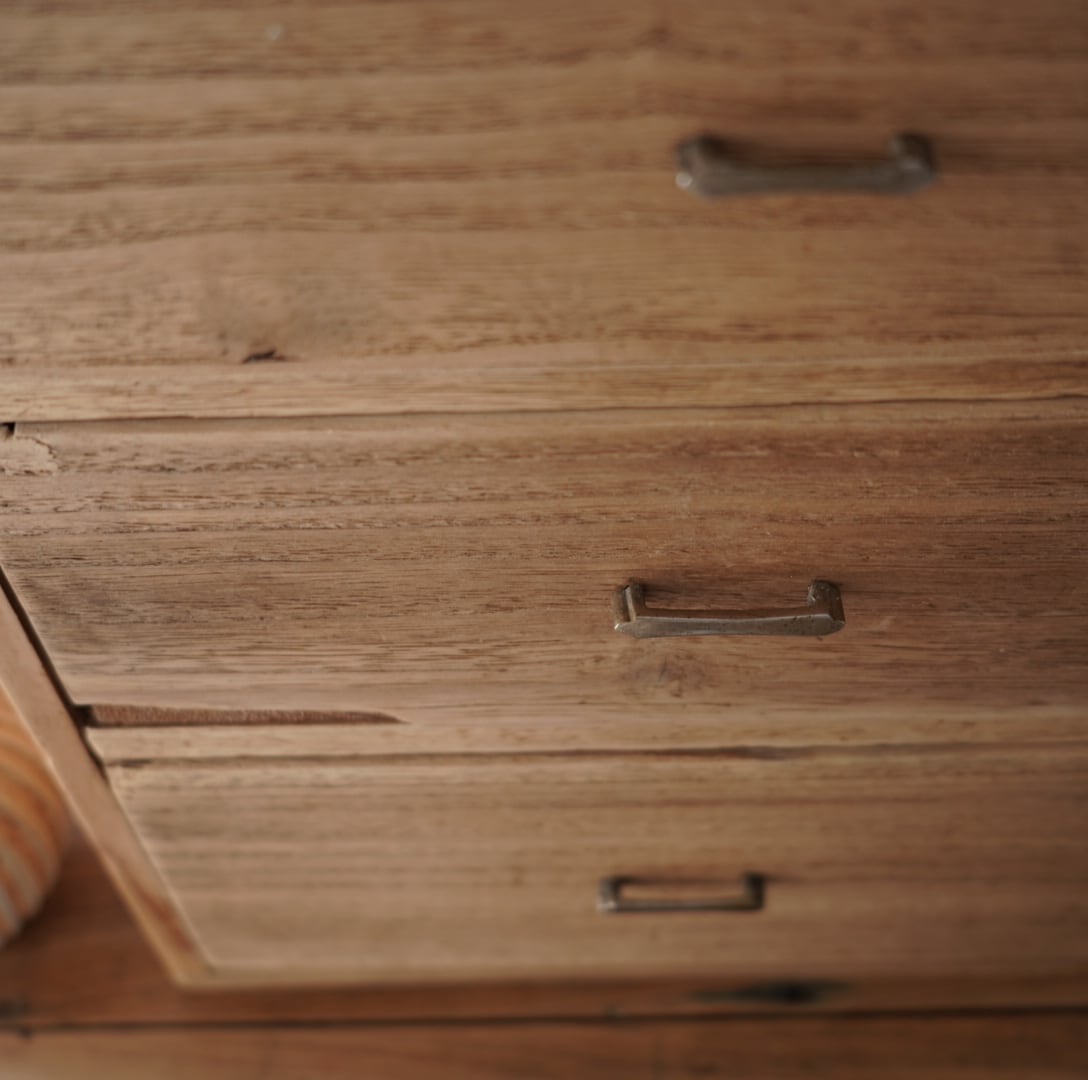 古い無垢材の素朴な風合いと金属の小さなつまみが可愛らしい3杯の引き出し。