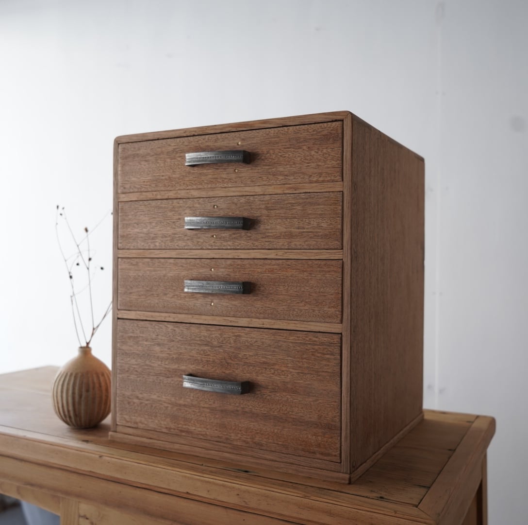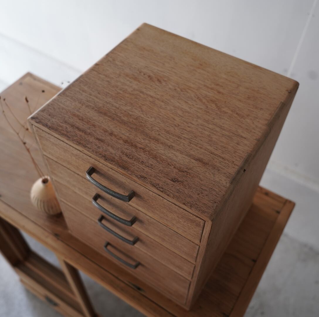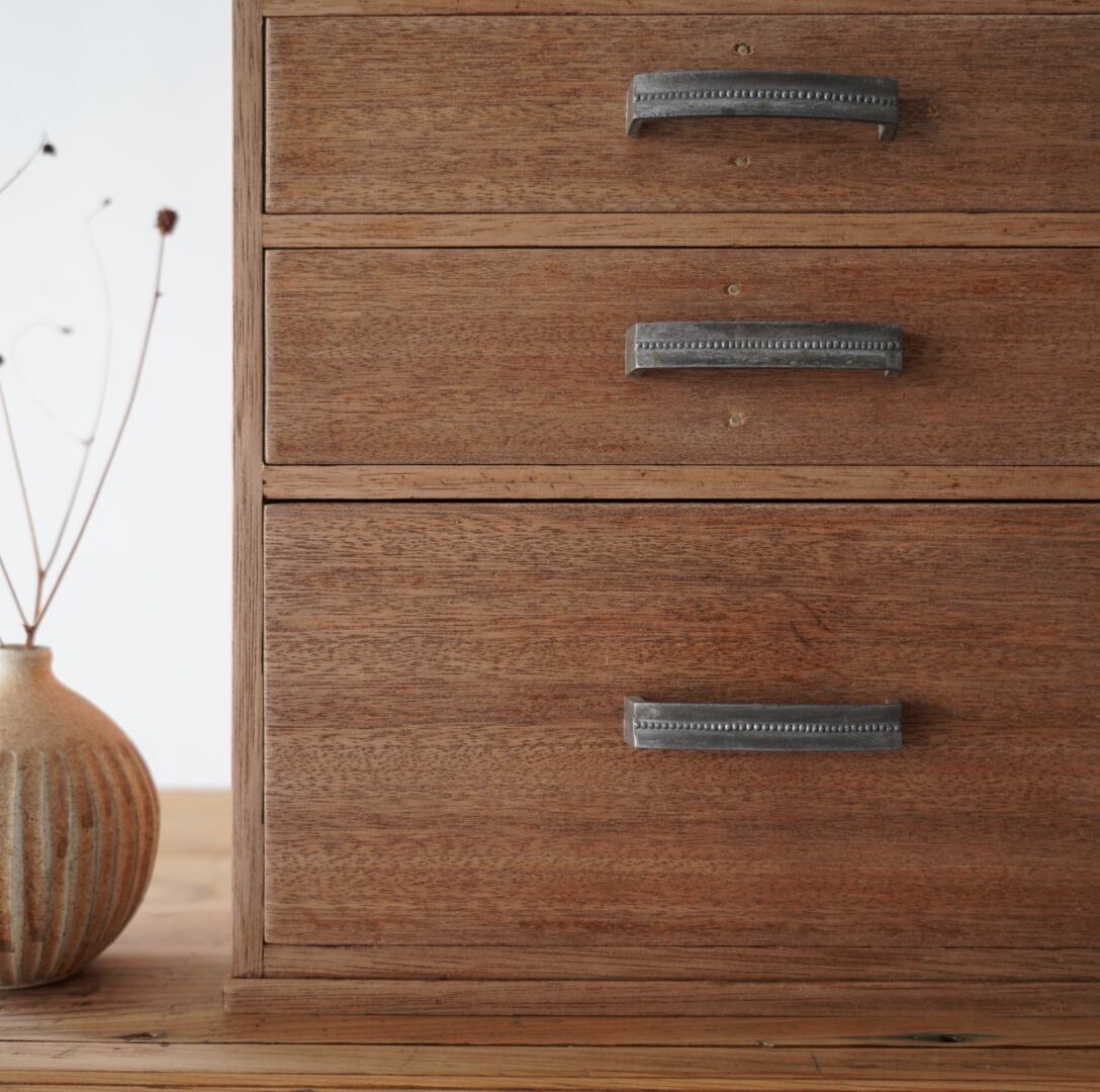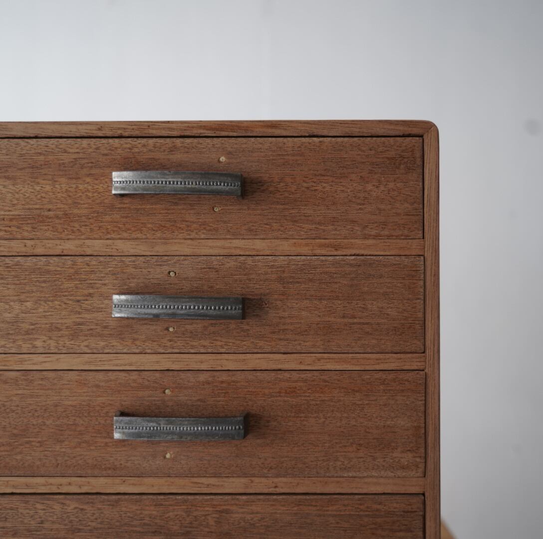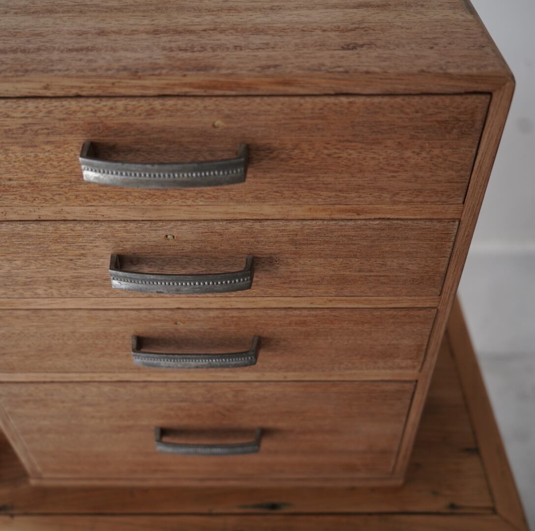 ナチュラルな木味と古いアルミの取手が可愛らしい4杯の引き出し。