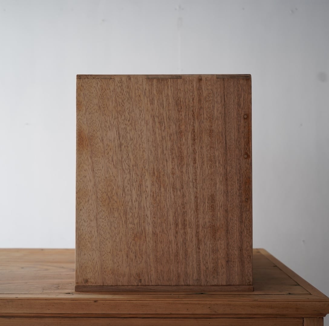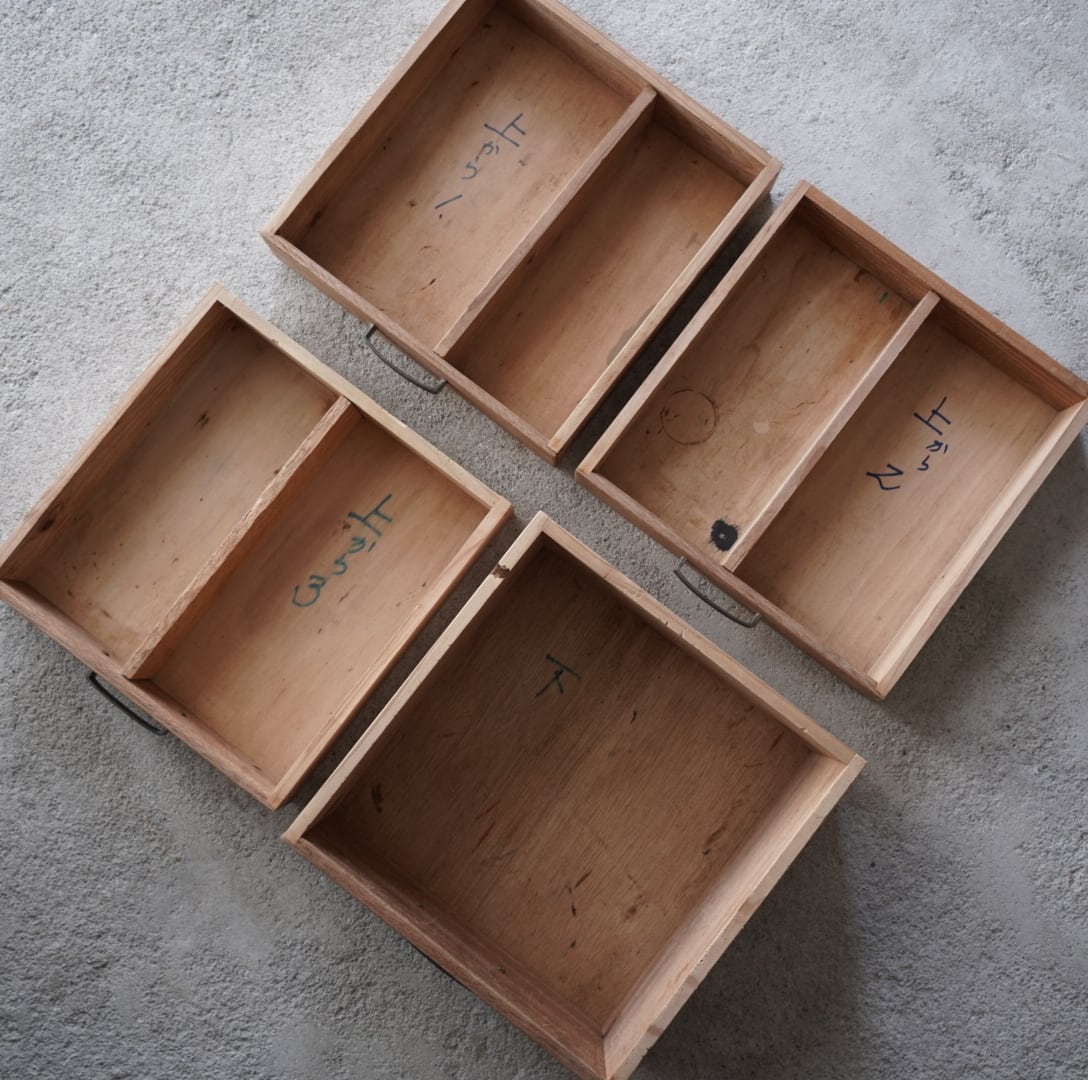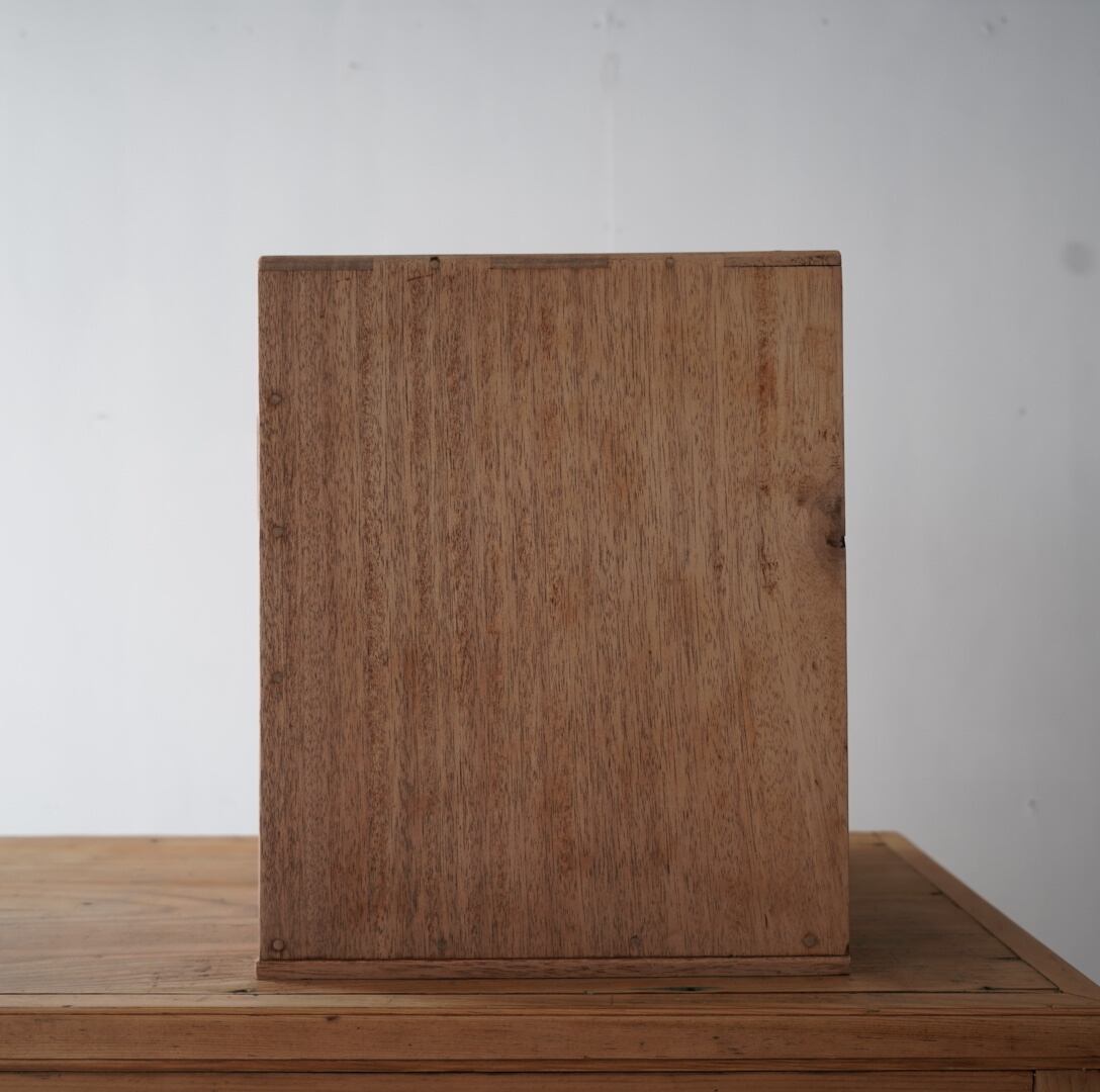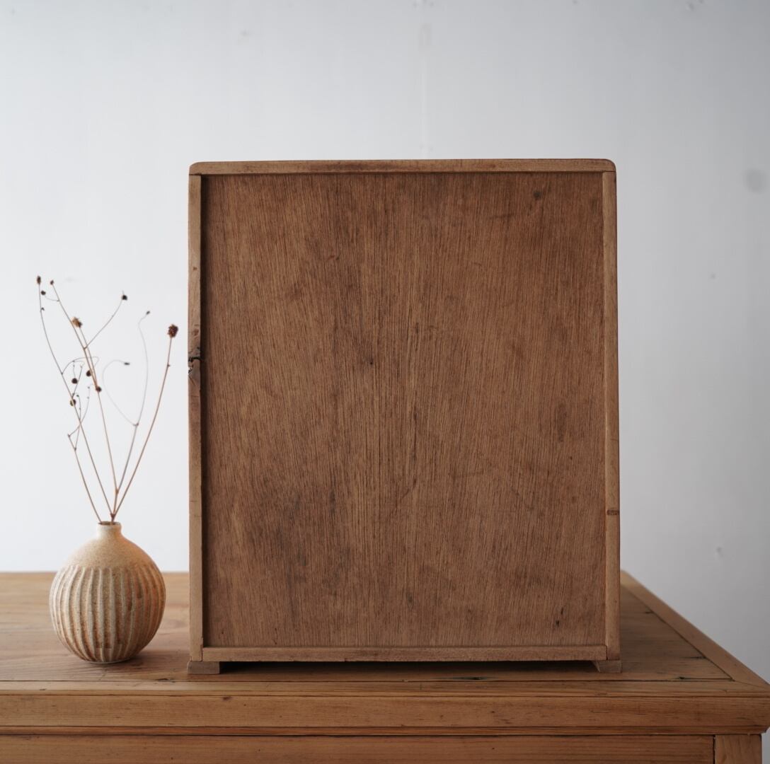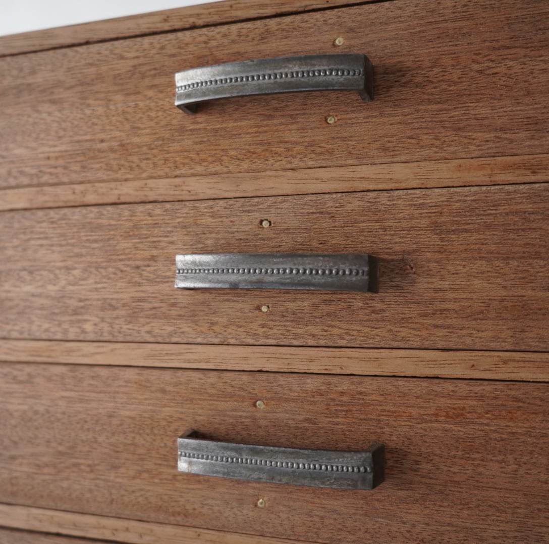 ナチュラルな木味と古いアルミの取手が可愛らしい4杯の引き出し。