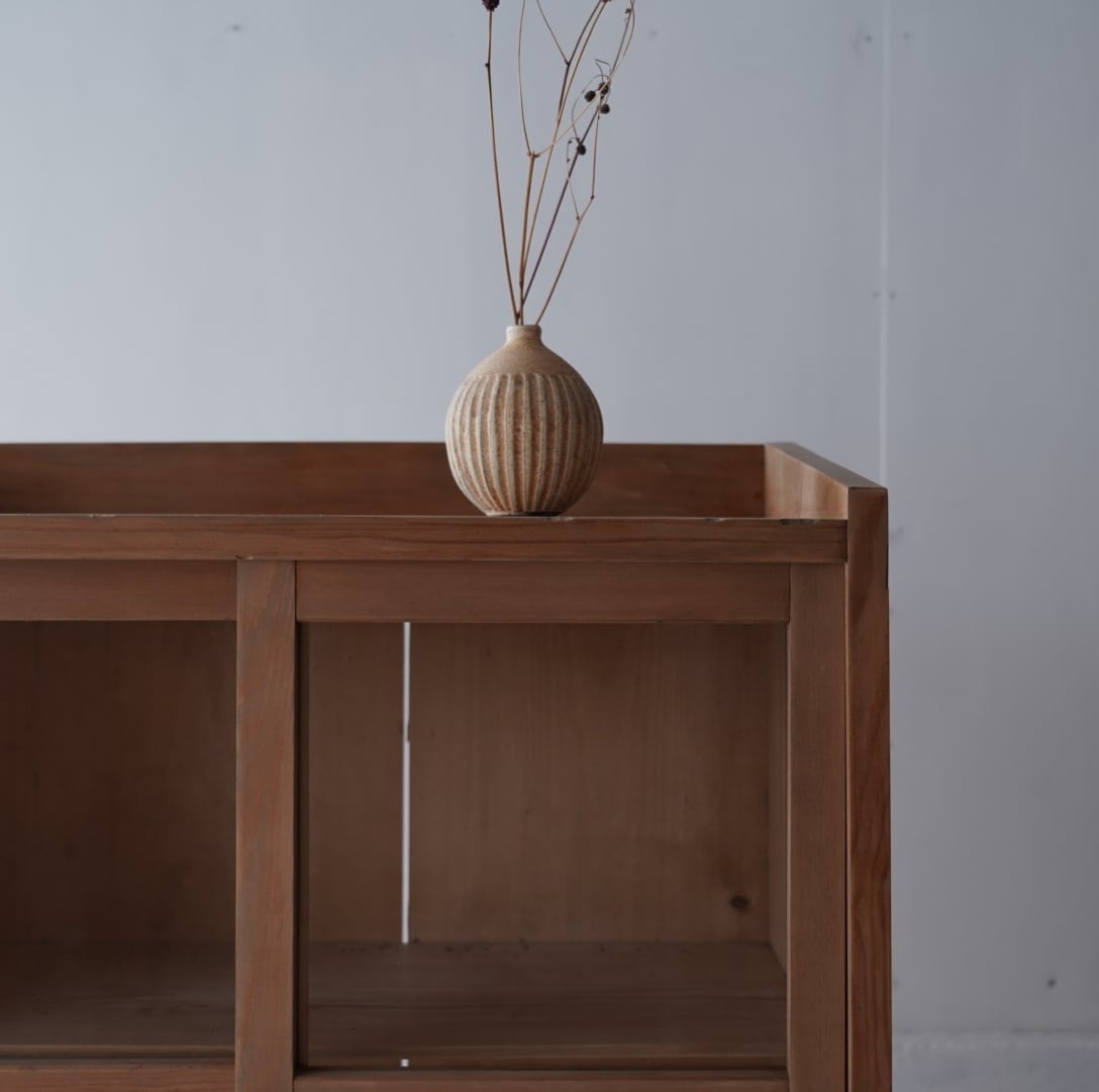 無垢材のナチュラルな木味と格子ガラスの引戸が美しいキャビネット。