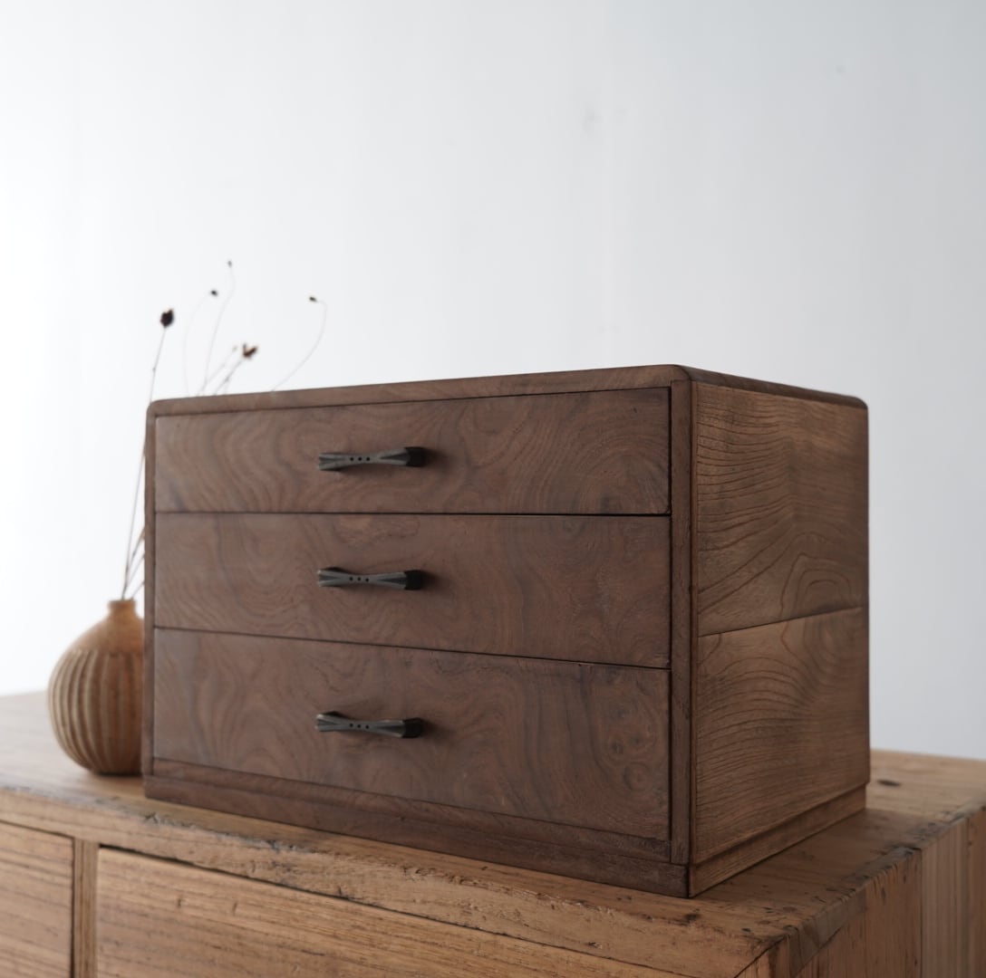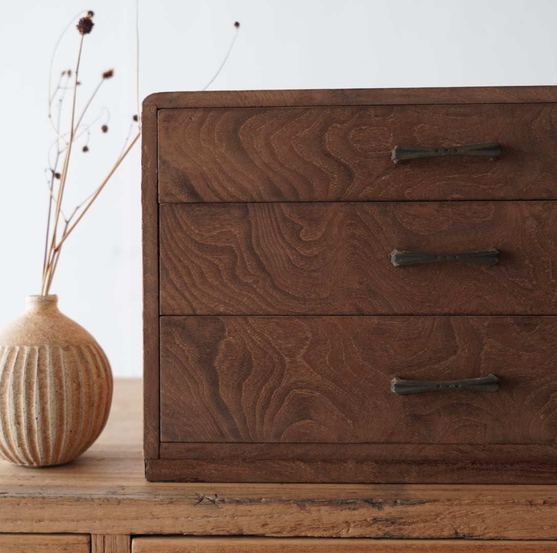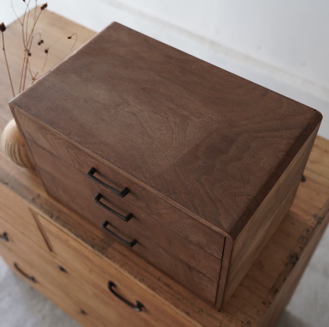 温かみのある木味と流れるような杢目が美しい3杯の引き出し。
