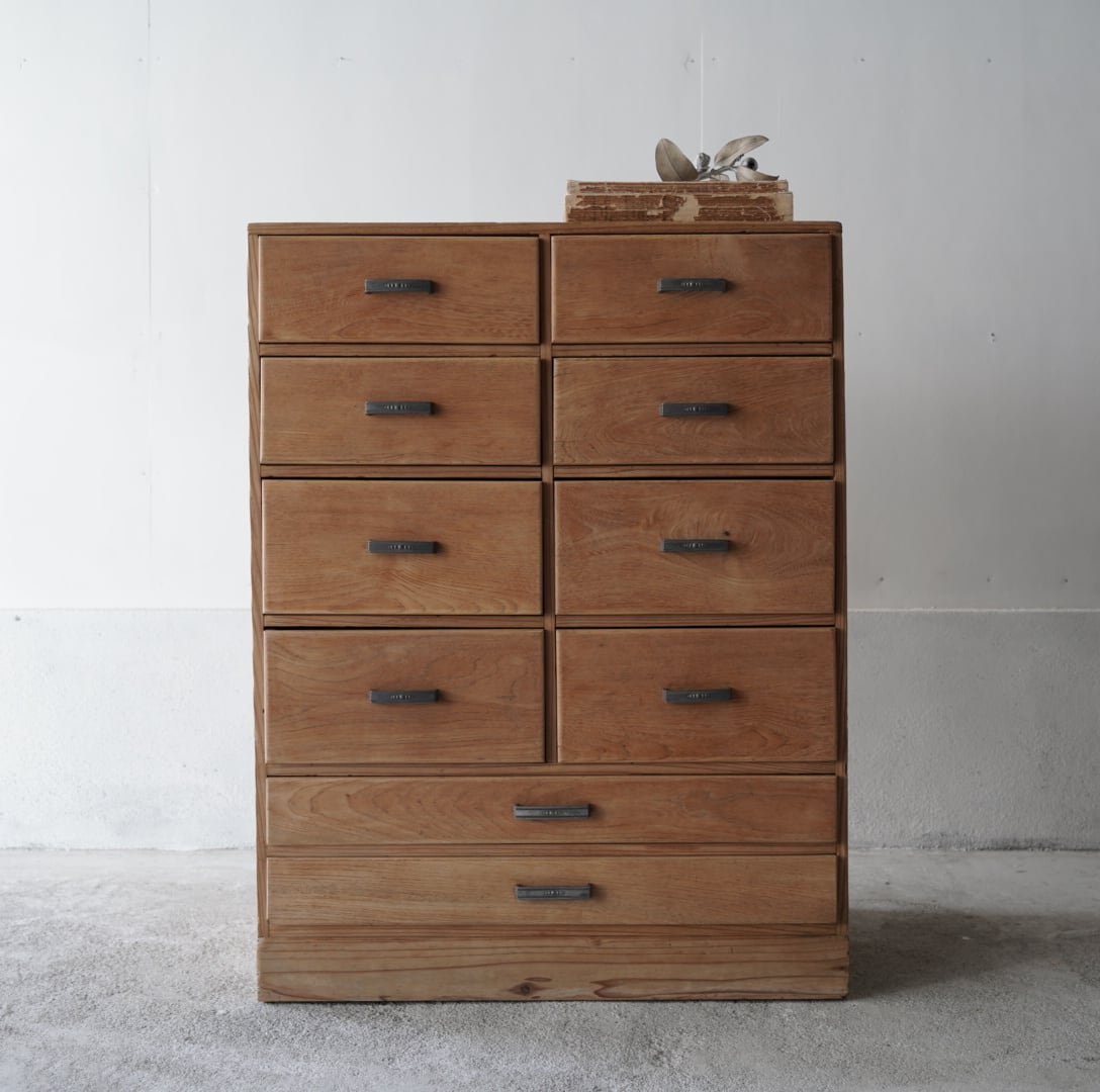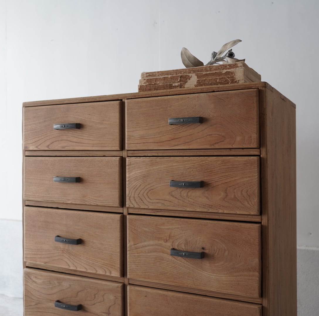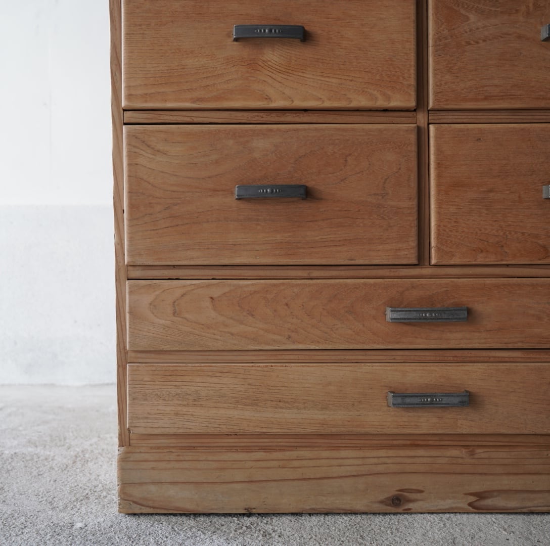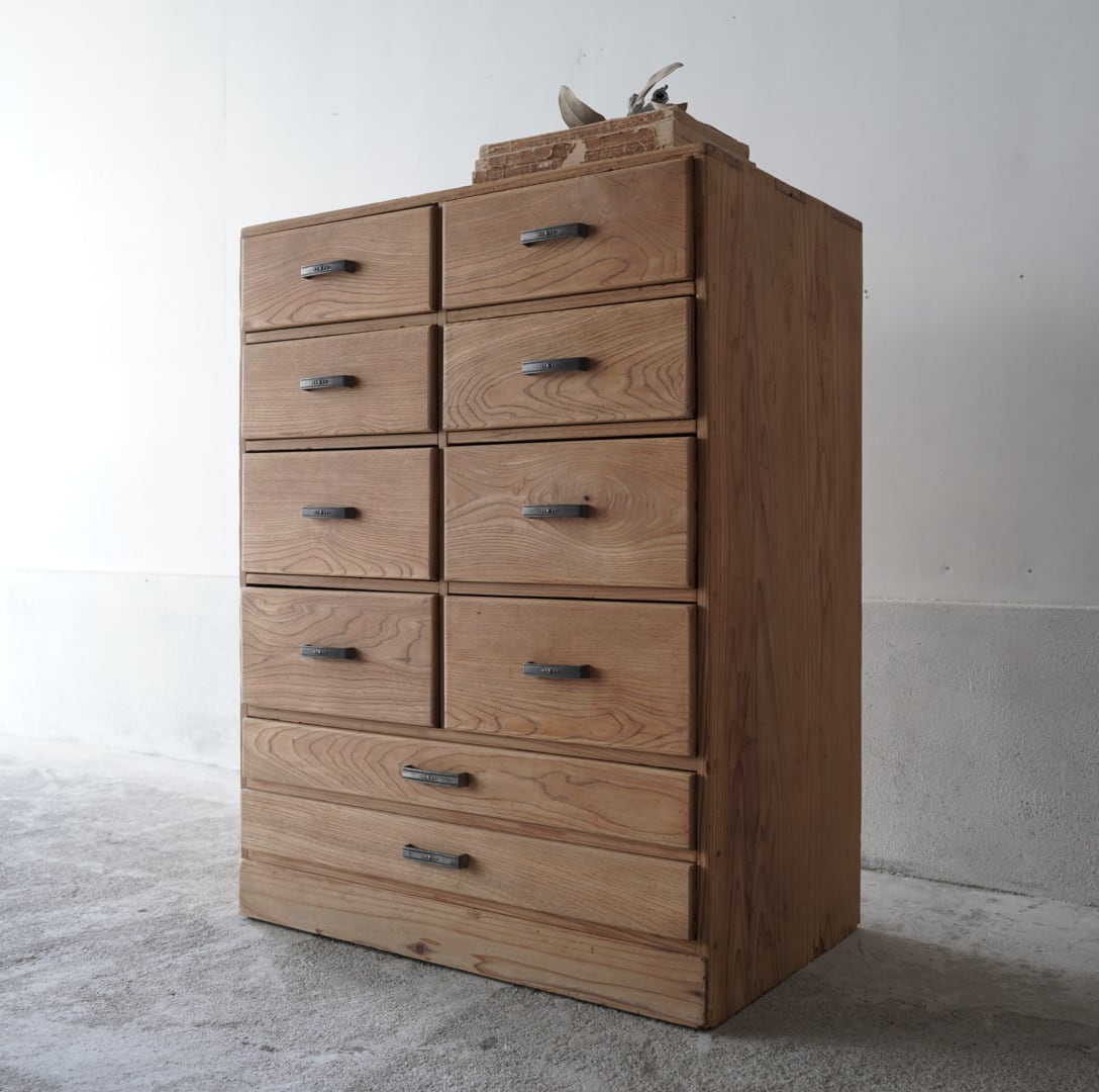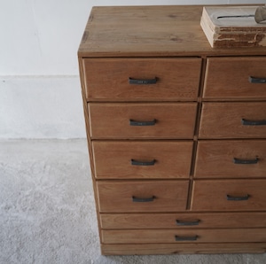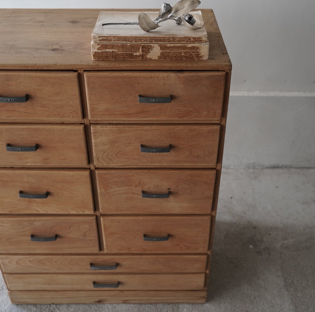 ナチュラルな木味と経年変化のあるアルミ取手が可愛らしい10杯の引き出しチェスト。