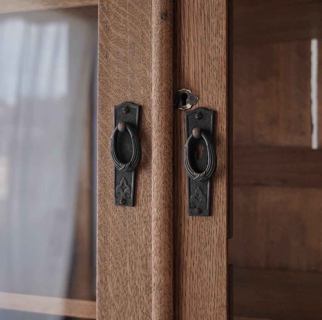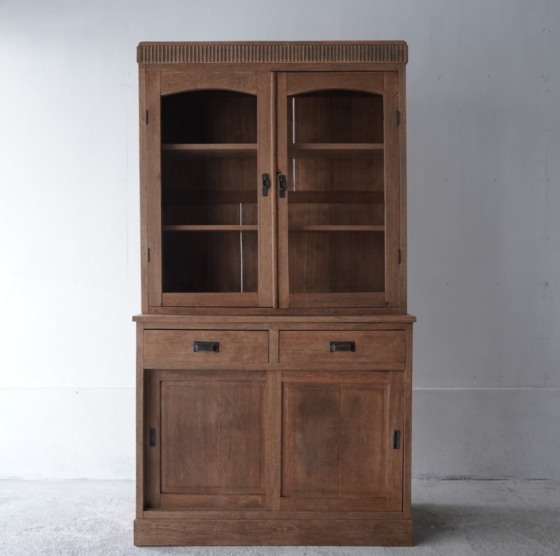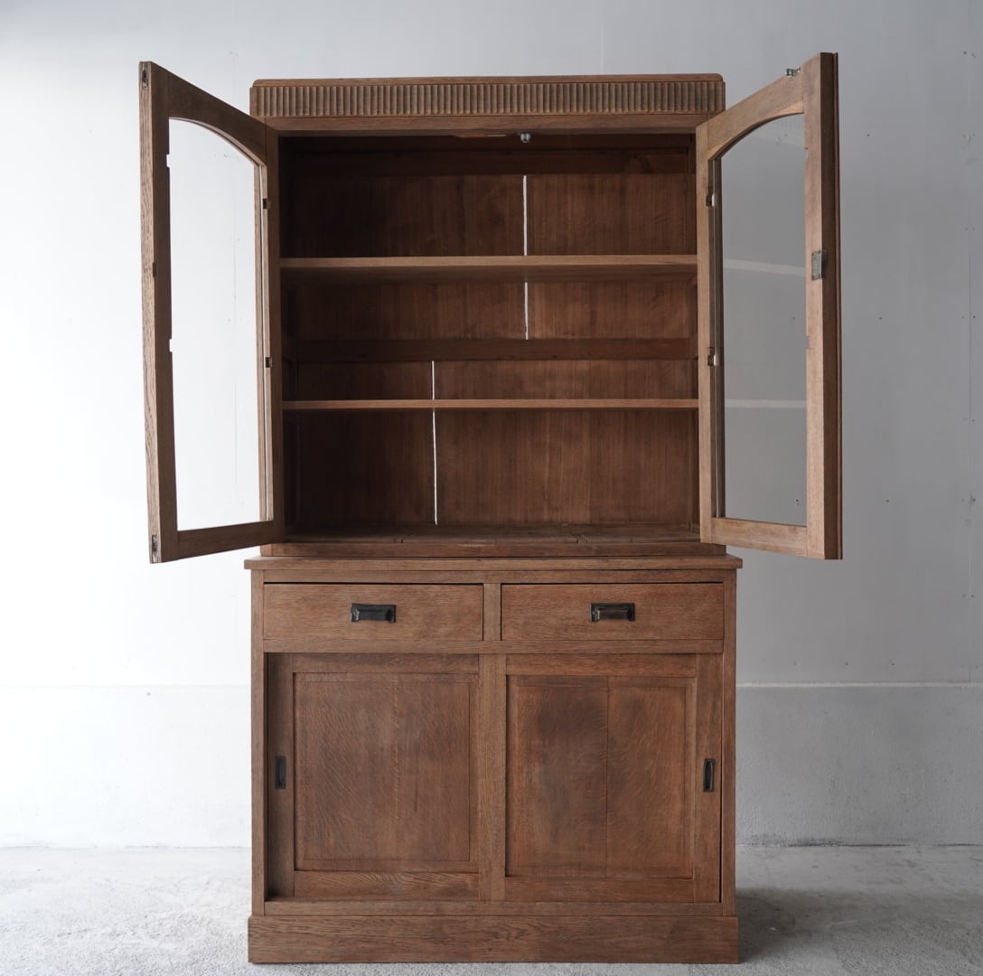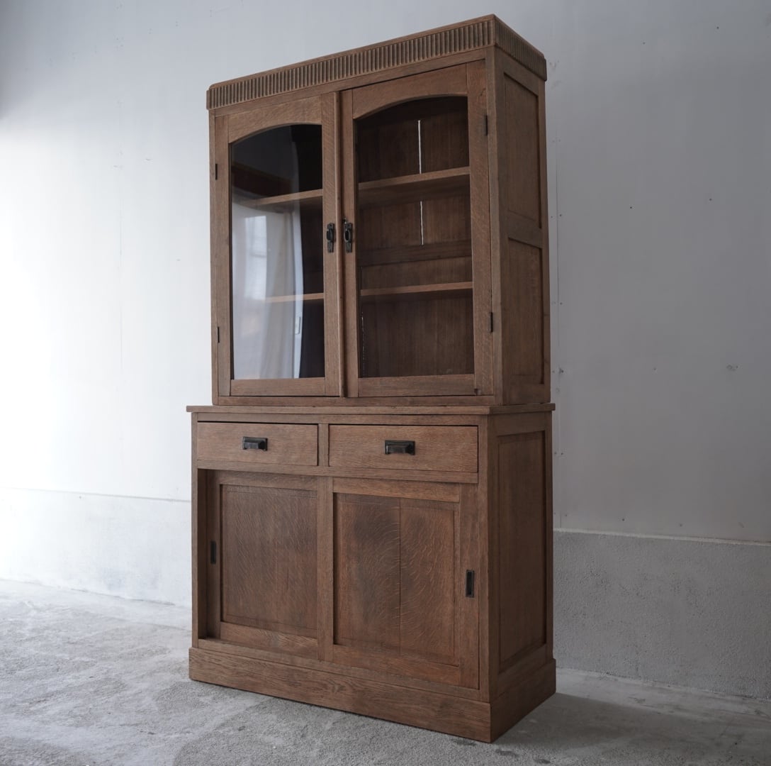古い楢材の素朴な風合いと大きなアーチ型の開戸が美しいキャビネット。