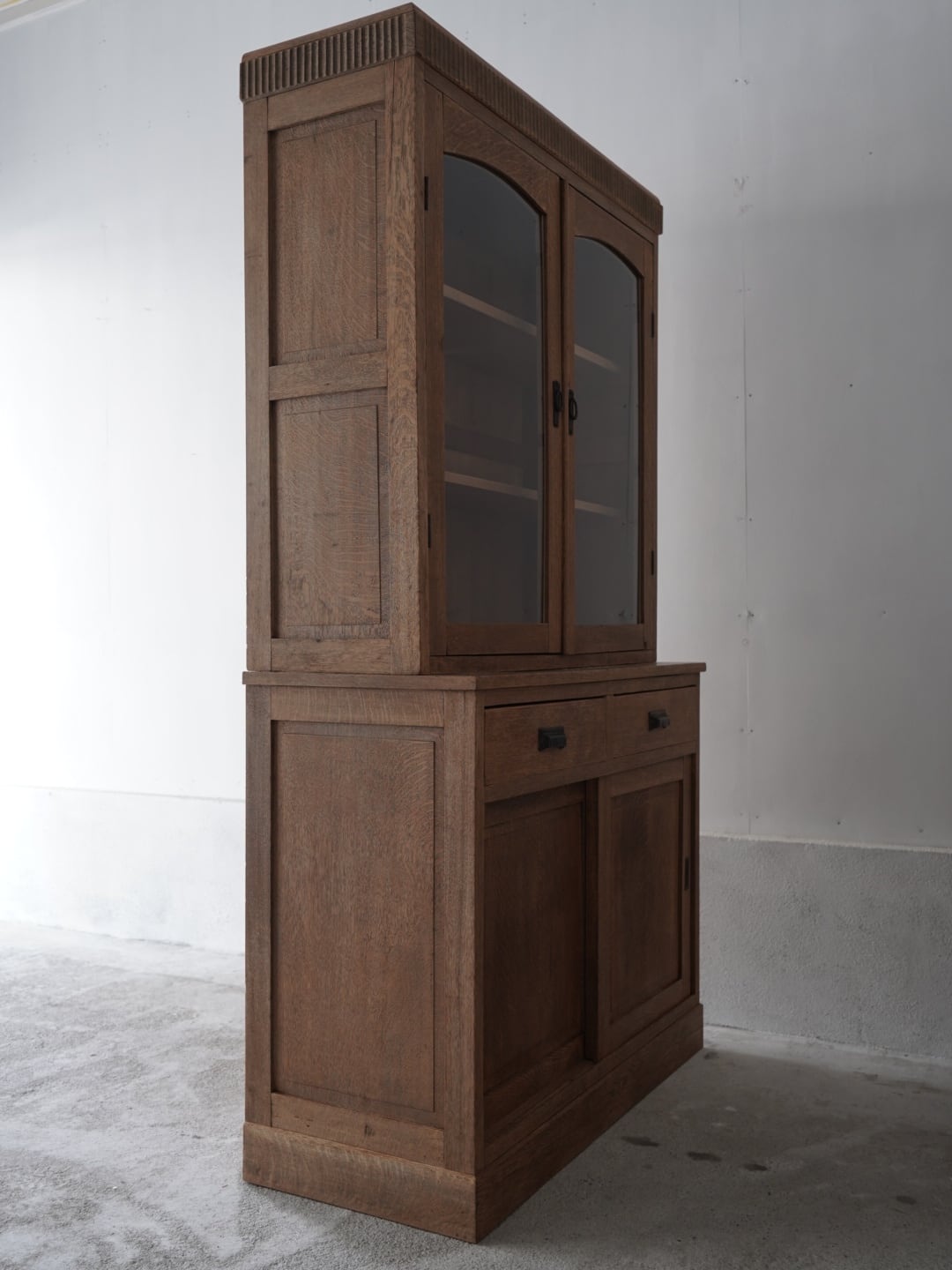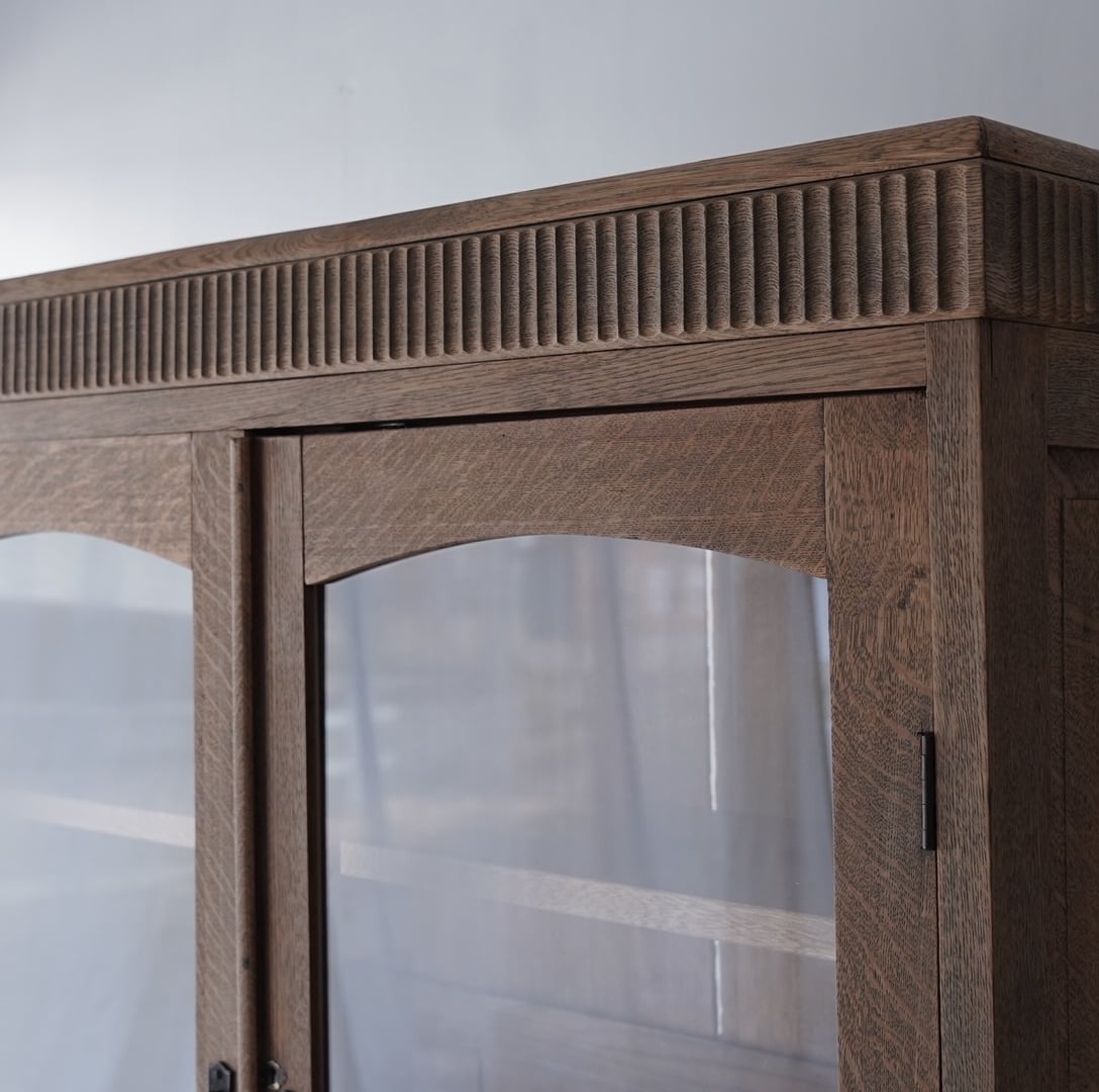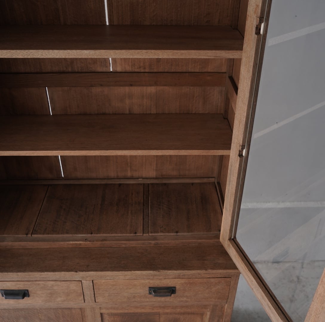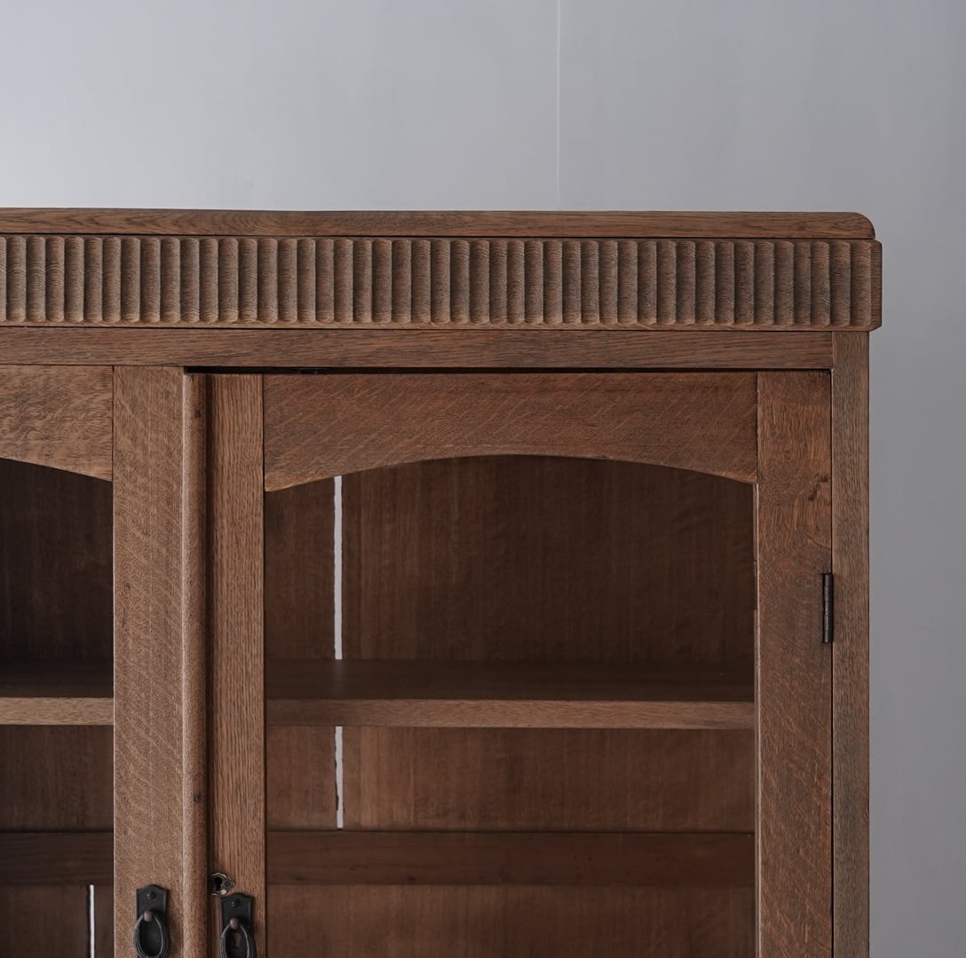 古い楢材の素朴な風合いと大きなアーチ型の開戸が美しいキャビネット。
