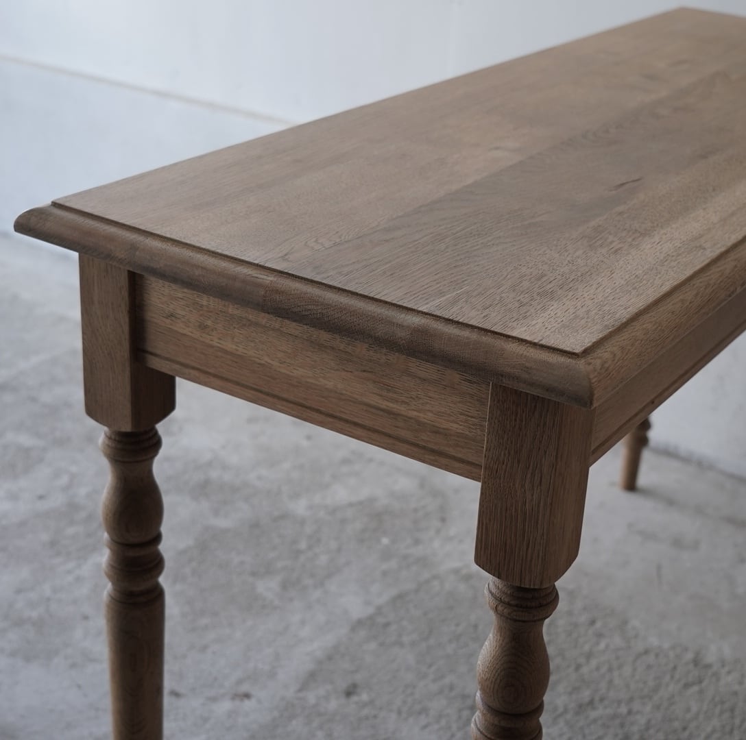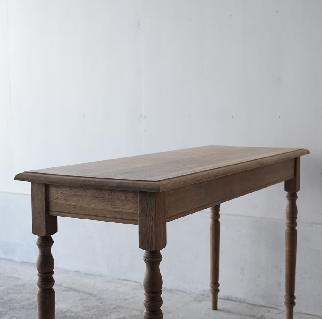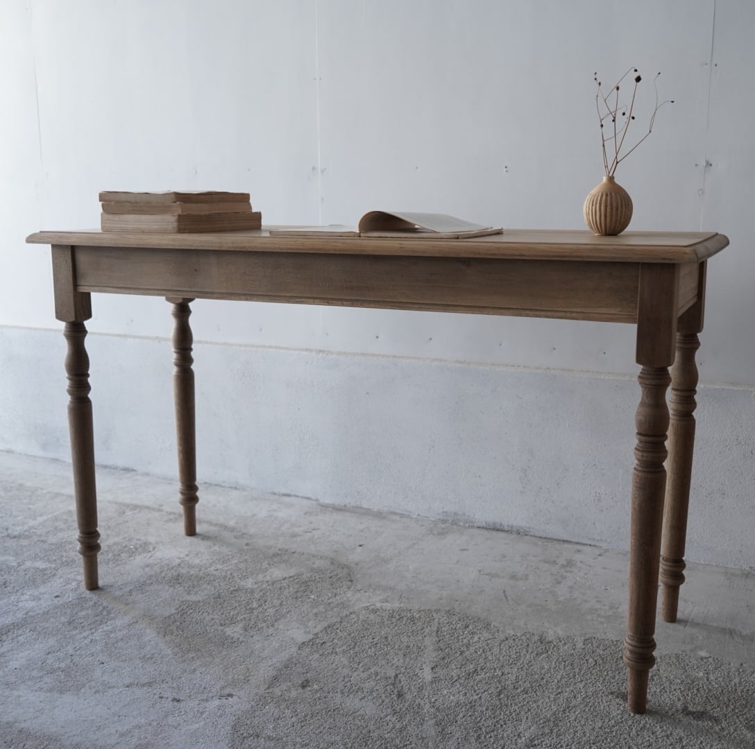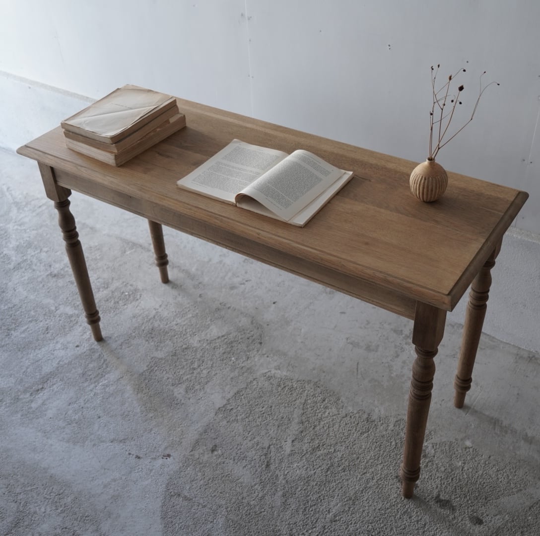 奥行きがすっきりとした珍しいサイズ感のデーブルで、カウンターやコンソールテーブルにぴったりです。