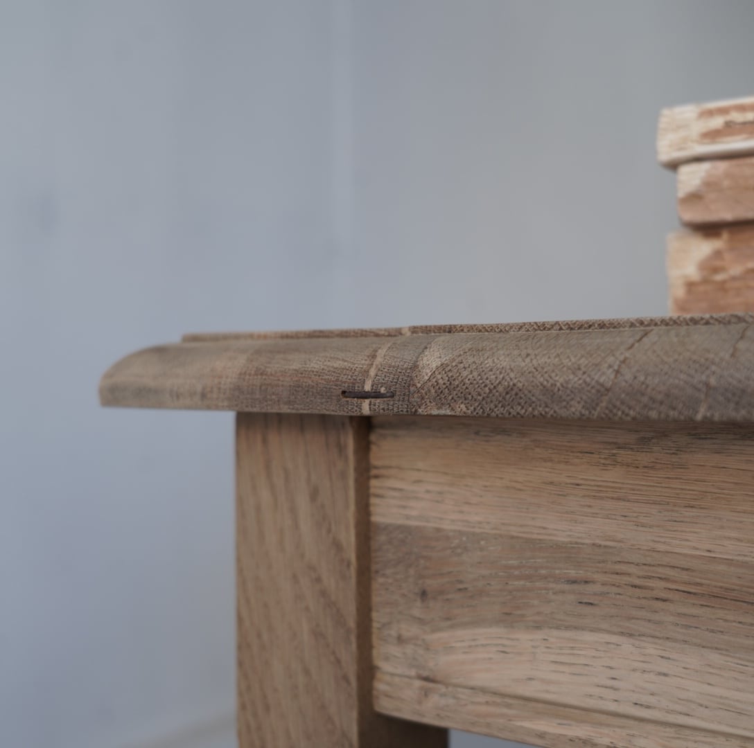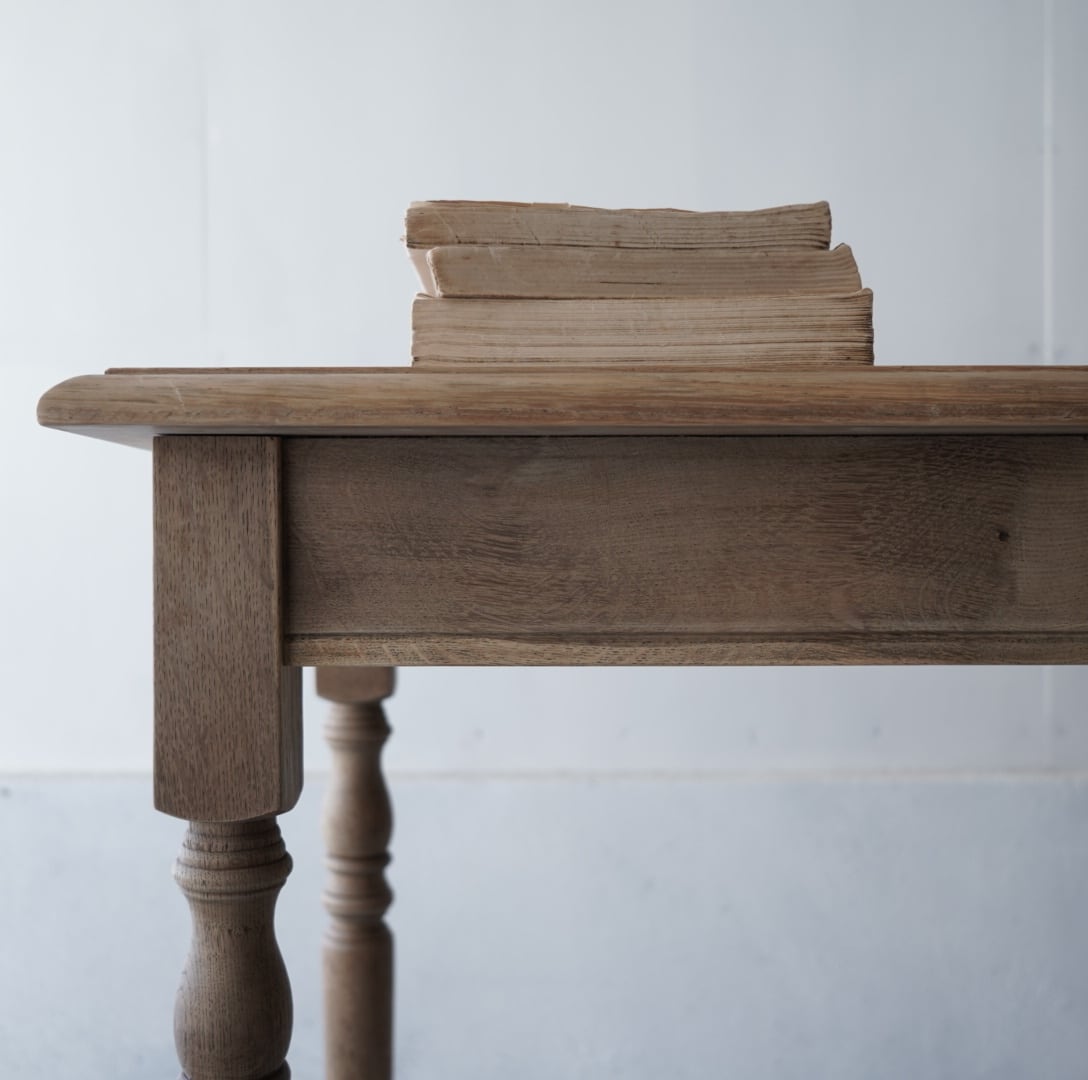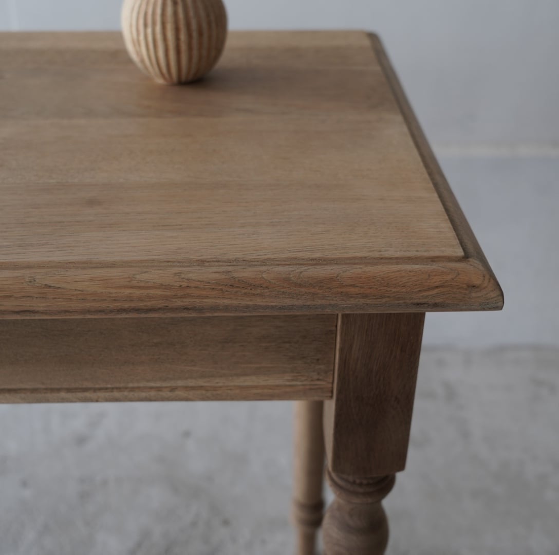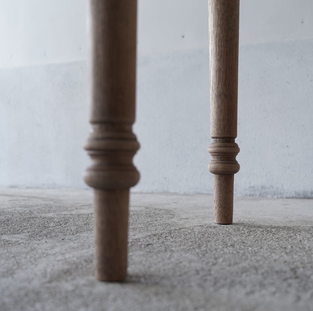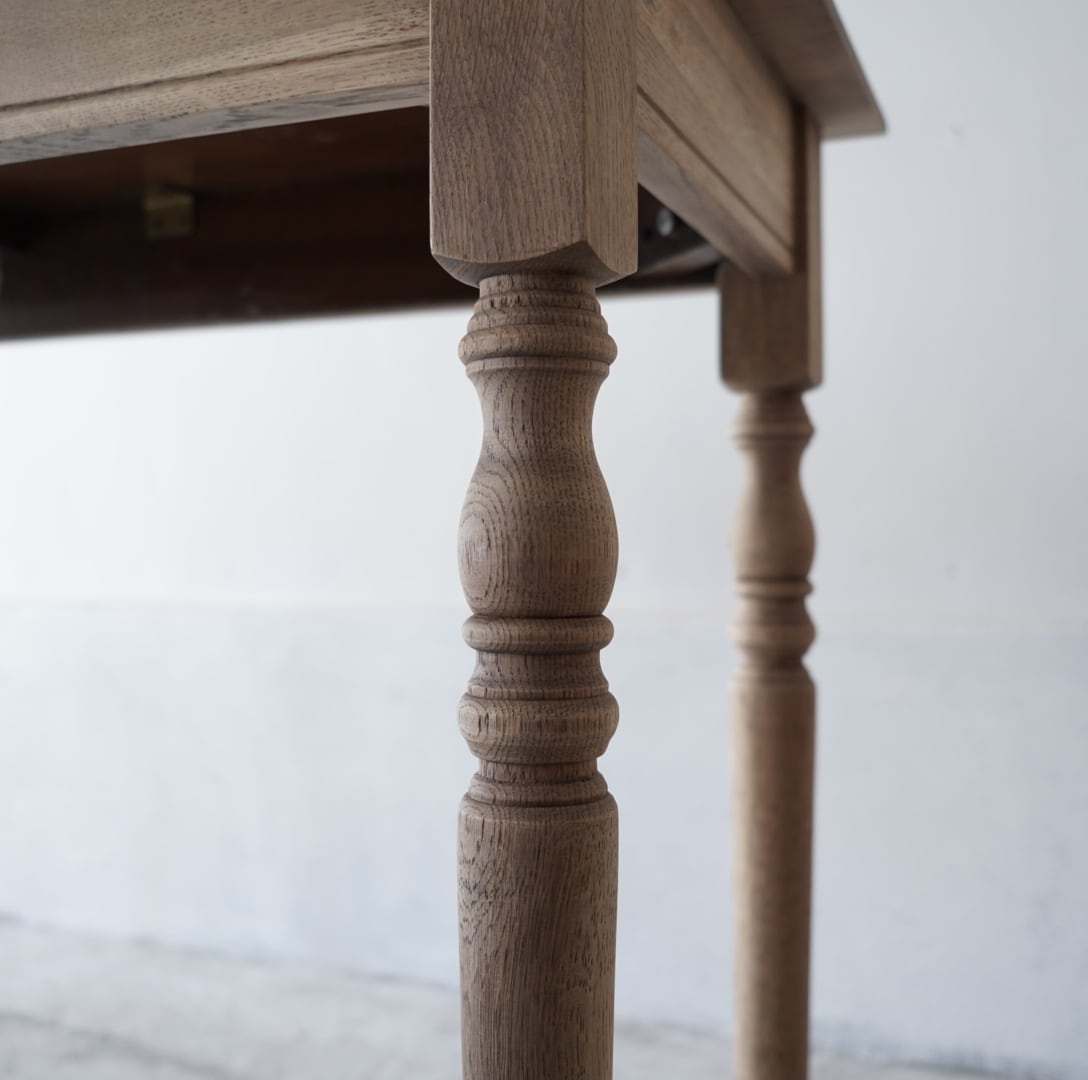 オークの木のそっけない色味が感じのいいろくろ脚のテーブル。