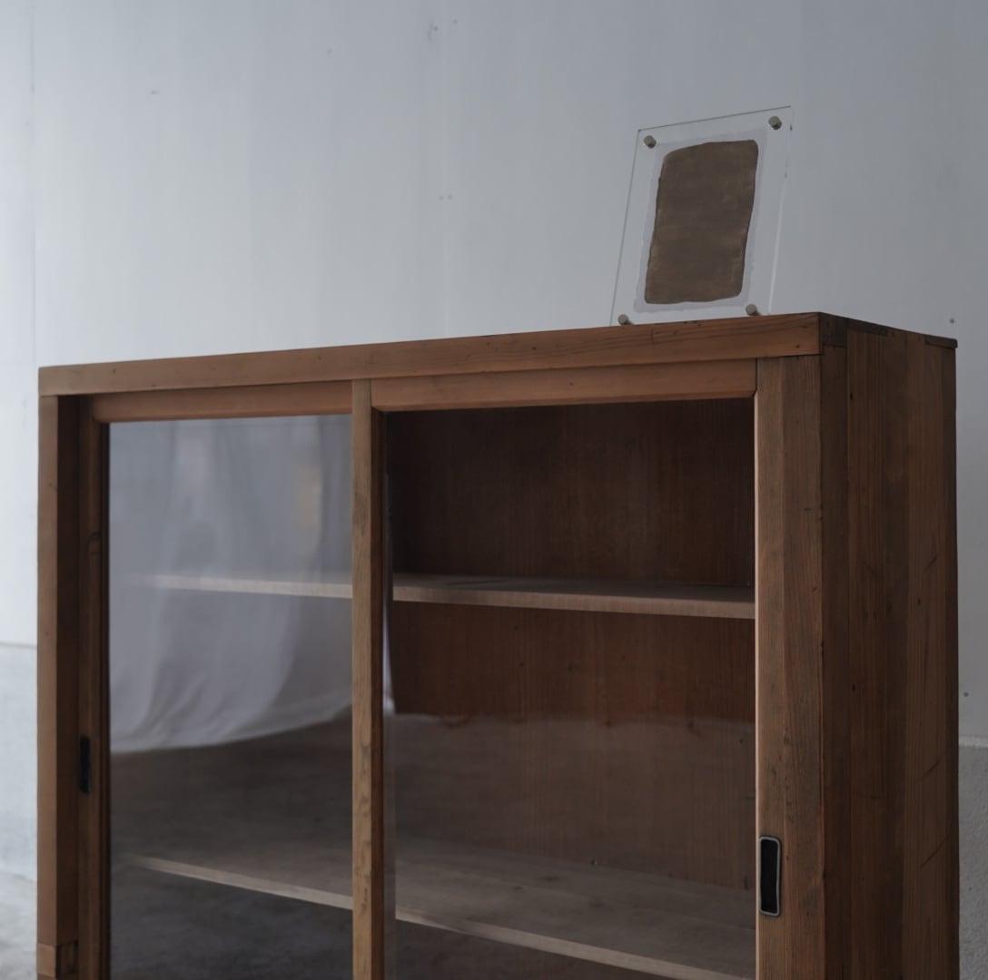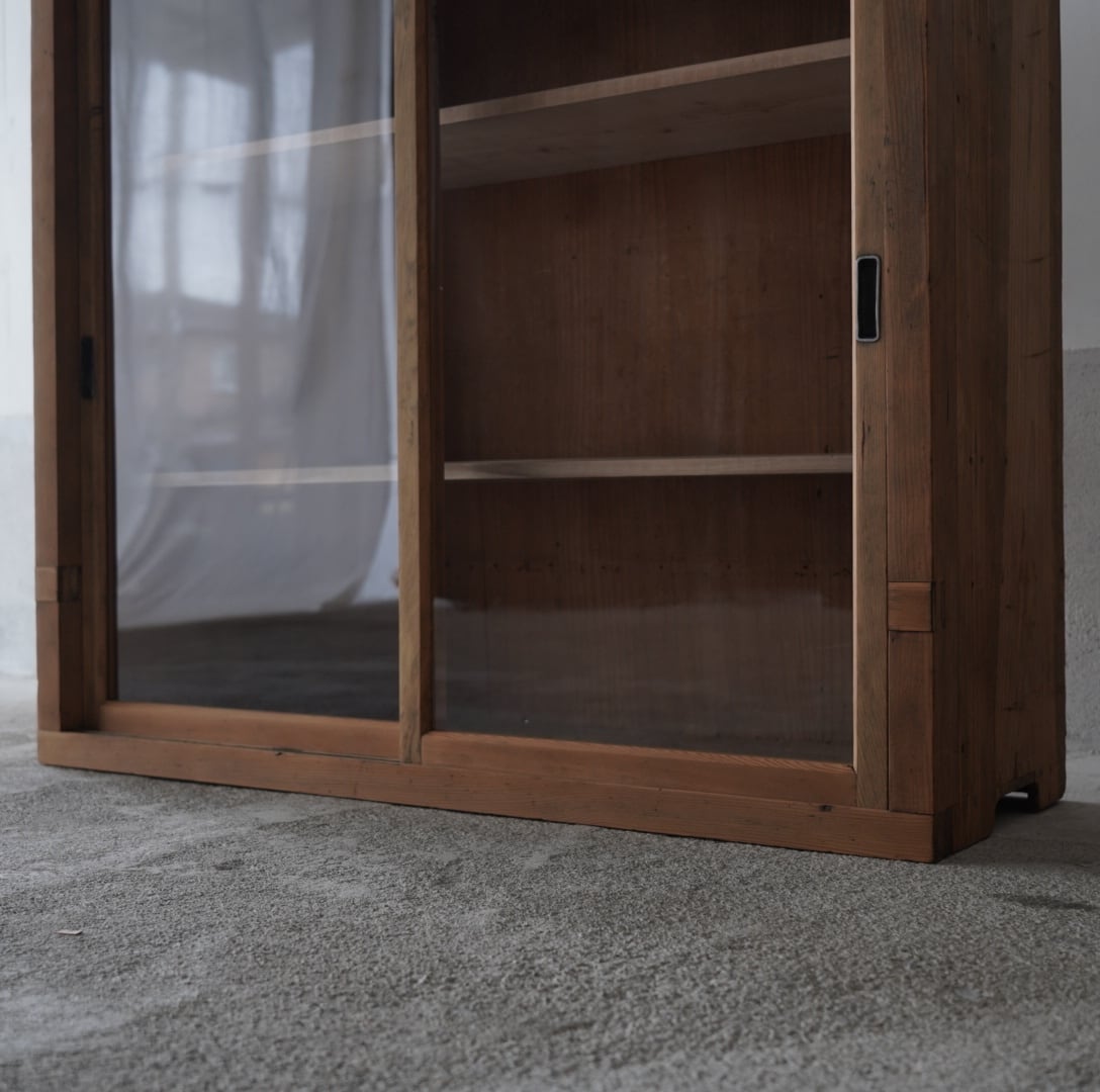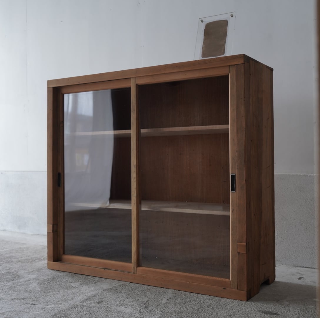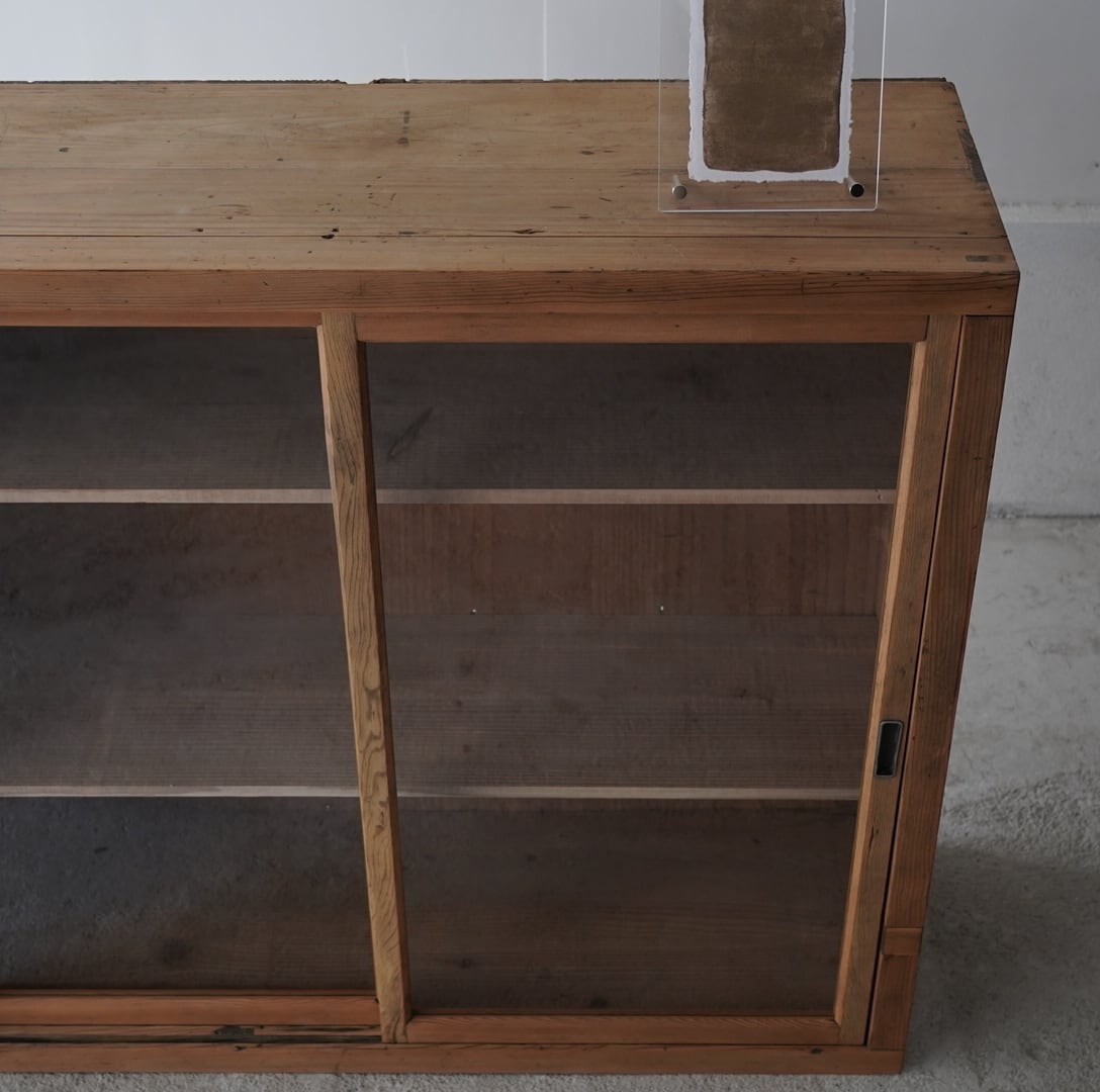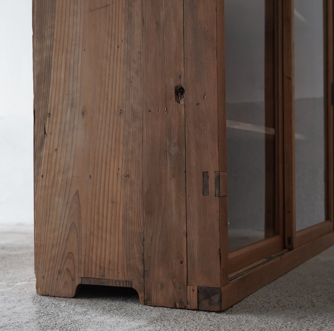 古い無垢材の素朴な風合いと大きなガラスの引戸が美しいキャビネット。