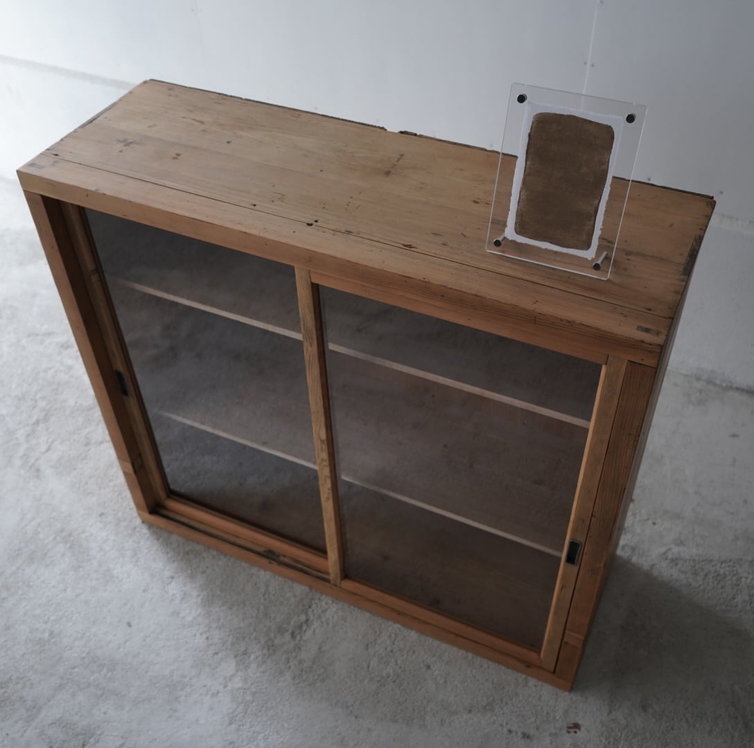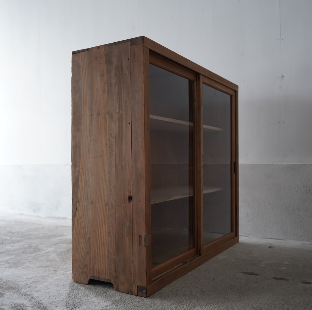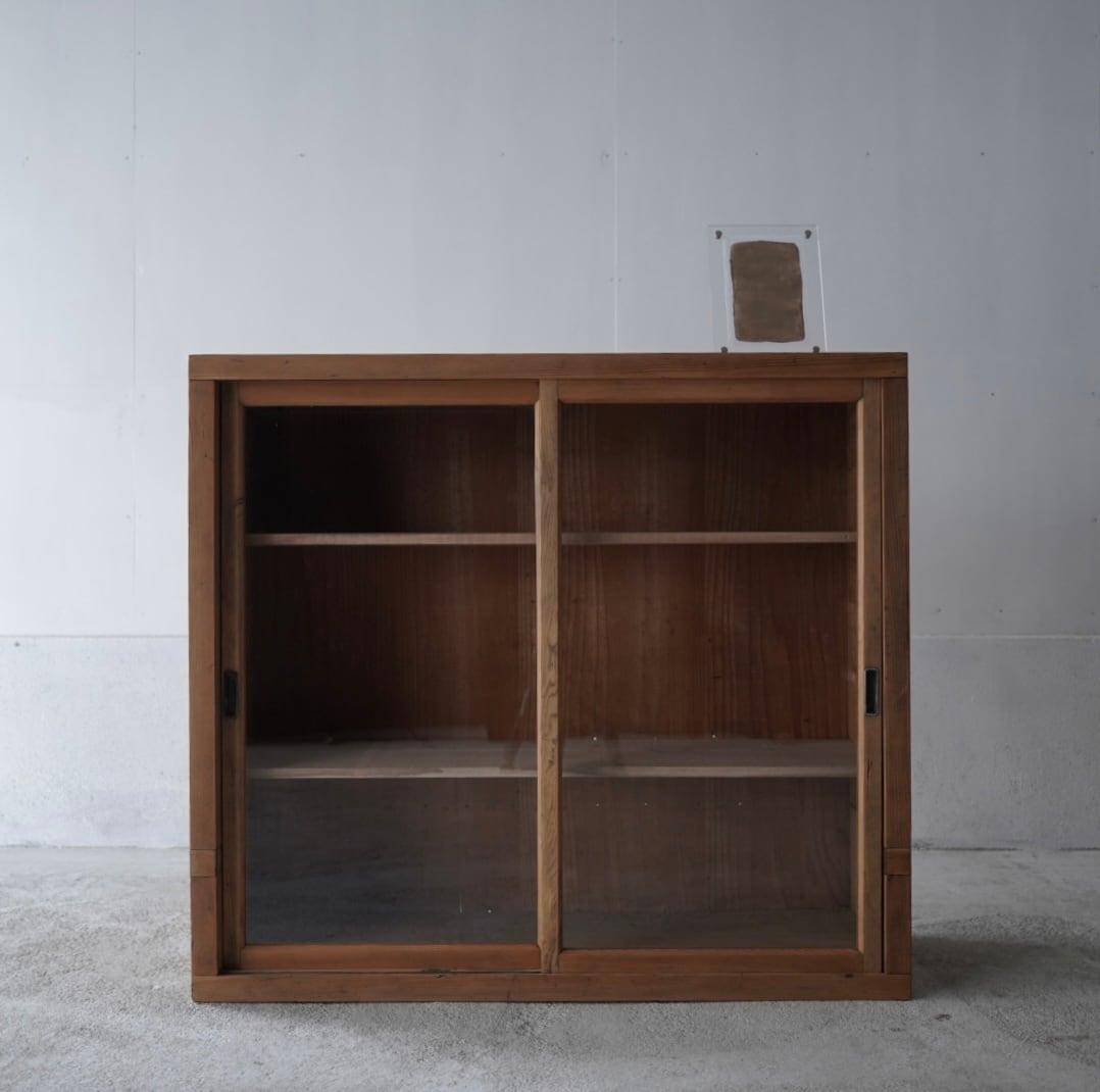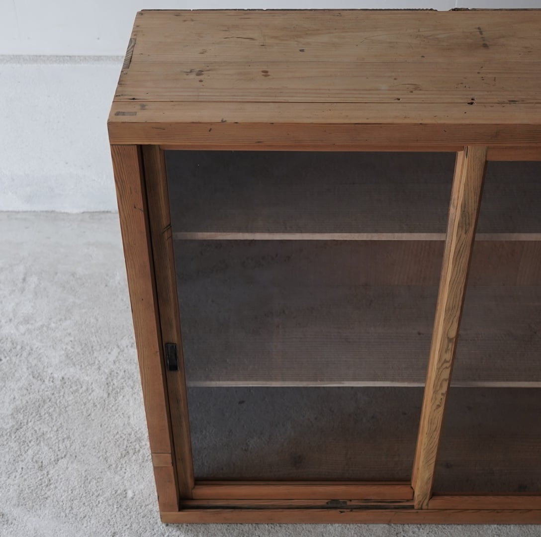 古い無垢材の素朴な風合いと大きなガラスの引戸が美しいキャビネット。