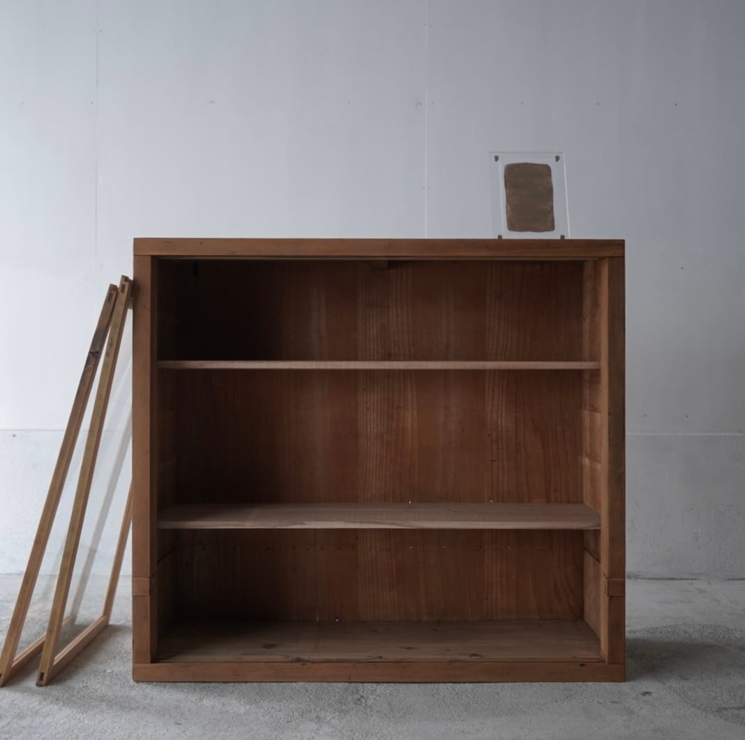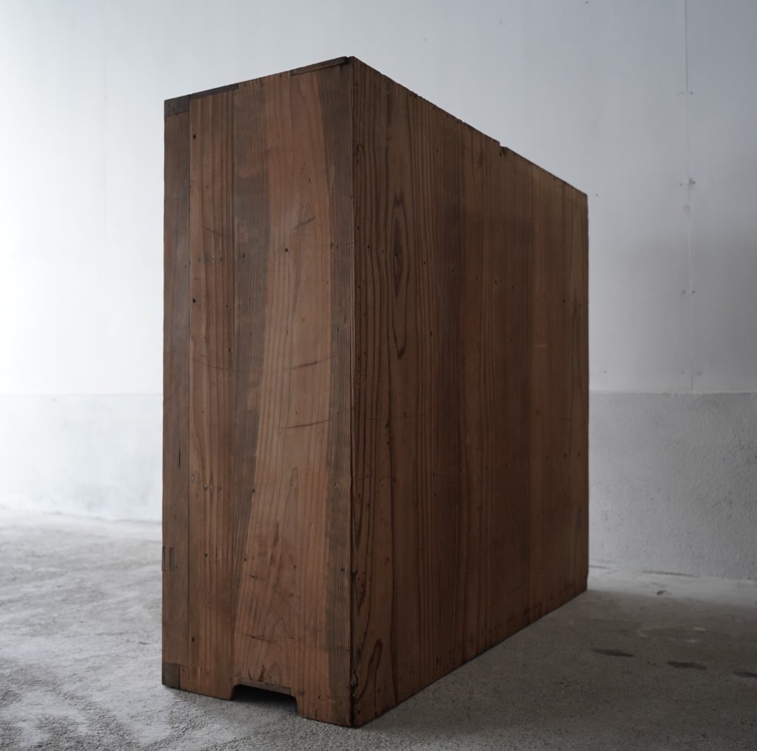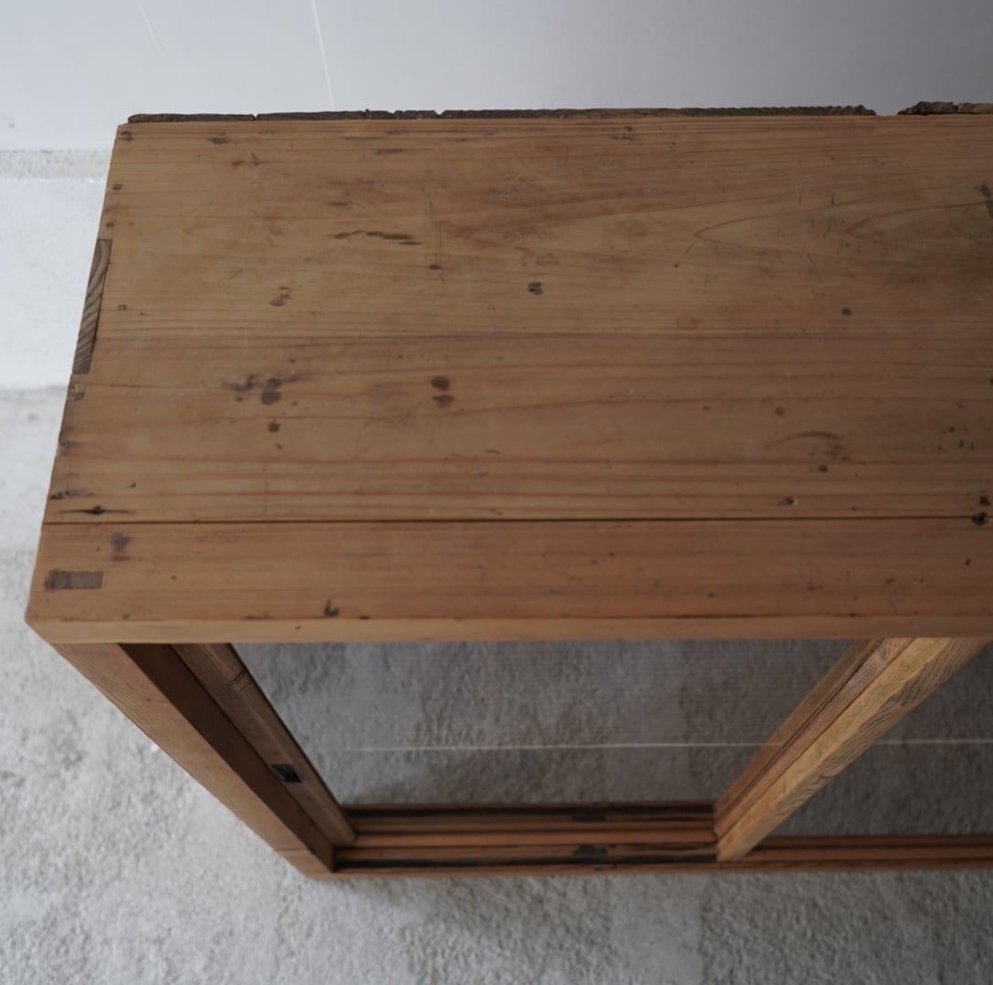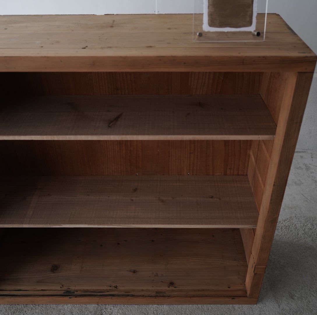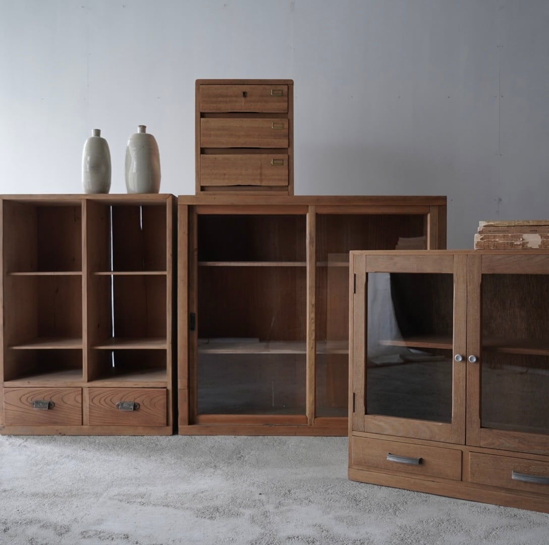 古い無垢材の素朴な風合いと大きなガラスの引戸が美しいキャビネット。