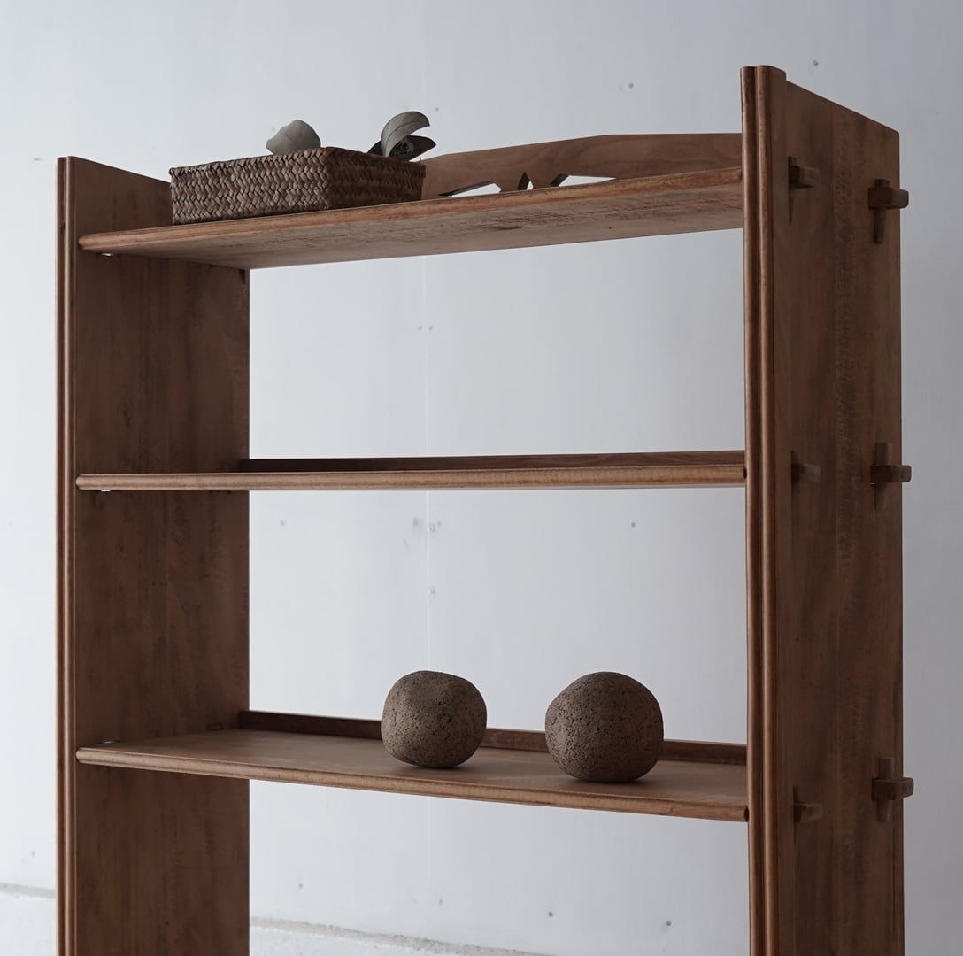 20本の楔が棚をしっかりと固定する造りになっており、機能性と美しさを兼ね備えます。