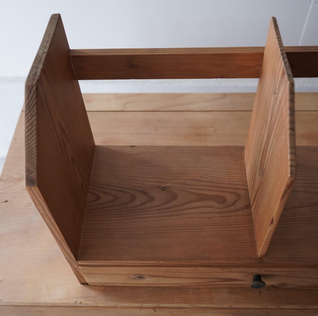 無垢材のナチュラルな木味と真鍮つまみの引き出しが可愛らしいブックスタンド。