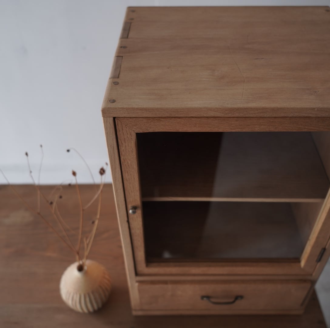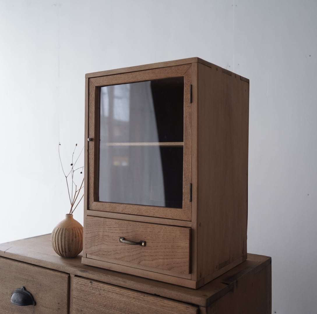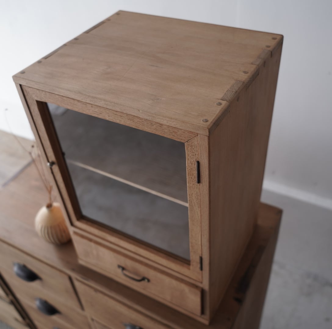 ナチュラルな木味とガラスの開き戸が美しいガラスケース。
