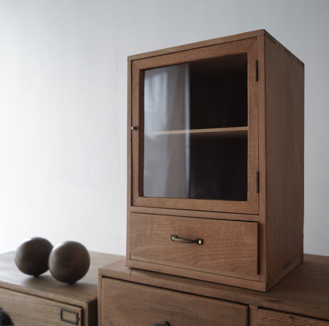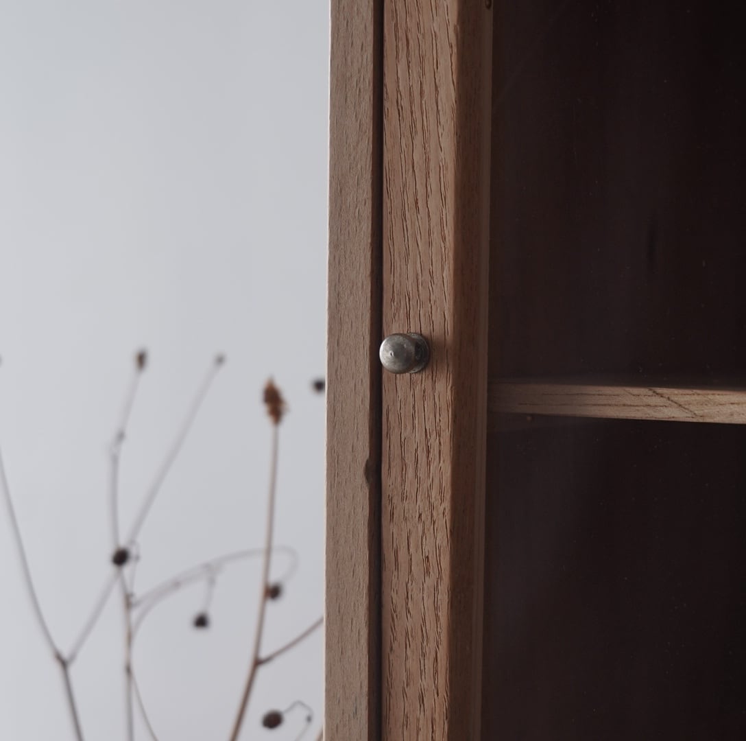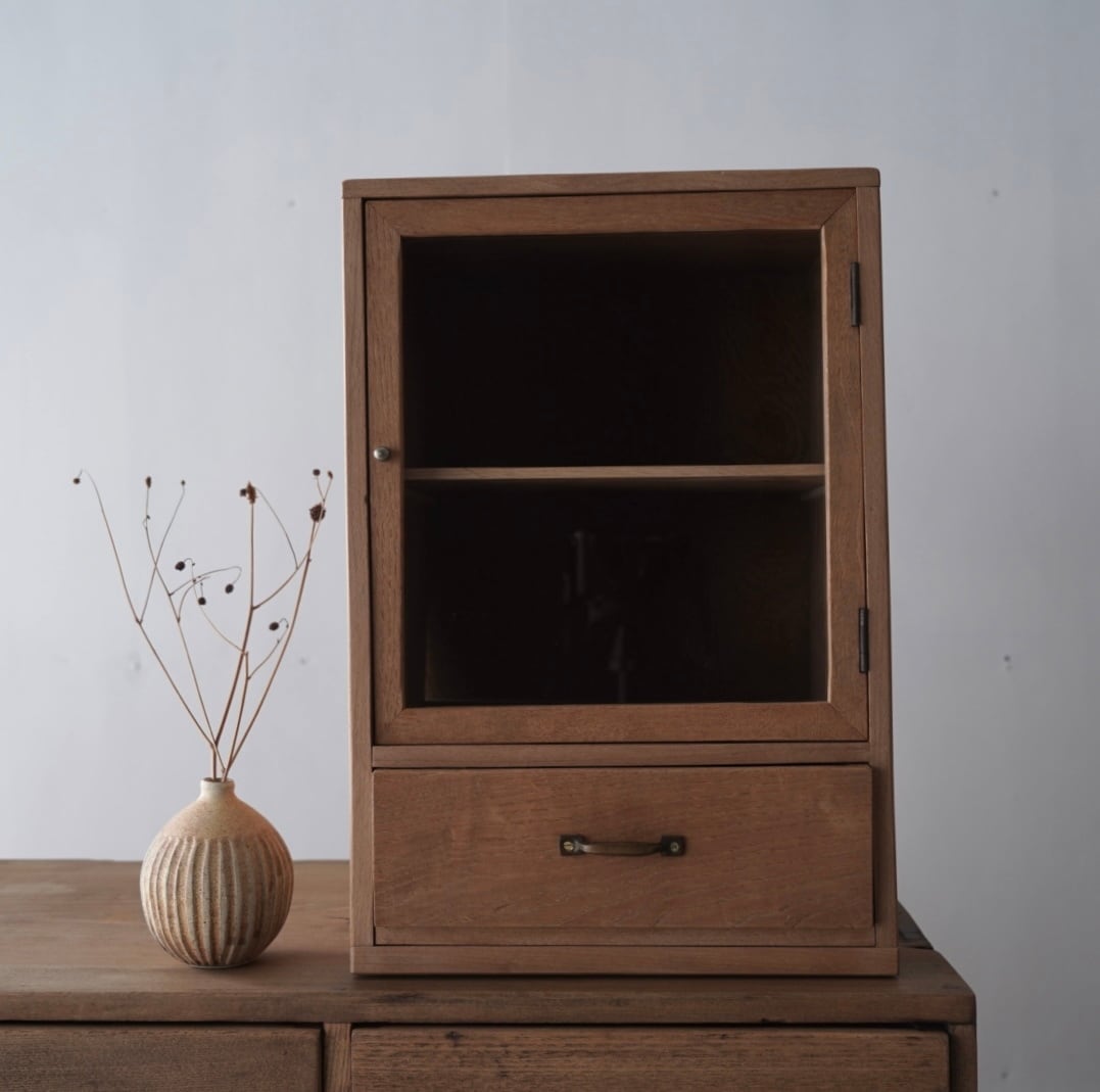 ナチュラルな木味とガラスの開き戸が美しいガラスケース。
