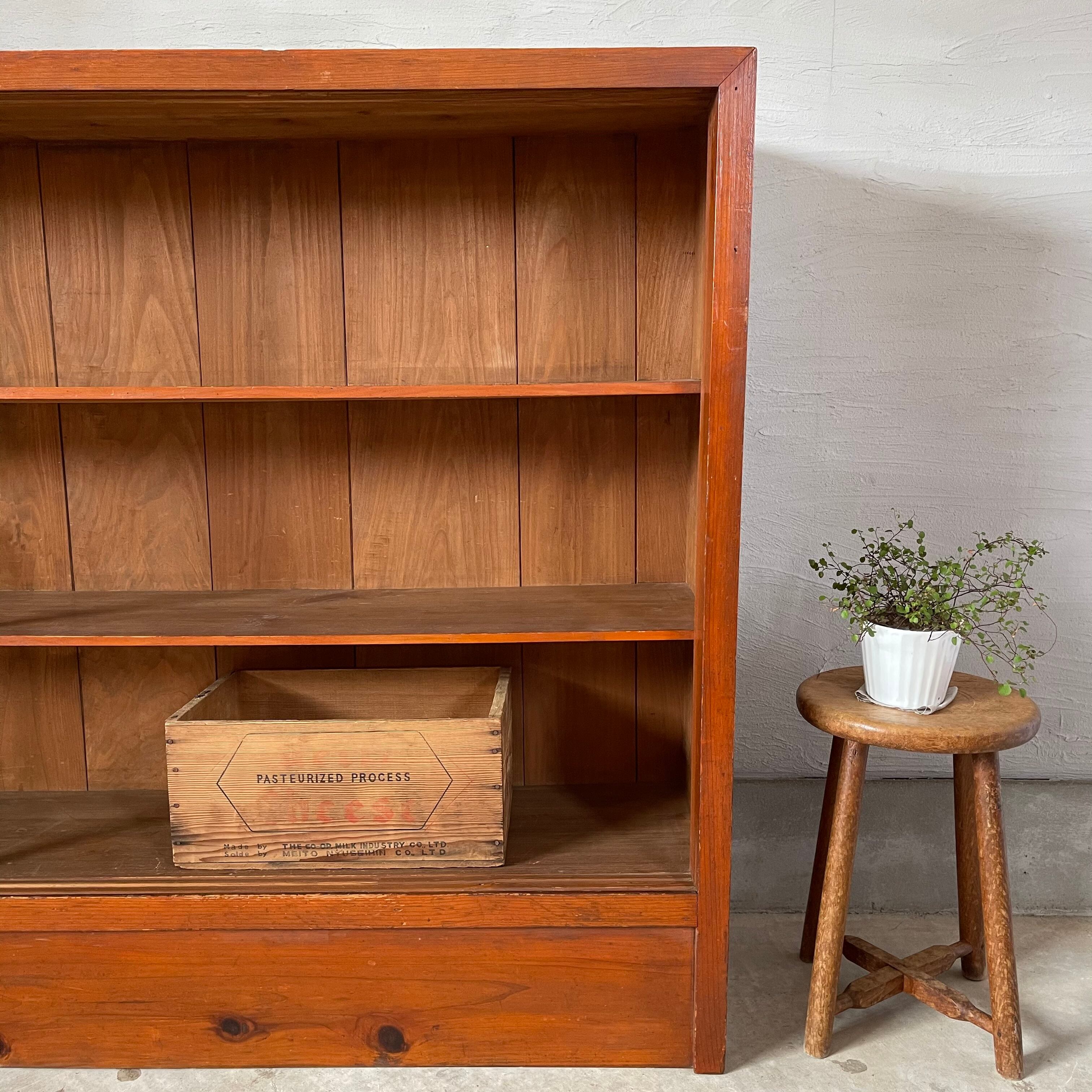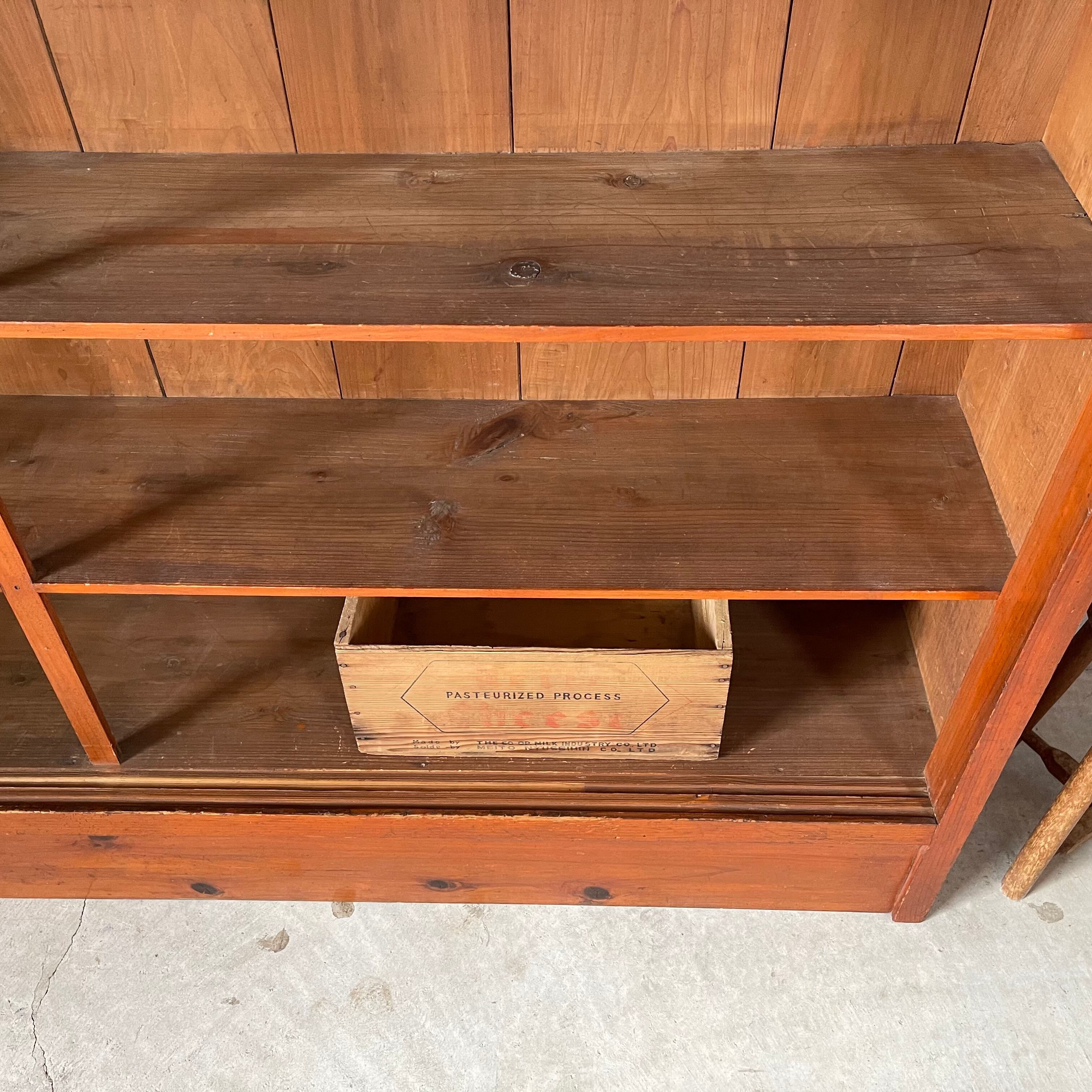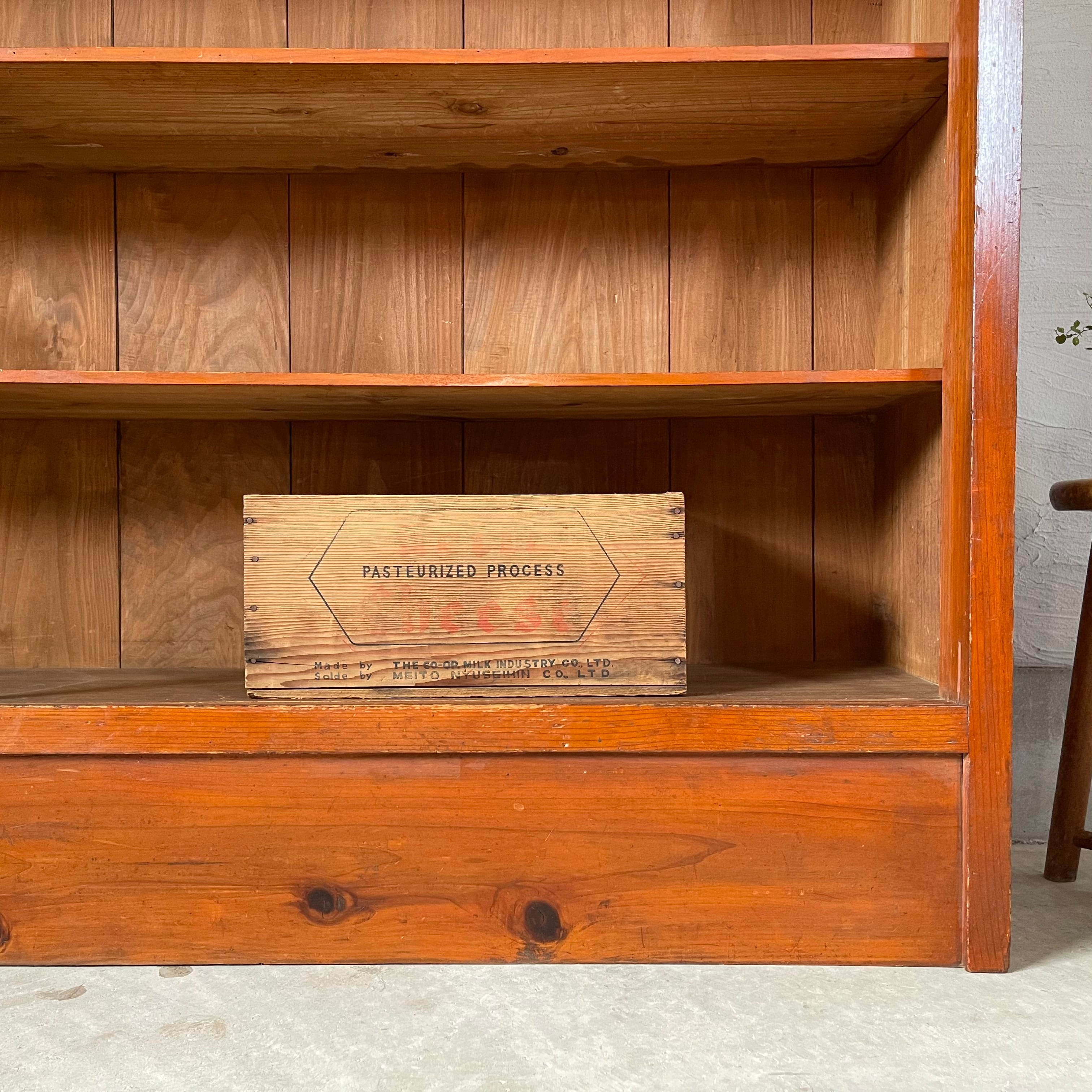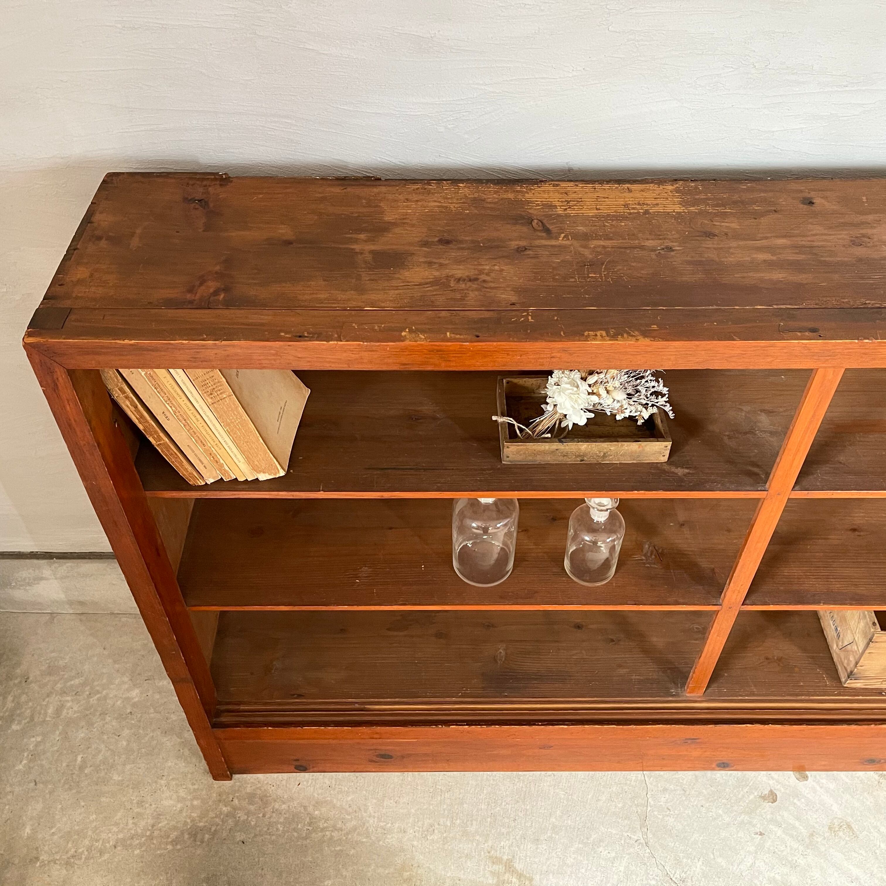 無垢材の温かみのある経年変化とすっきりとした棚板が魅力的な古いカウンターシェルフです。