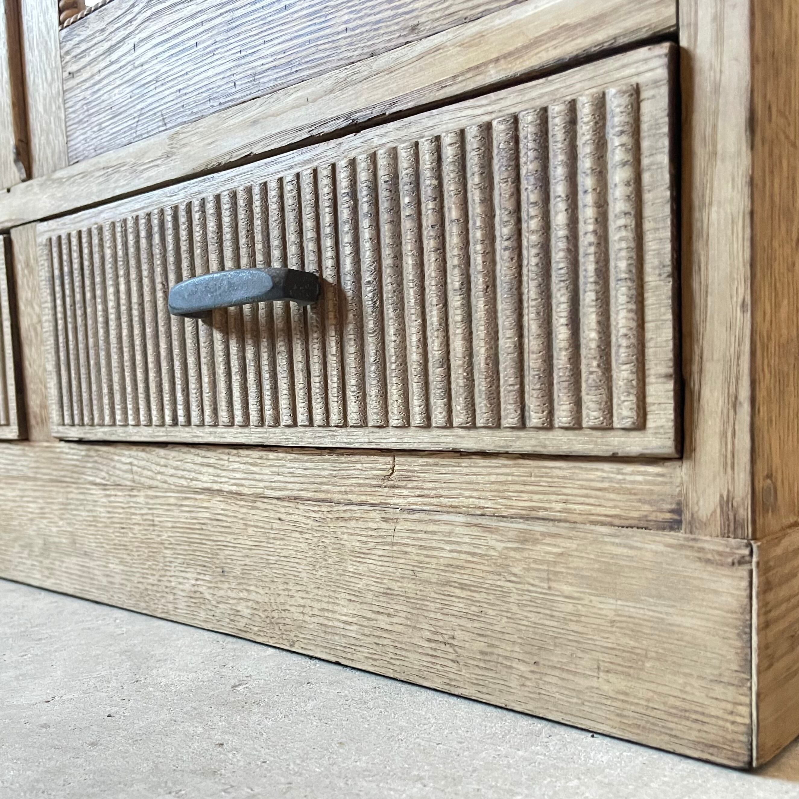 上質な栗材のナチュラルな木味と扉や引き出しに施された精巧な装飾が美しいキャビネットです。