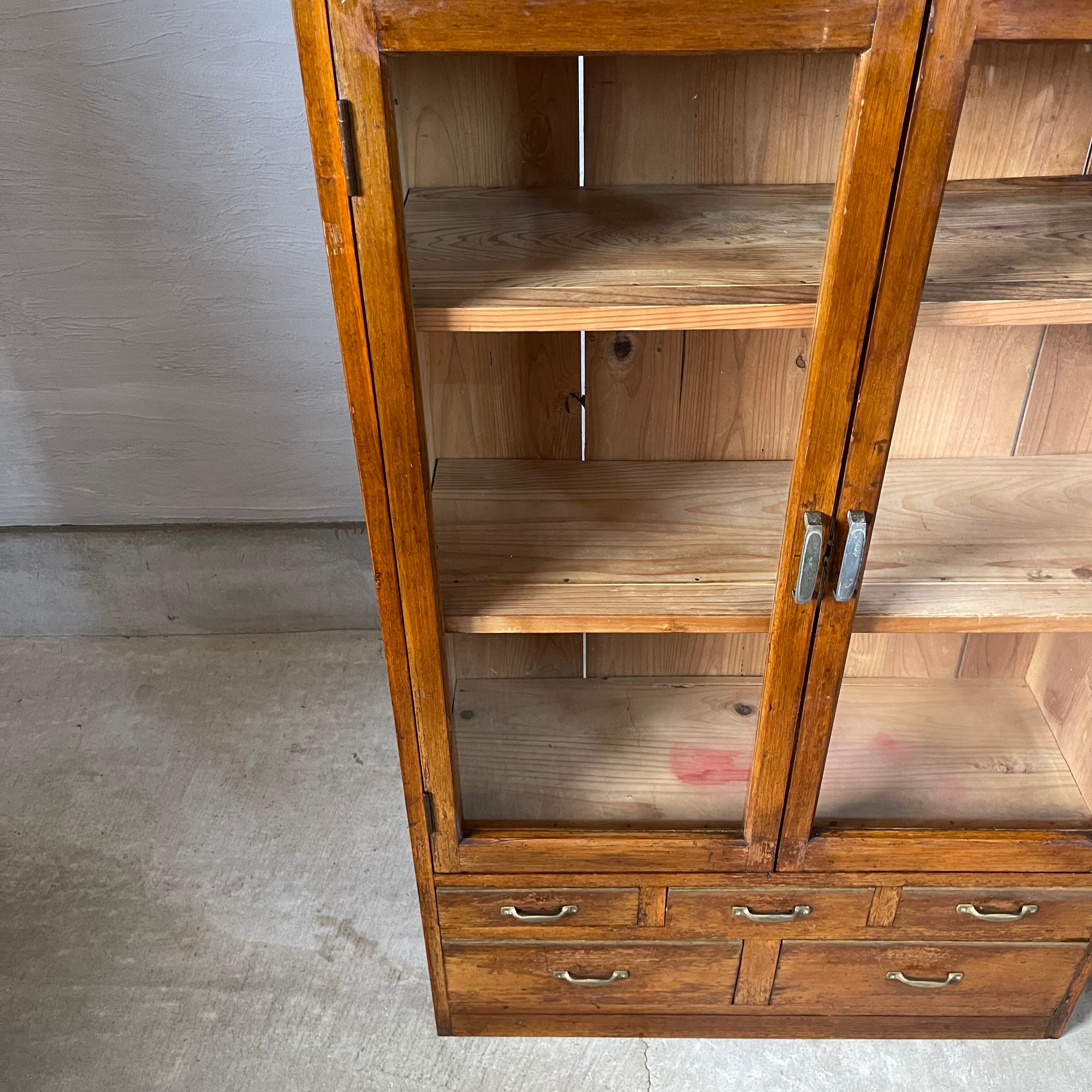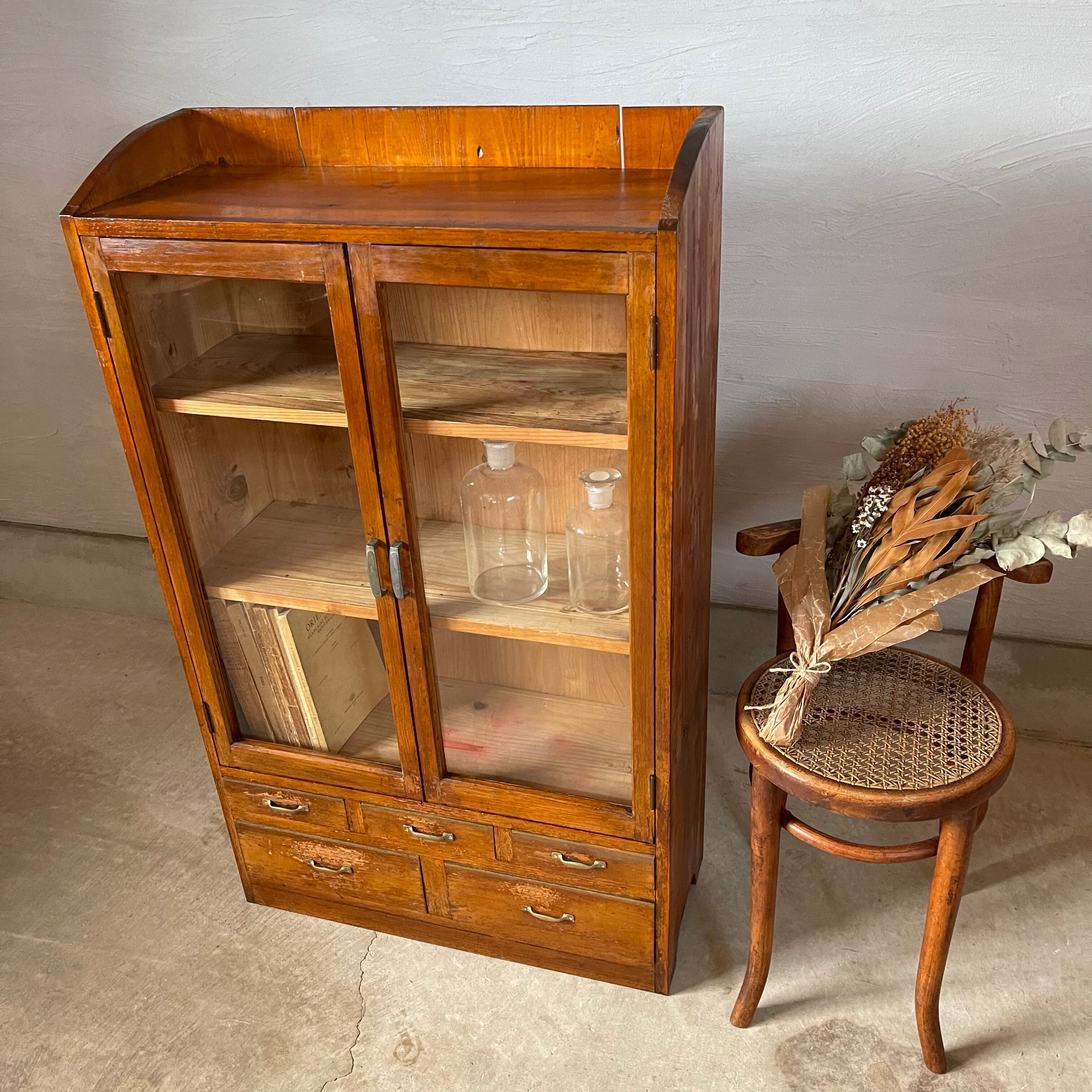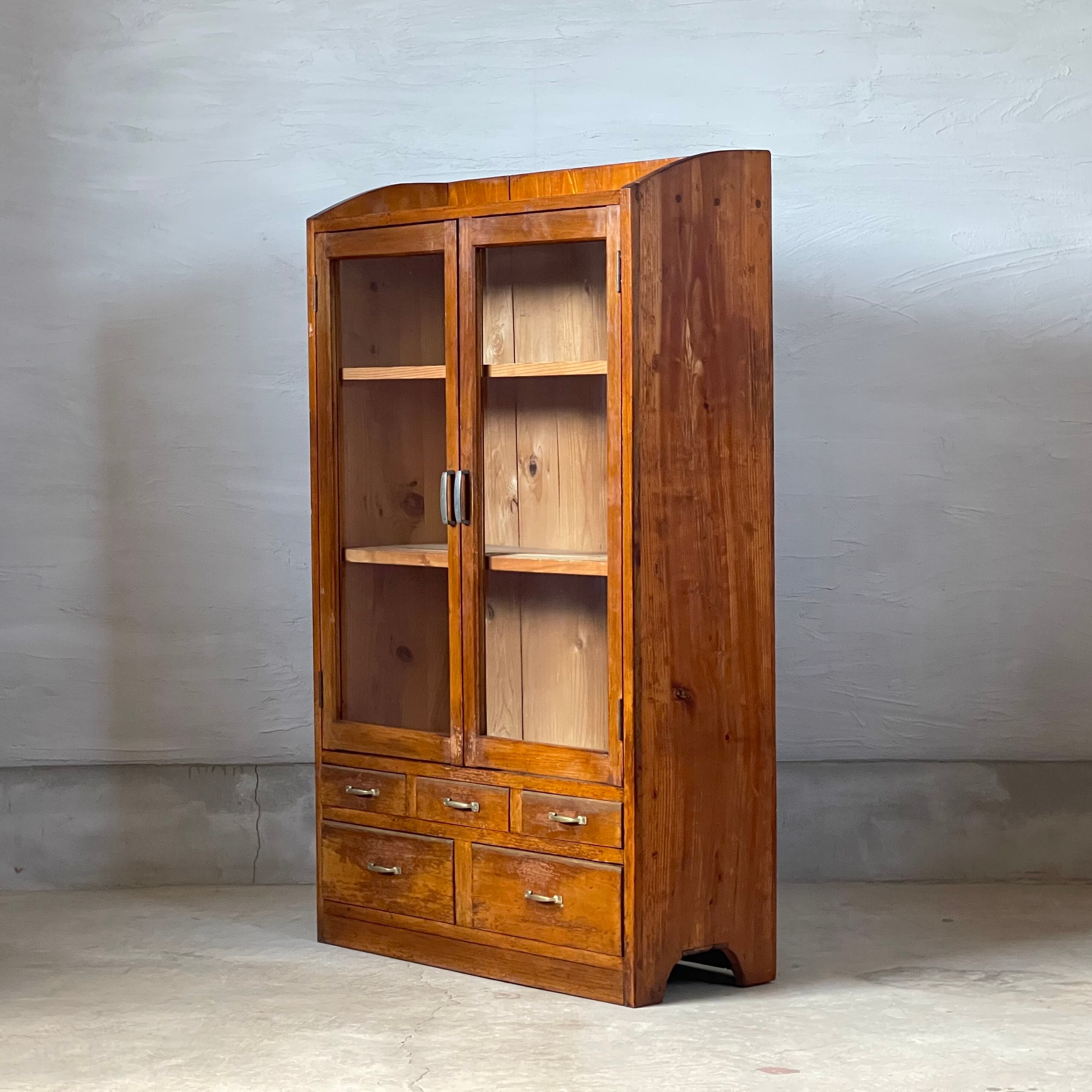 すっきりと大きなガラスの開き戸とその下に並んだ5杯の引き出しが美しいキャビネットです。