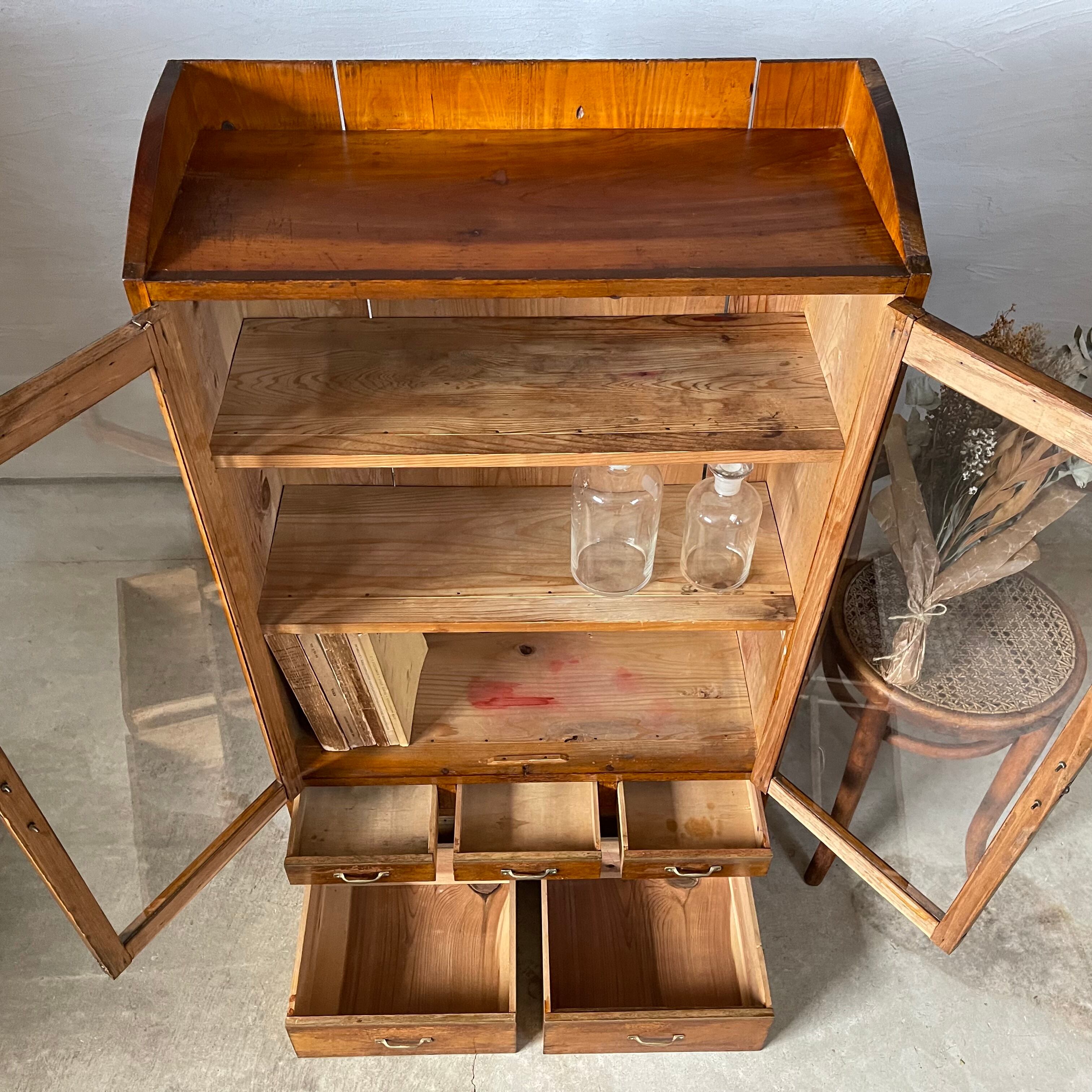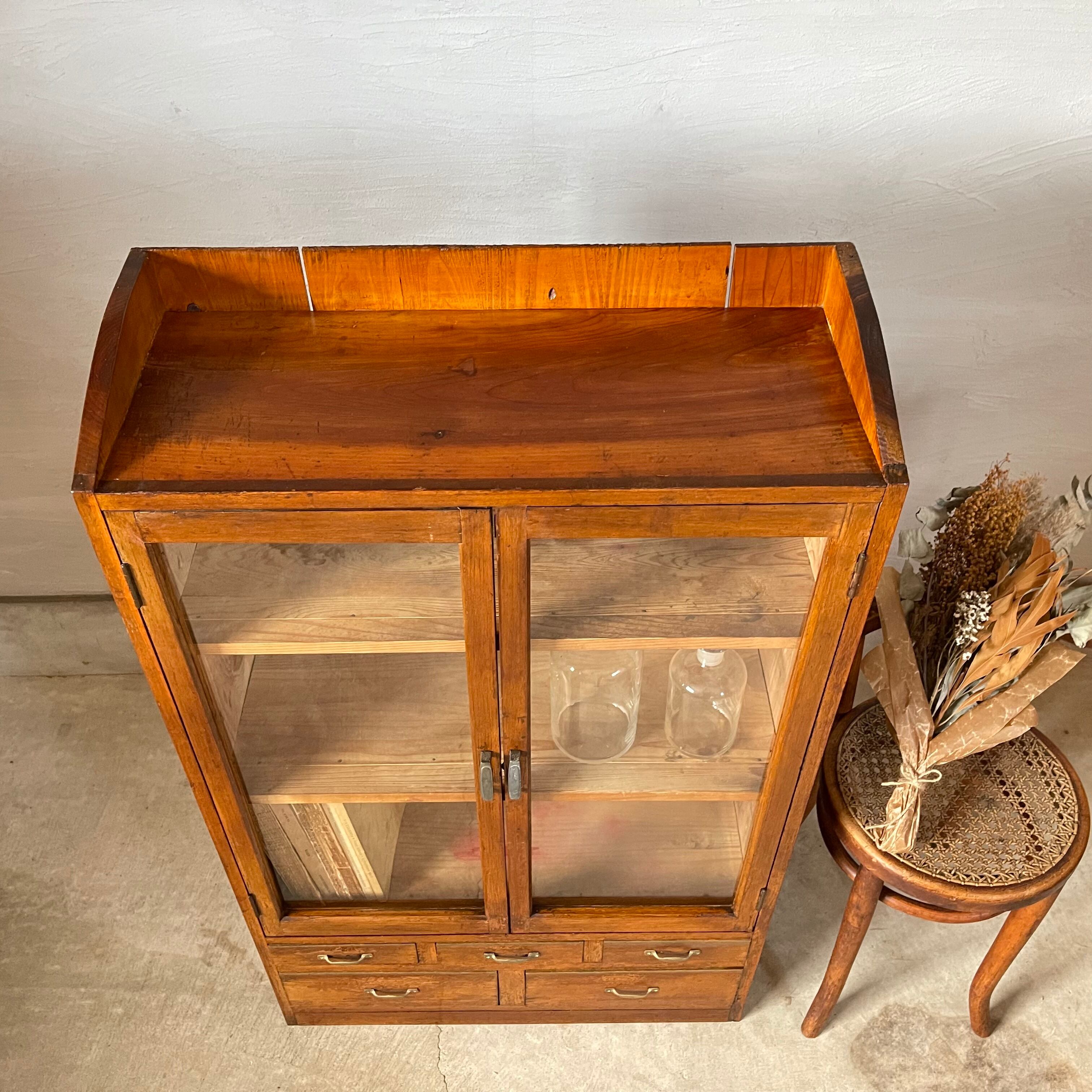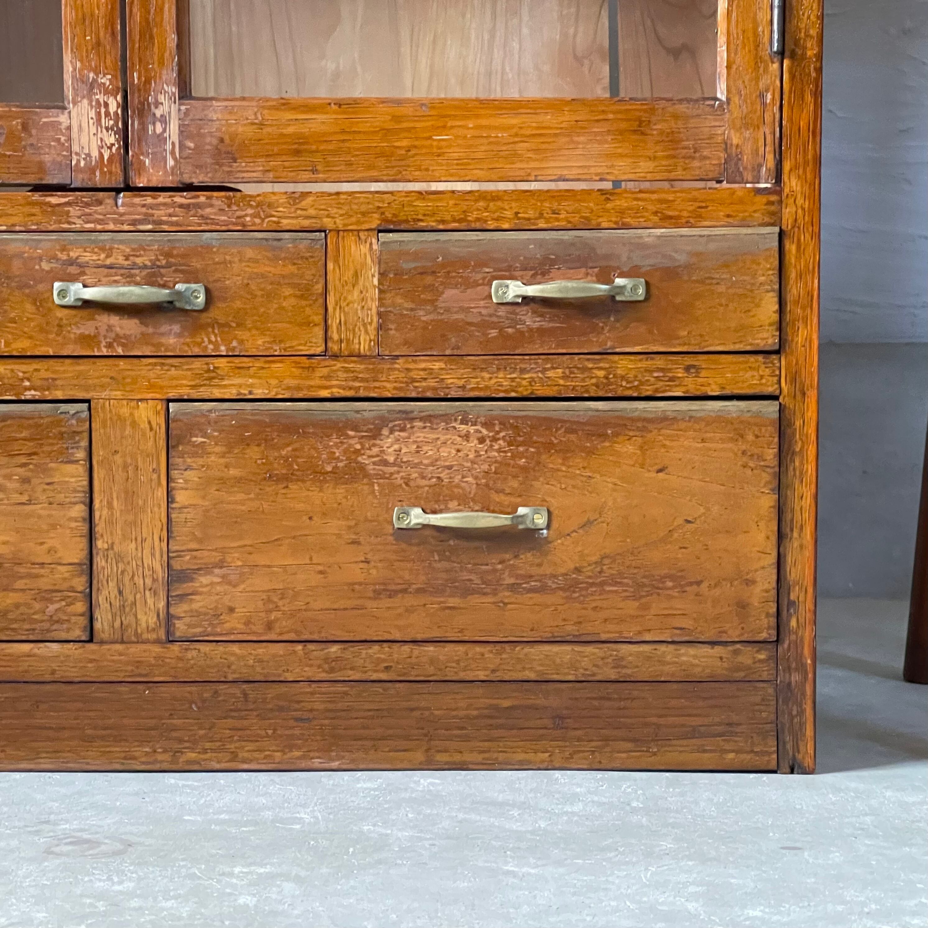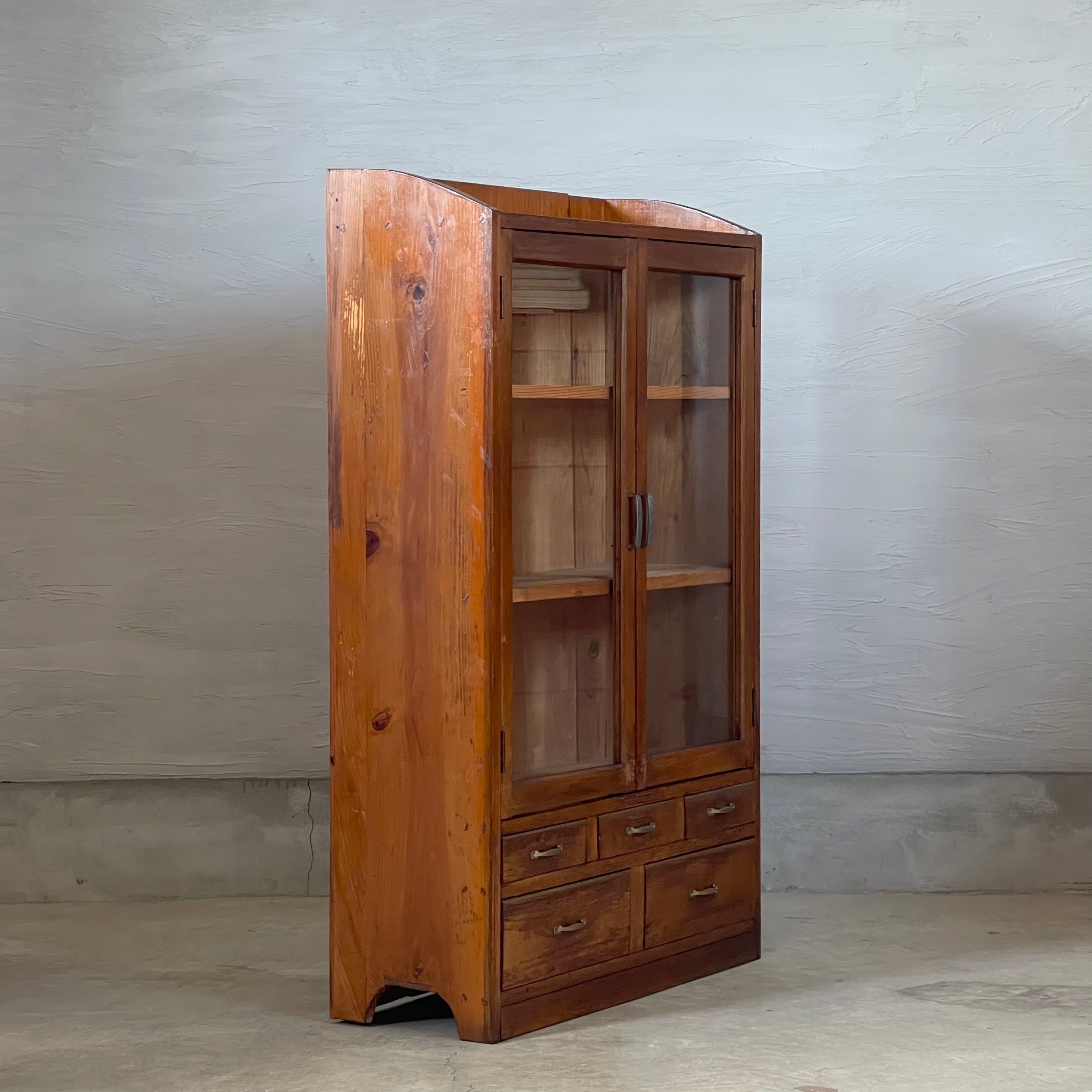 すっきりと大きなガラスの開き戸とその下に並んだ5杯の引き出しが美しいキャビネットです。