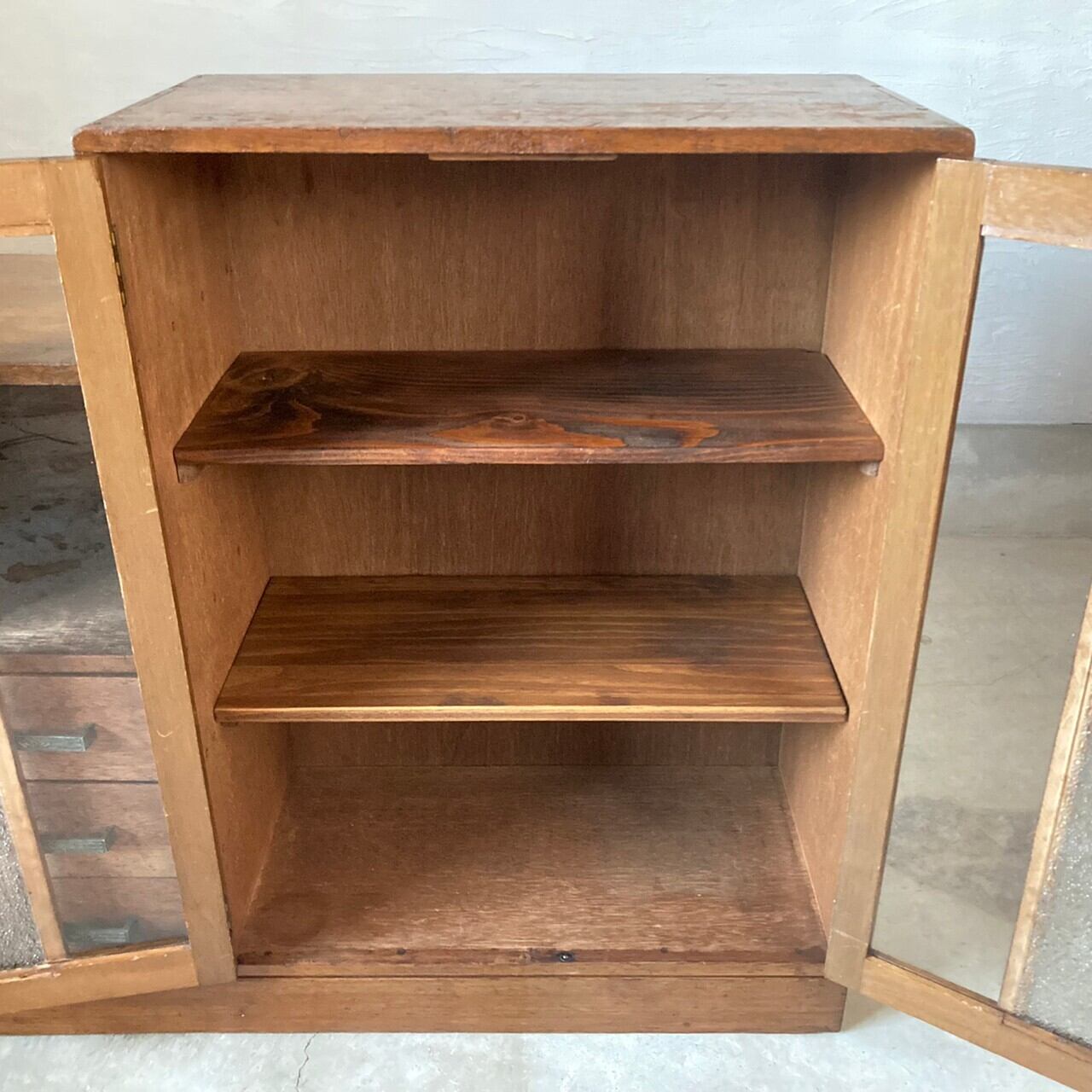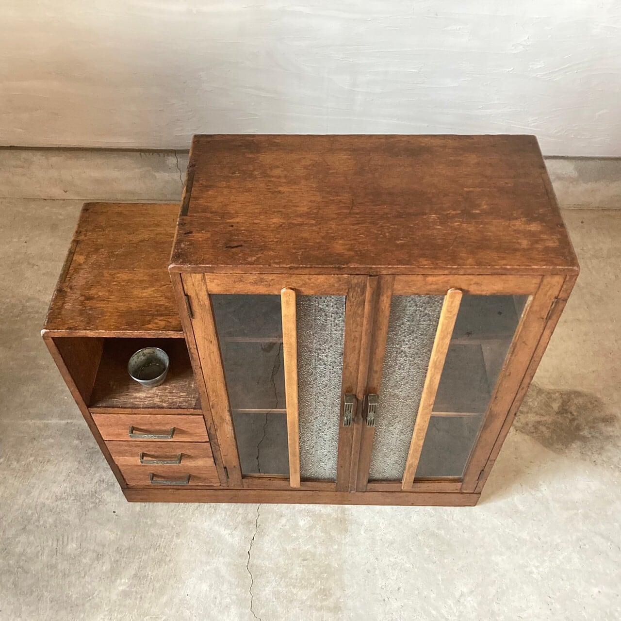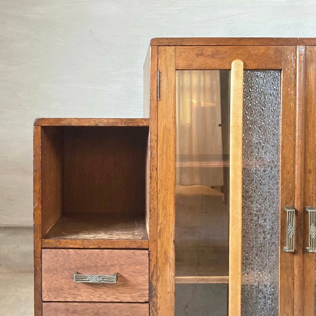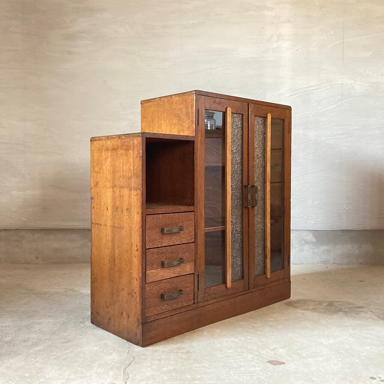 左側に並んだ3杯の引き出し、2種類のガラスが使われた開き戸が美しいキャビネットです。