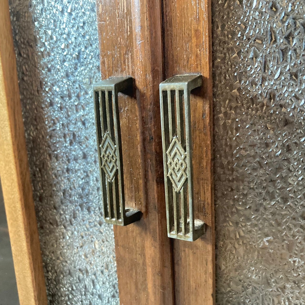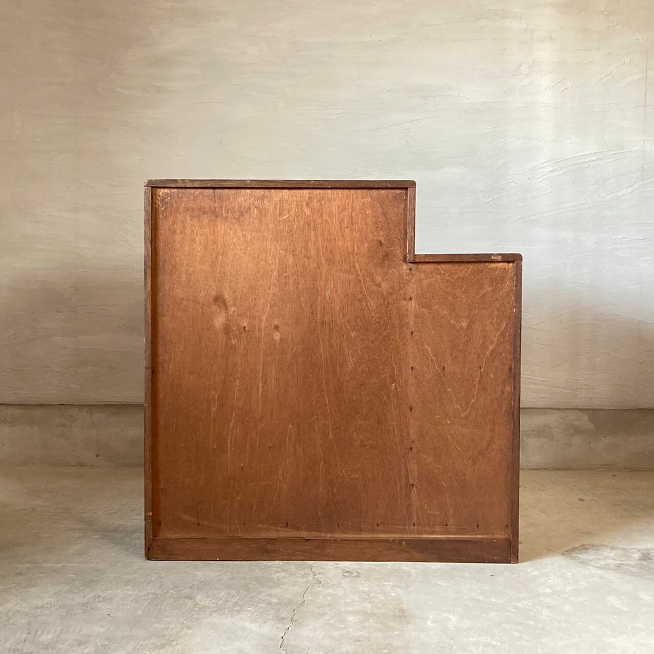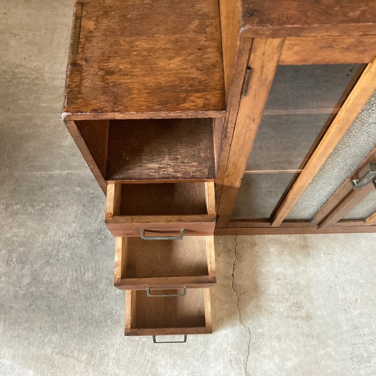 左側に並んだ3杯の引き出し、2種類のガラスが使われた開き戸が美しいキャビネットです。