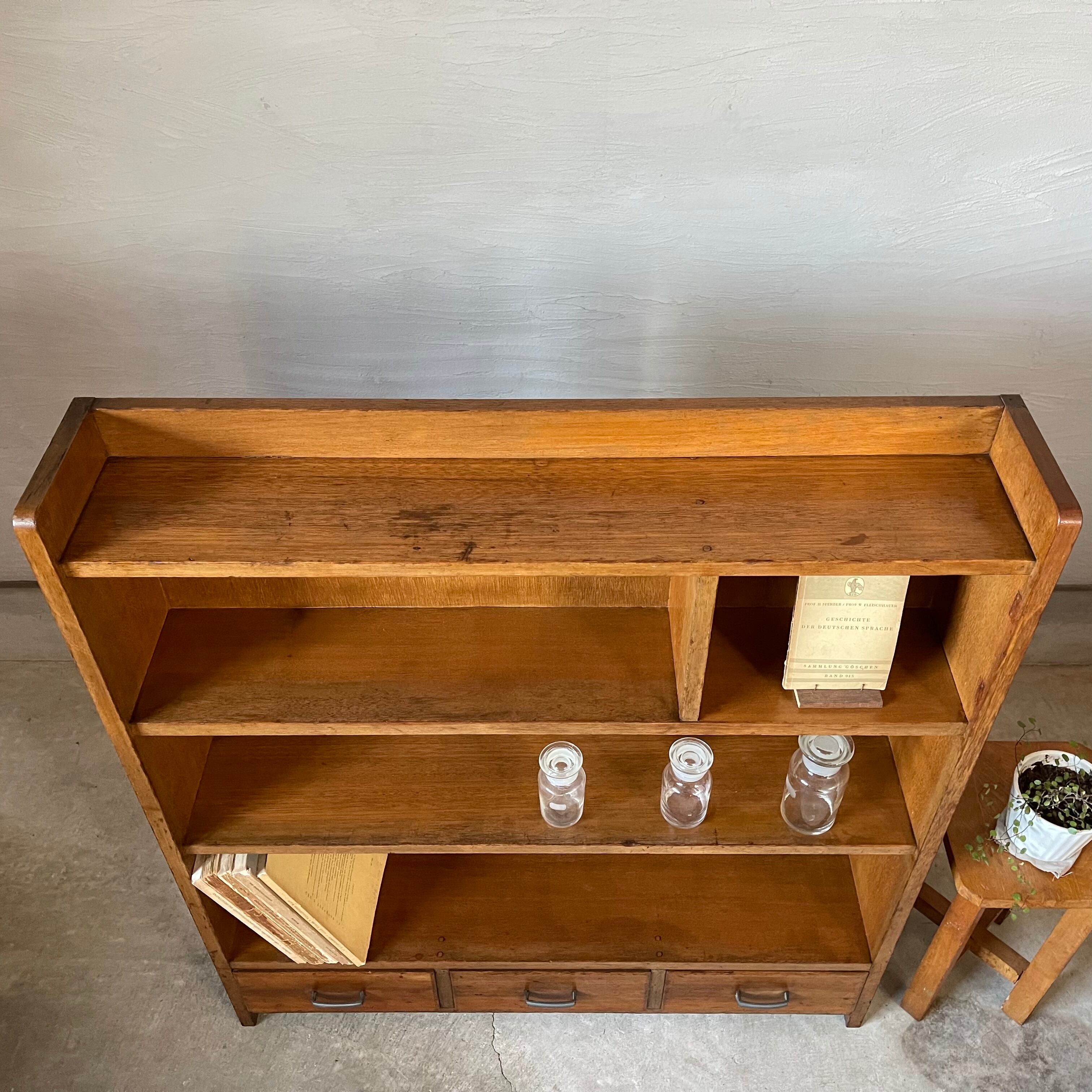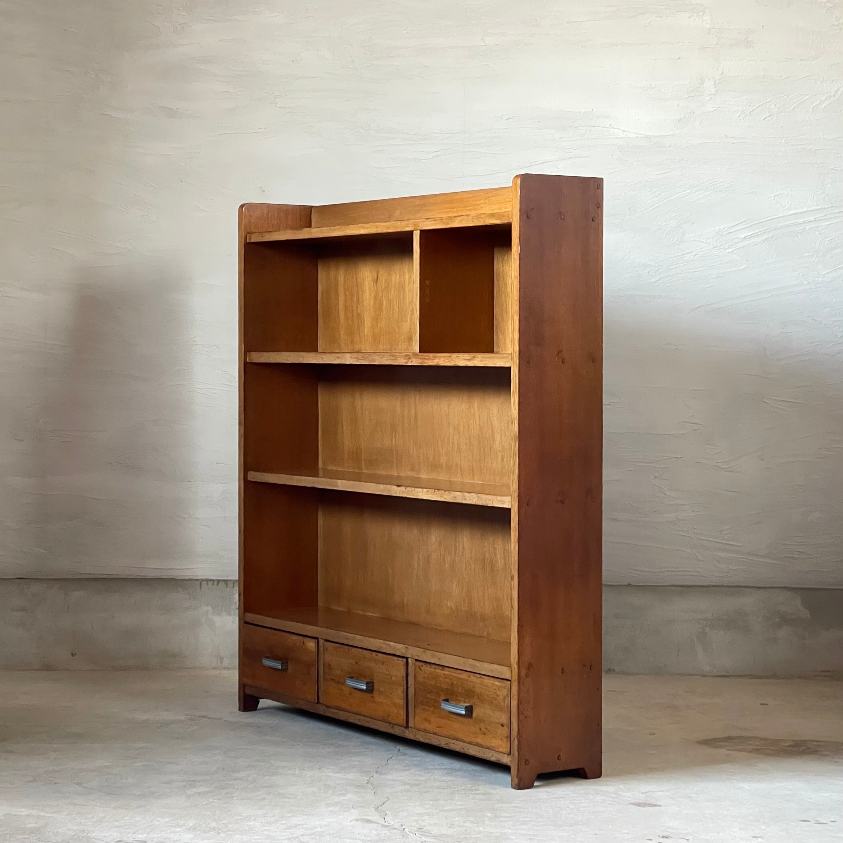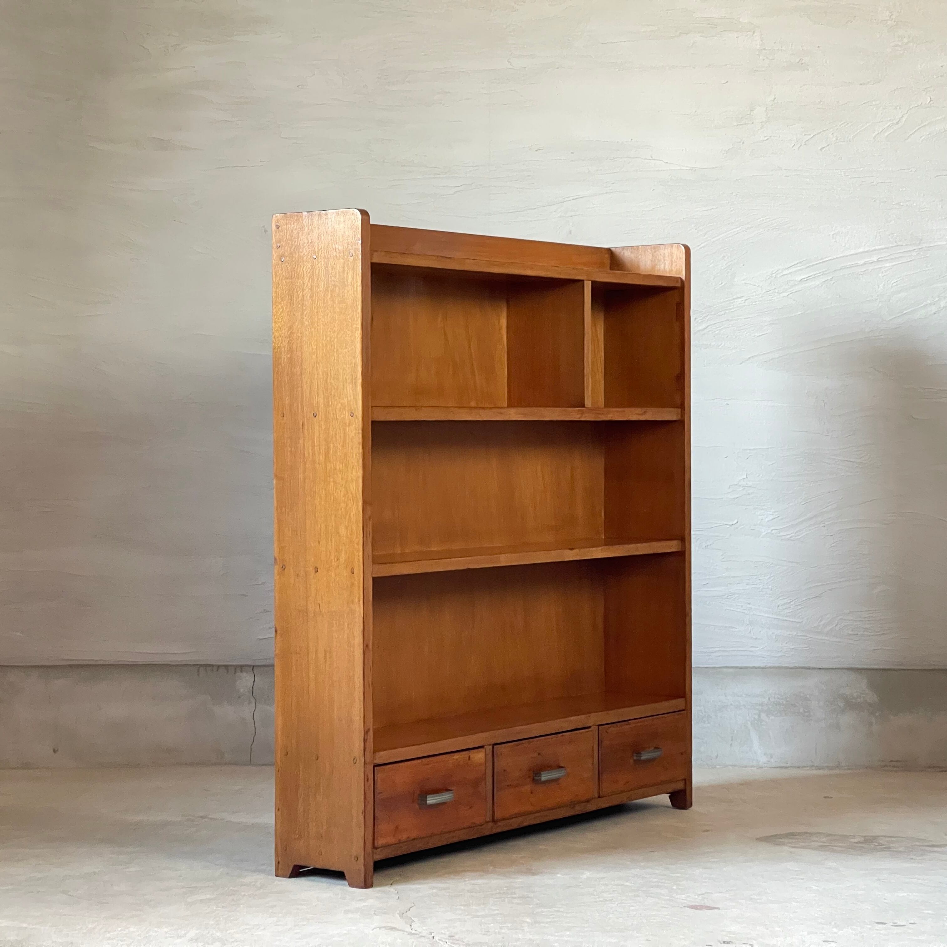 薄型のすっきりとしたデザインと下に並んだ3杯の引き出しが魅力的なブックシェルフです。