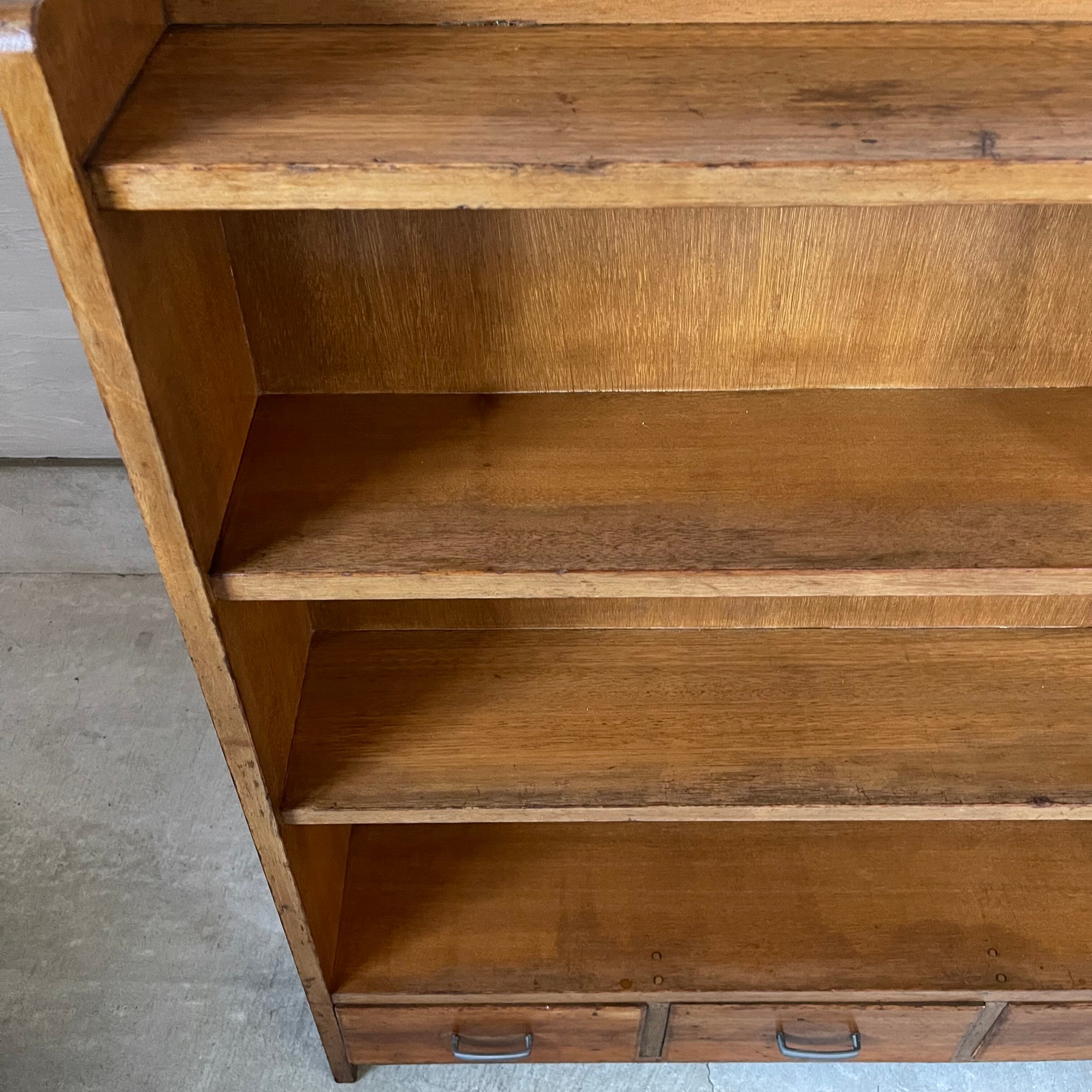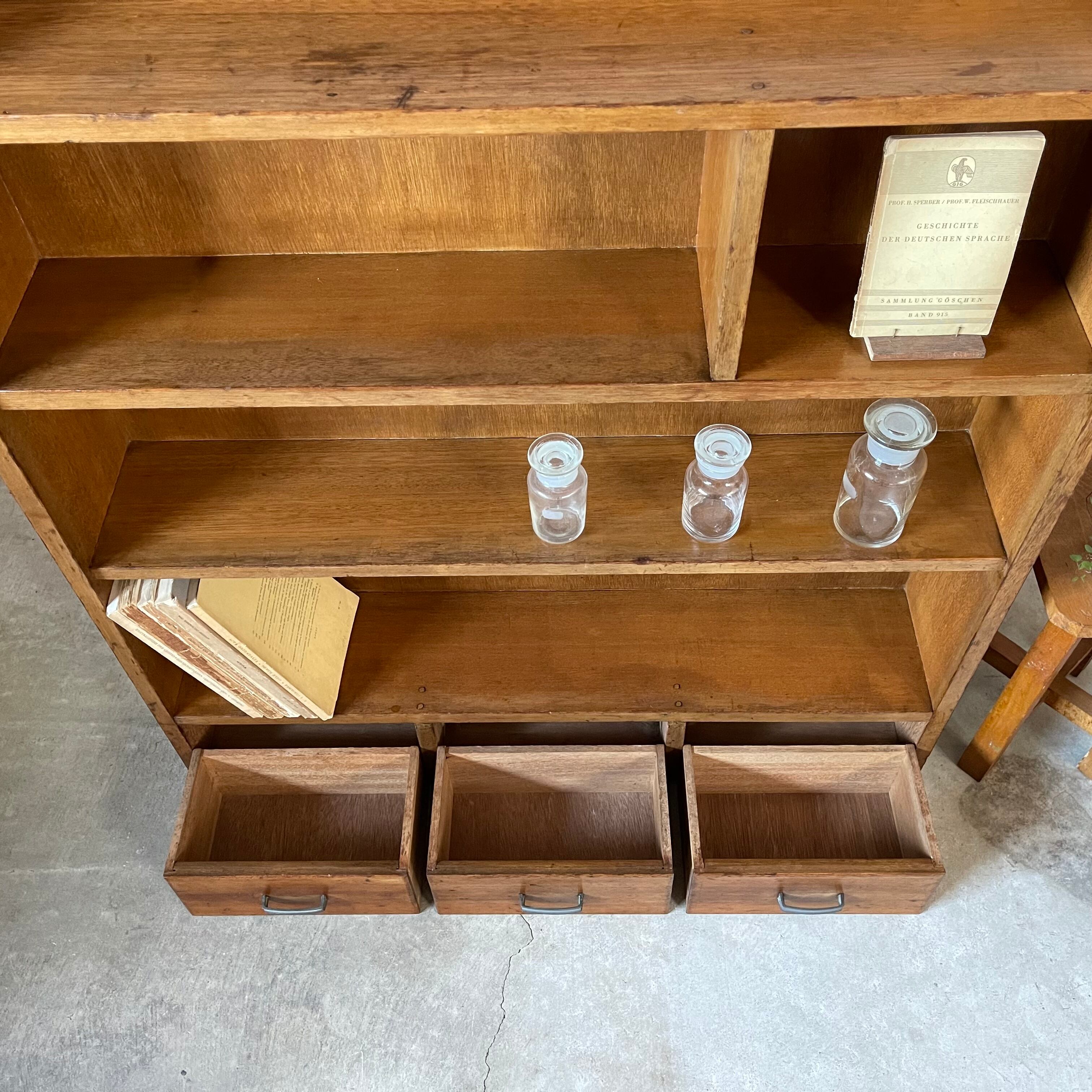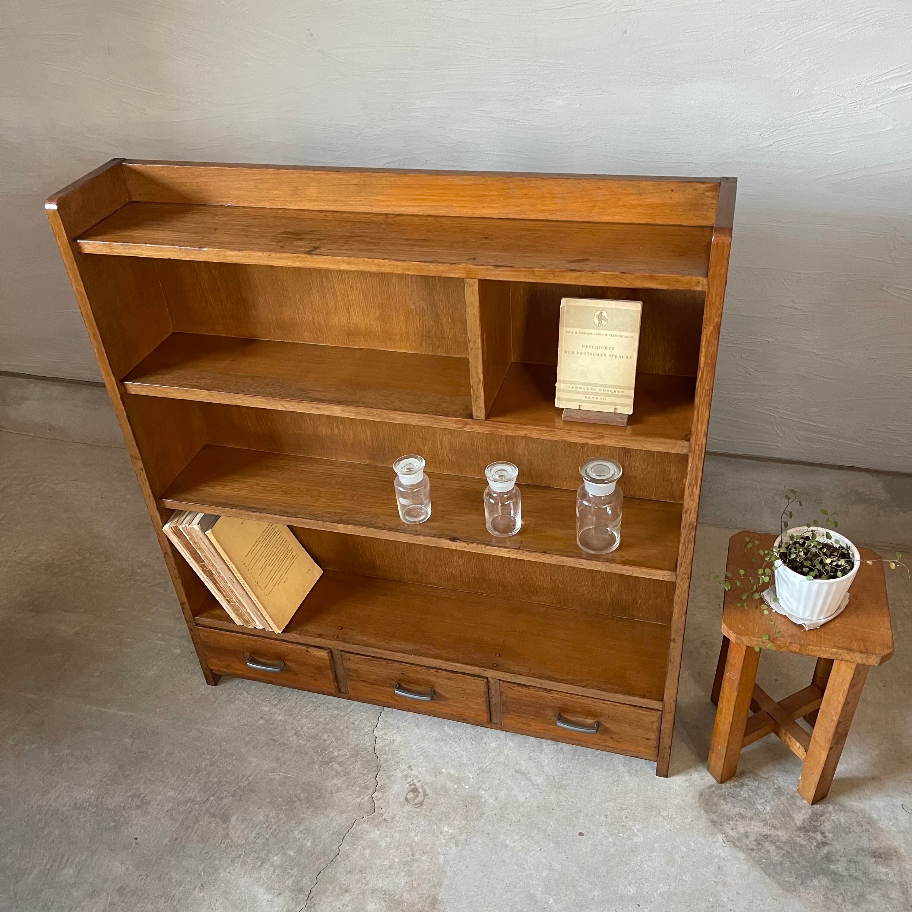 薄型のすっきりとしたデザインと下に並んだ3杯の引き出しが魅力的なブックシェルフです。