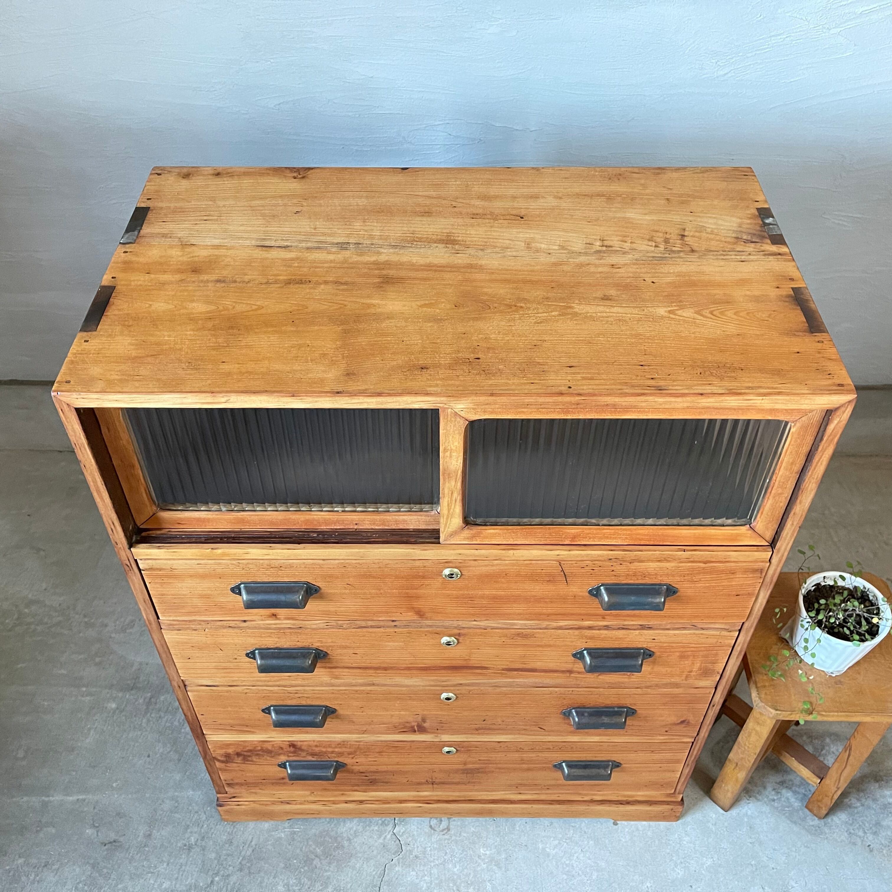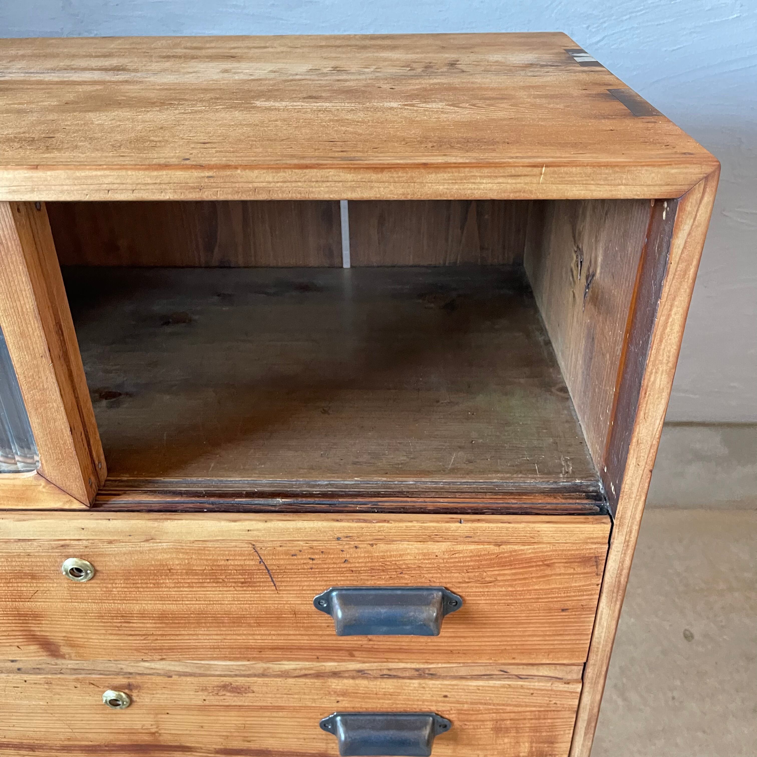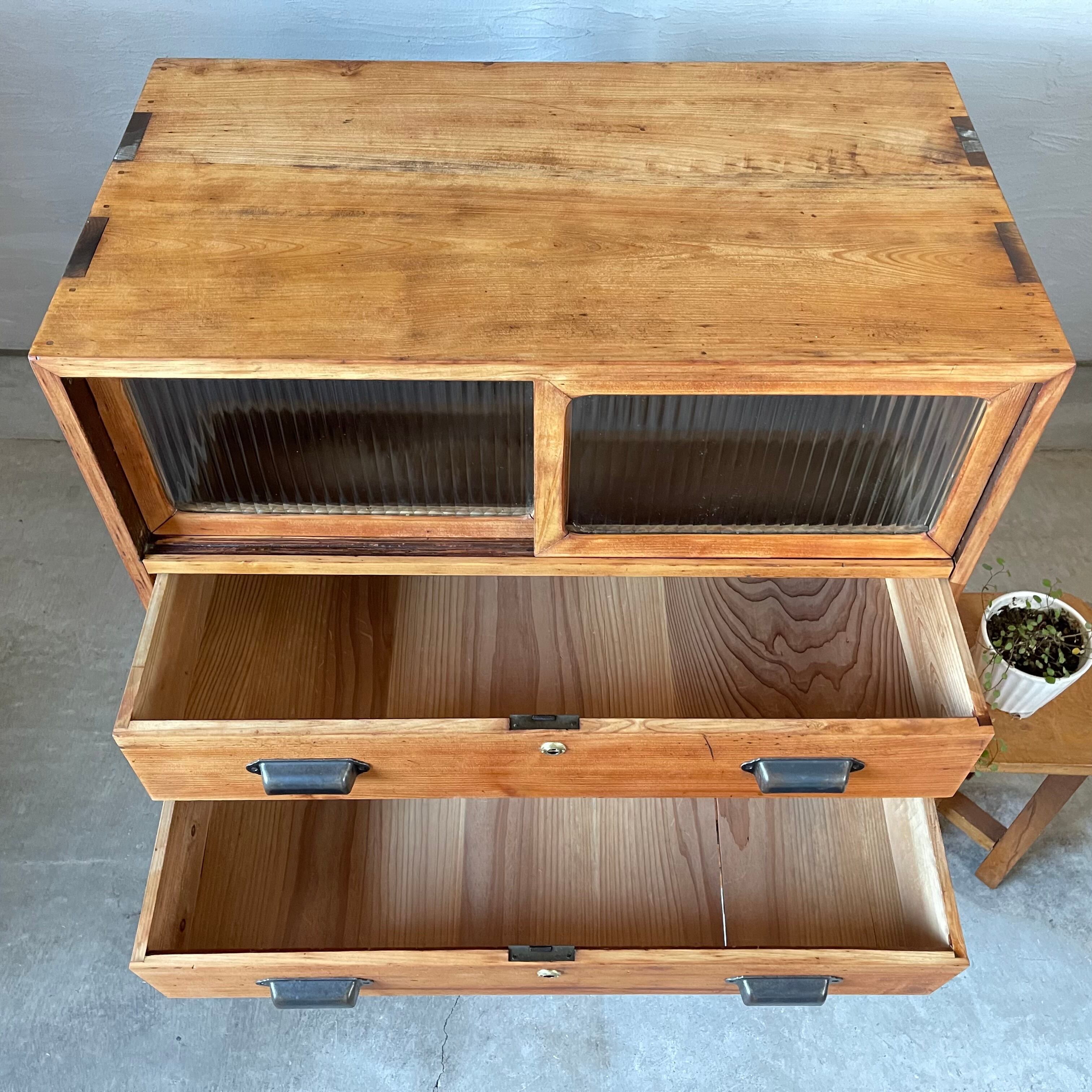 無垢材のナチュラルな木味ときらきらと光を反射するモールガラス、並んだ金属の取手が美しい収納棚です。
