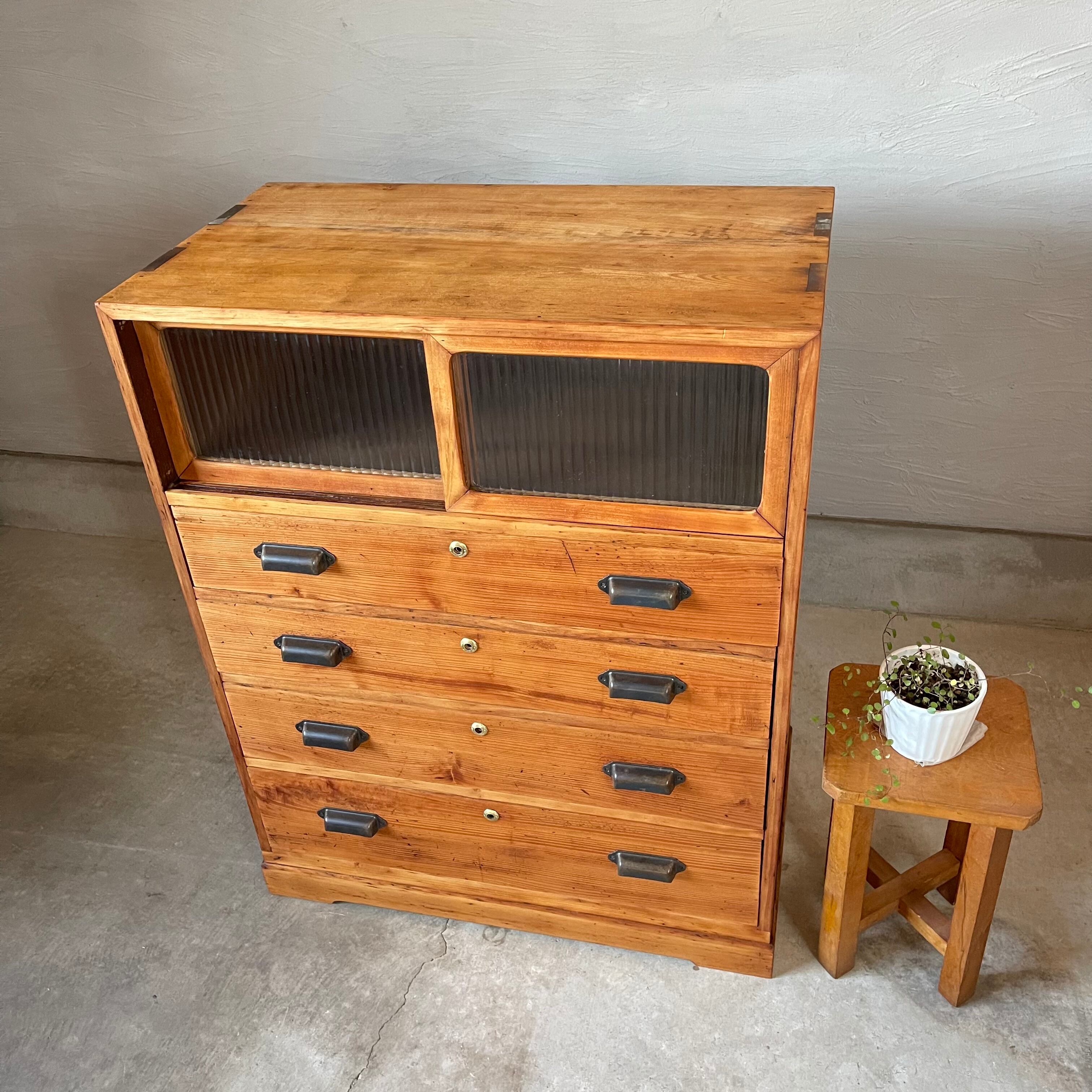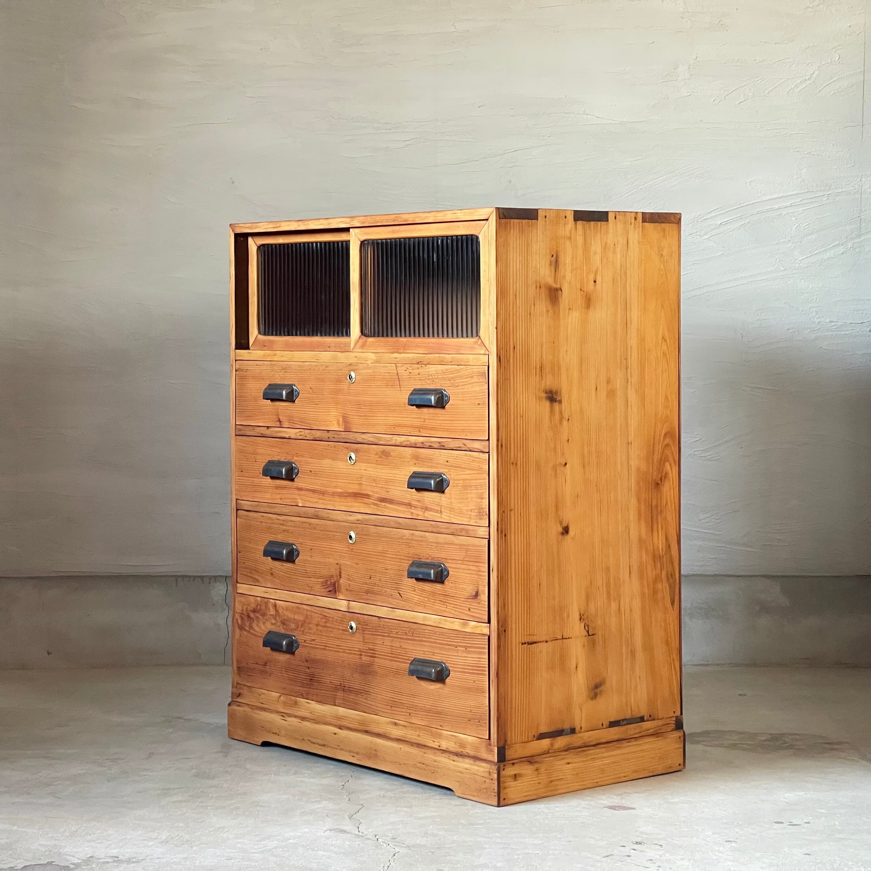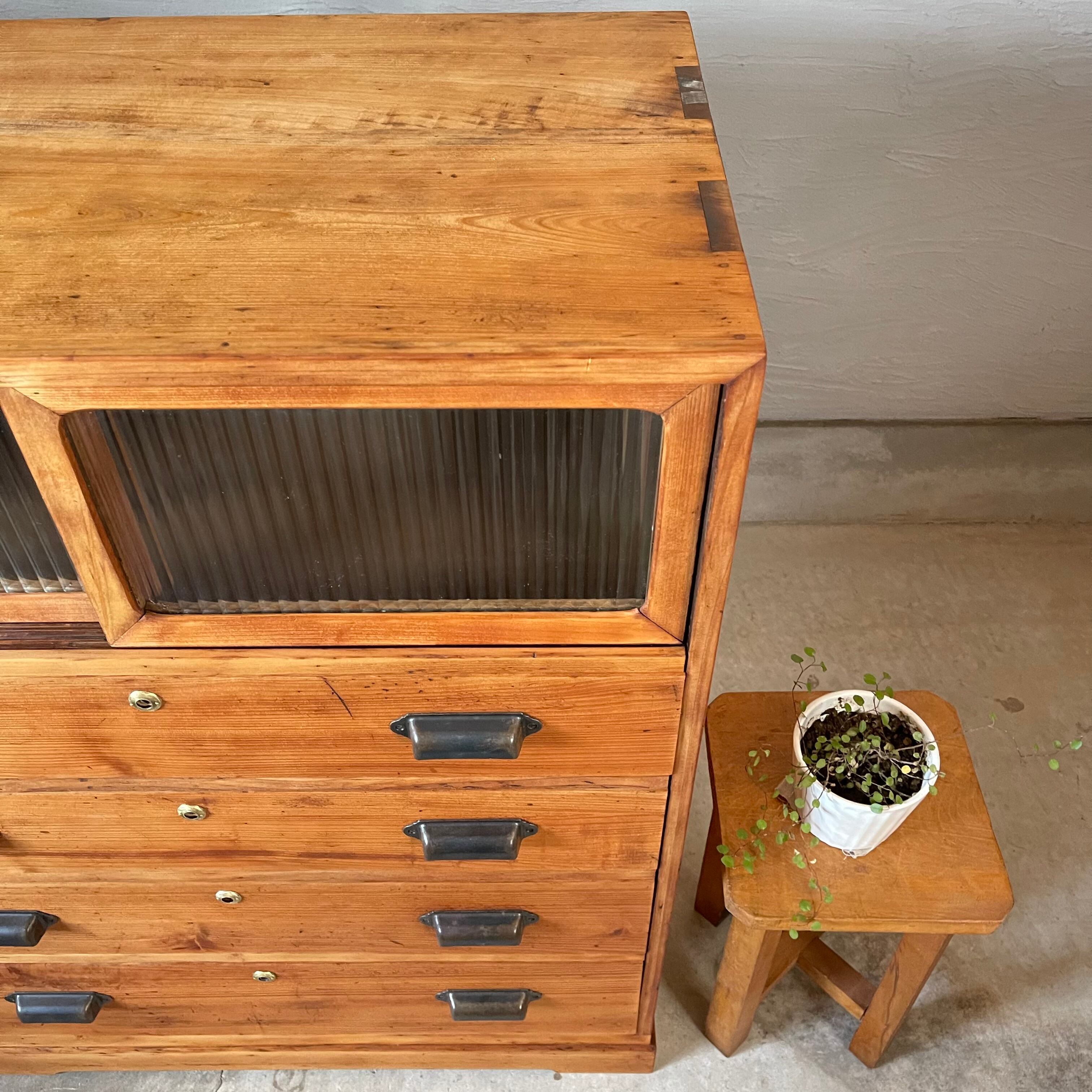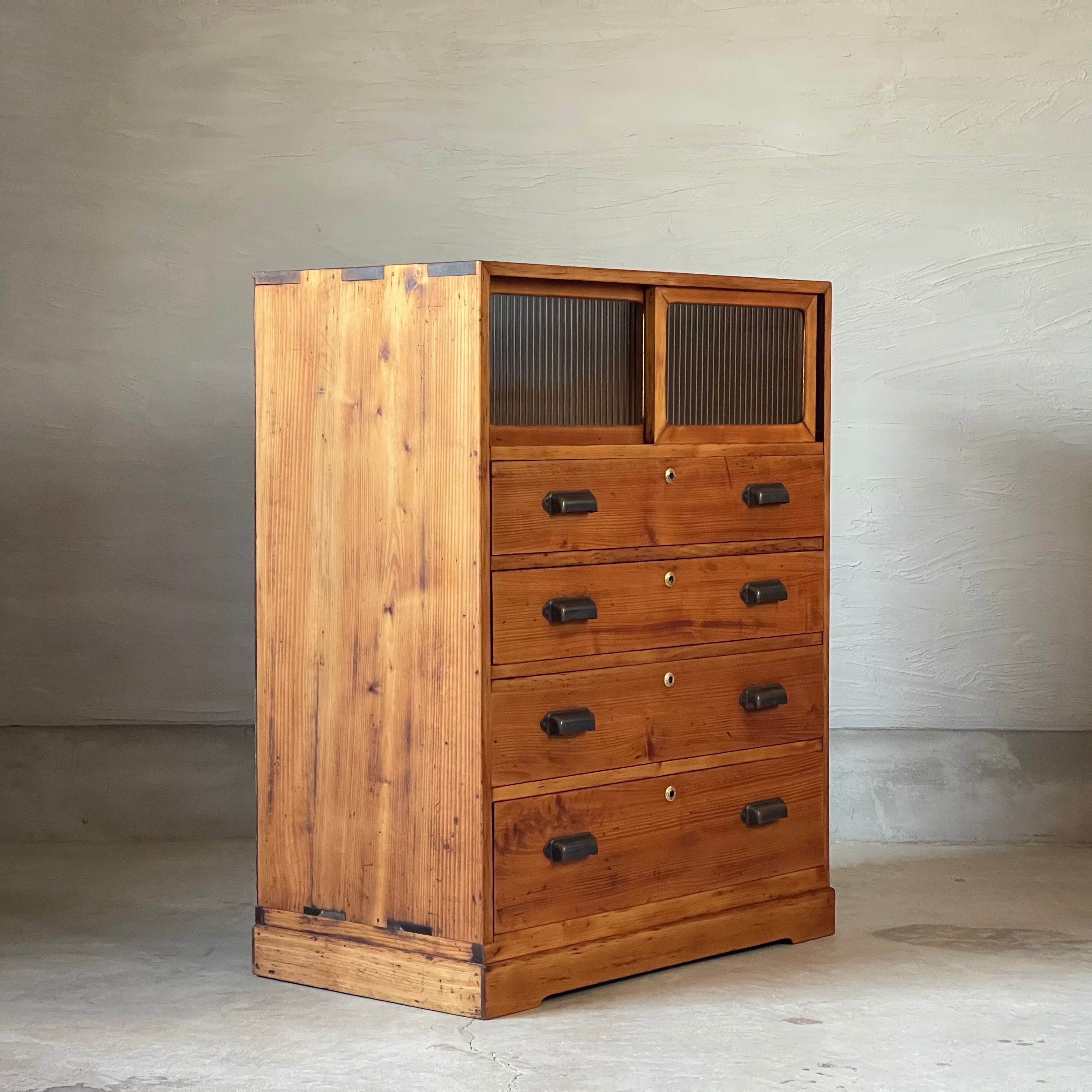 無垢材のナチュラルな木味ときらきらと光を反射するモールガラス、並んだ金属の取手が美しい収納棚です。