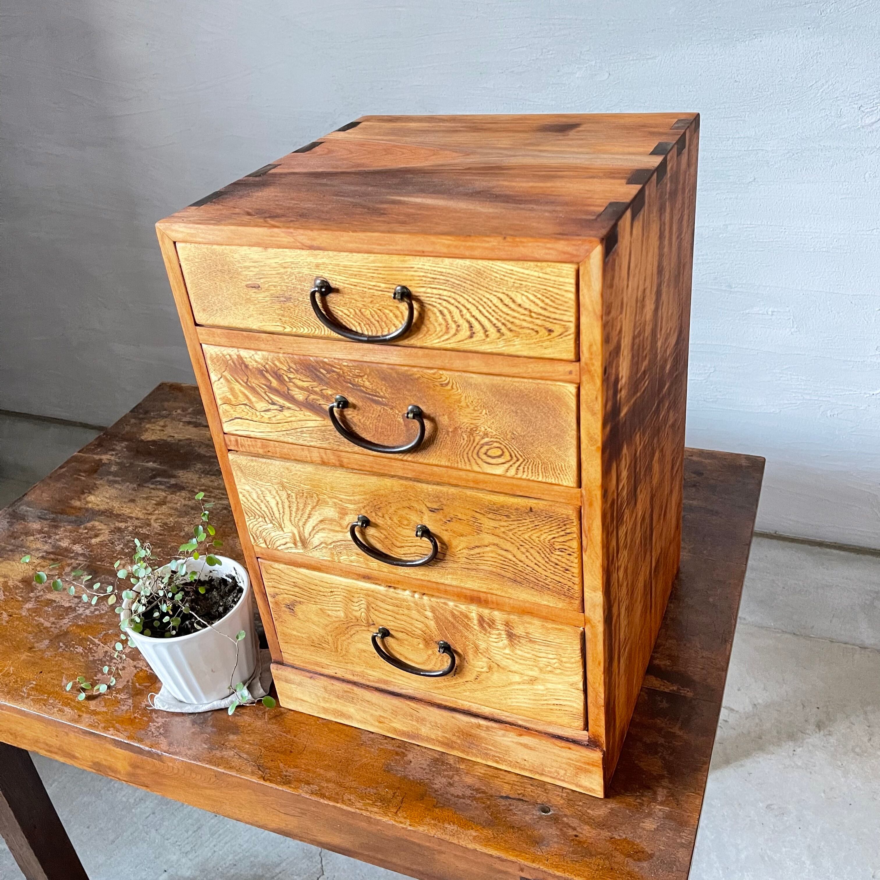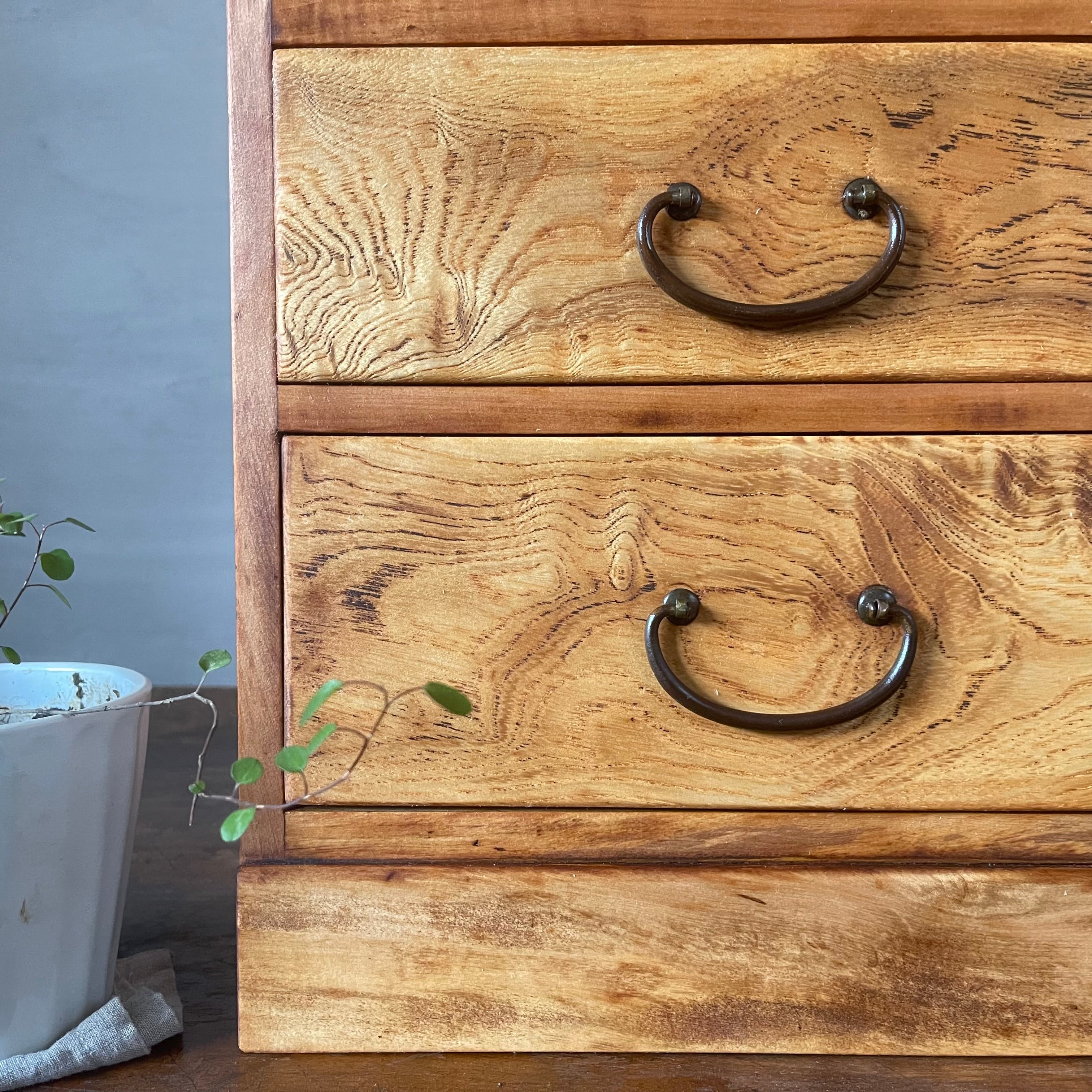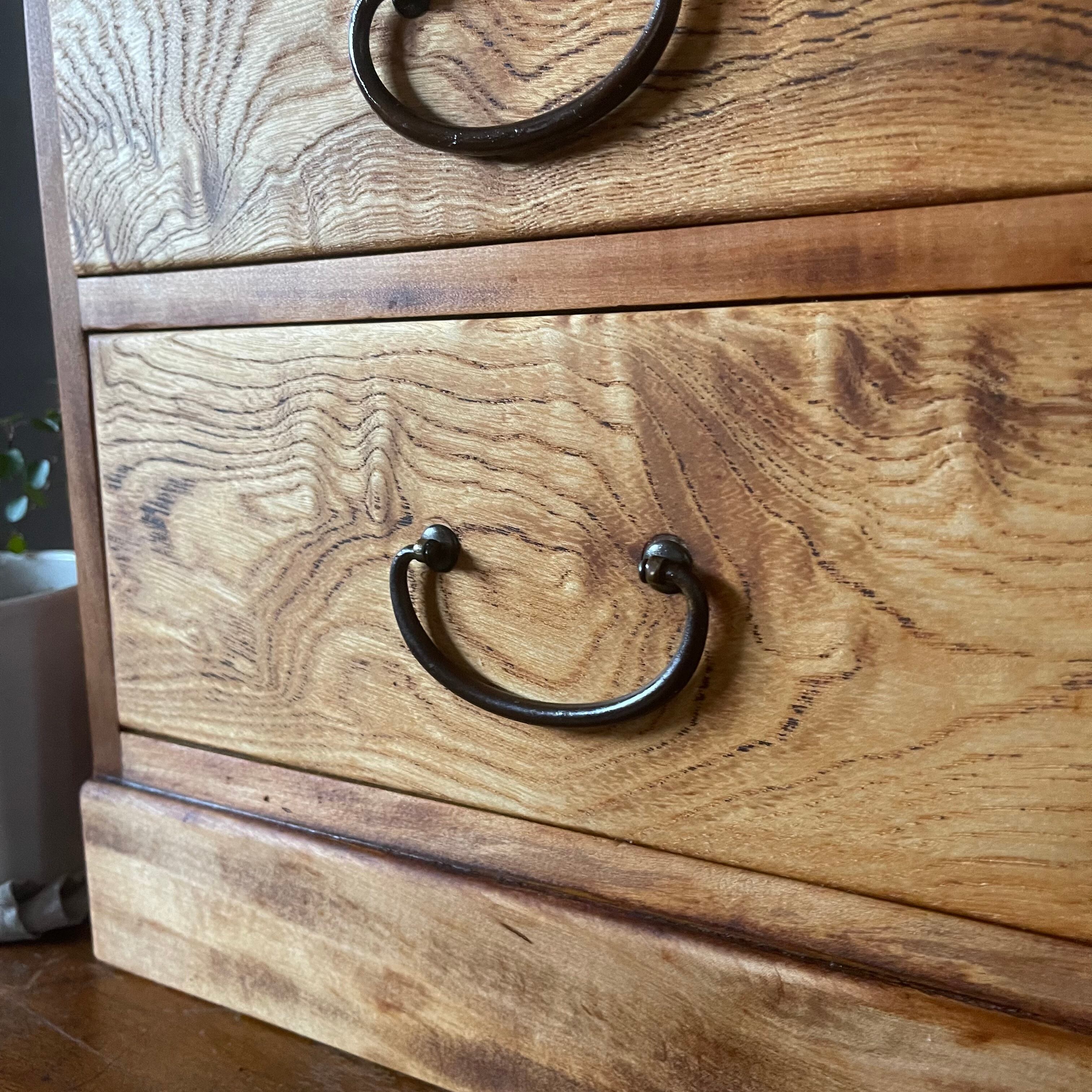 ナチュラルな木味と並んだ黒い金属の取手が可愛らしい4杯の引き出しです。