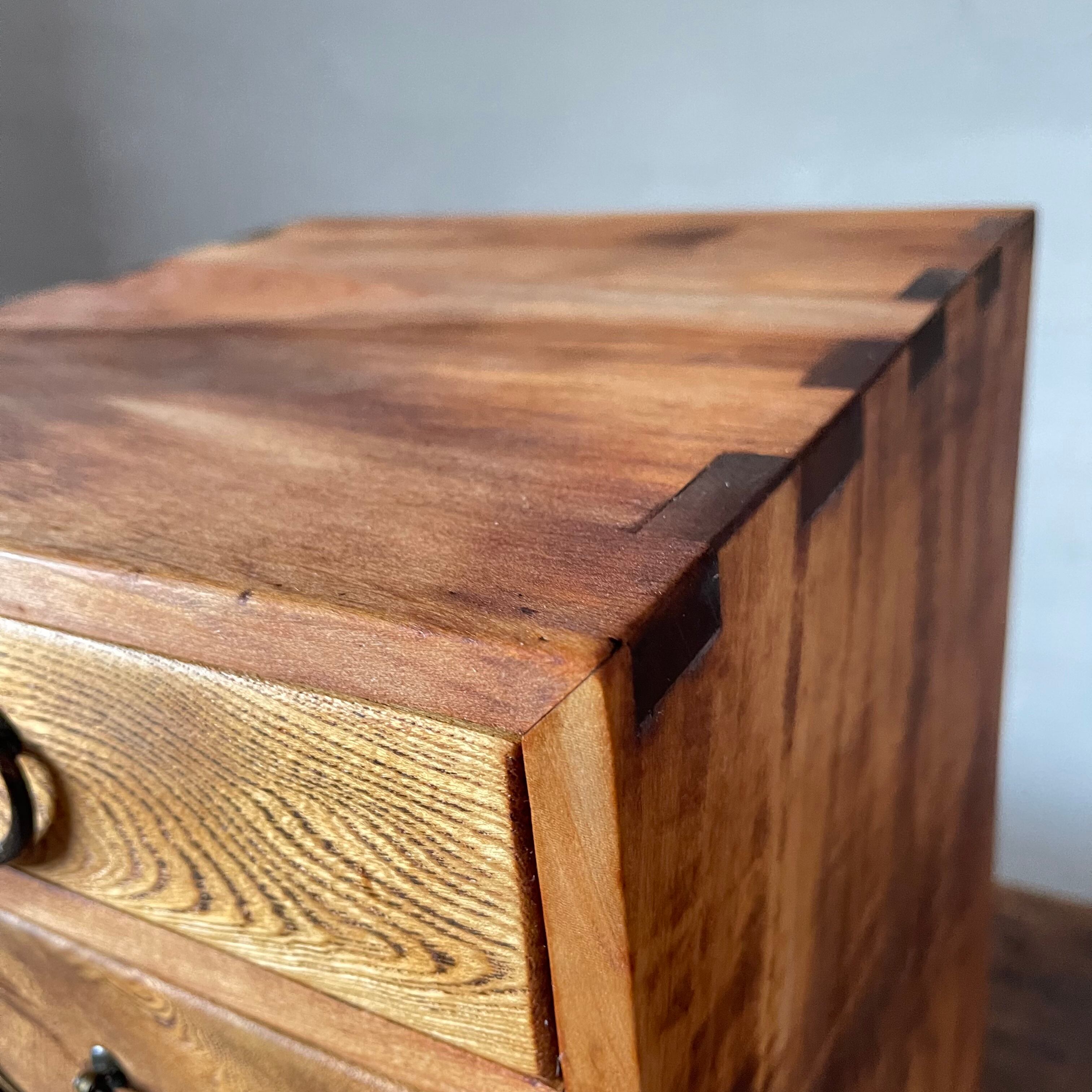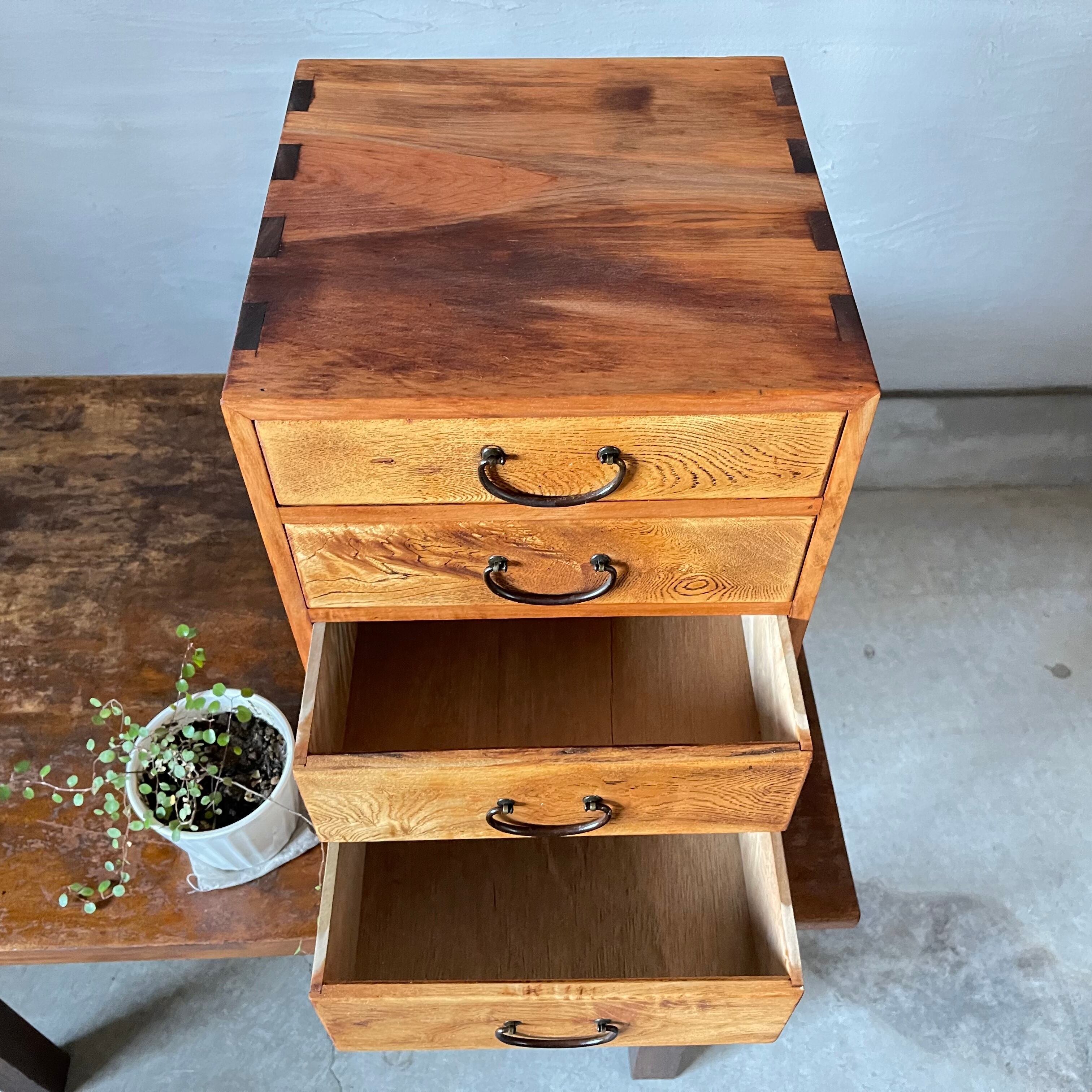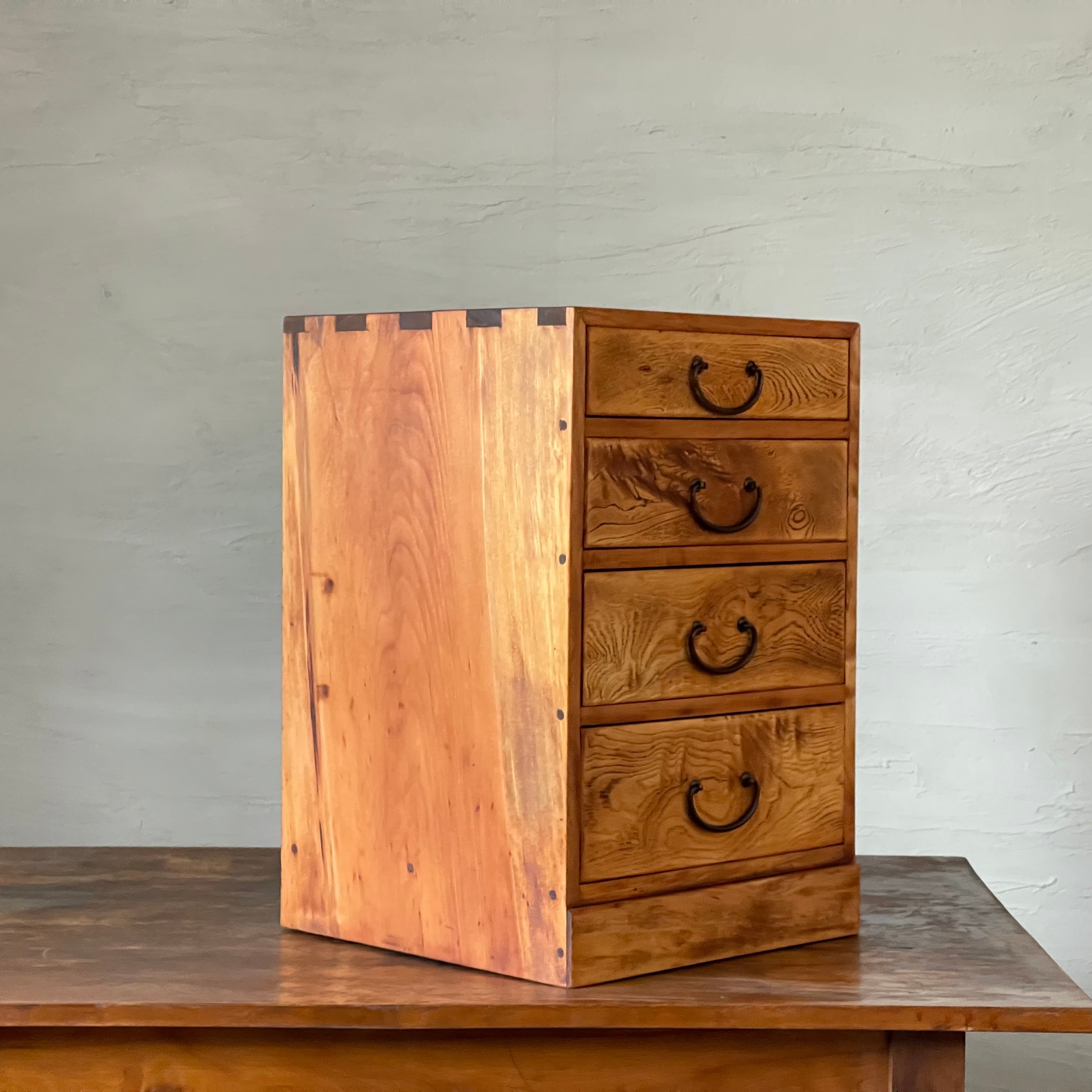 ナチュラルな木味と並んだ黒い金属の取手が可愛らしい4杯の引き出しです。