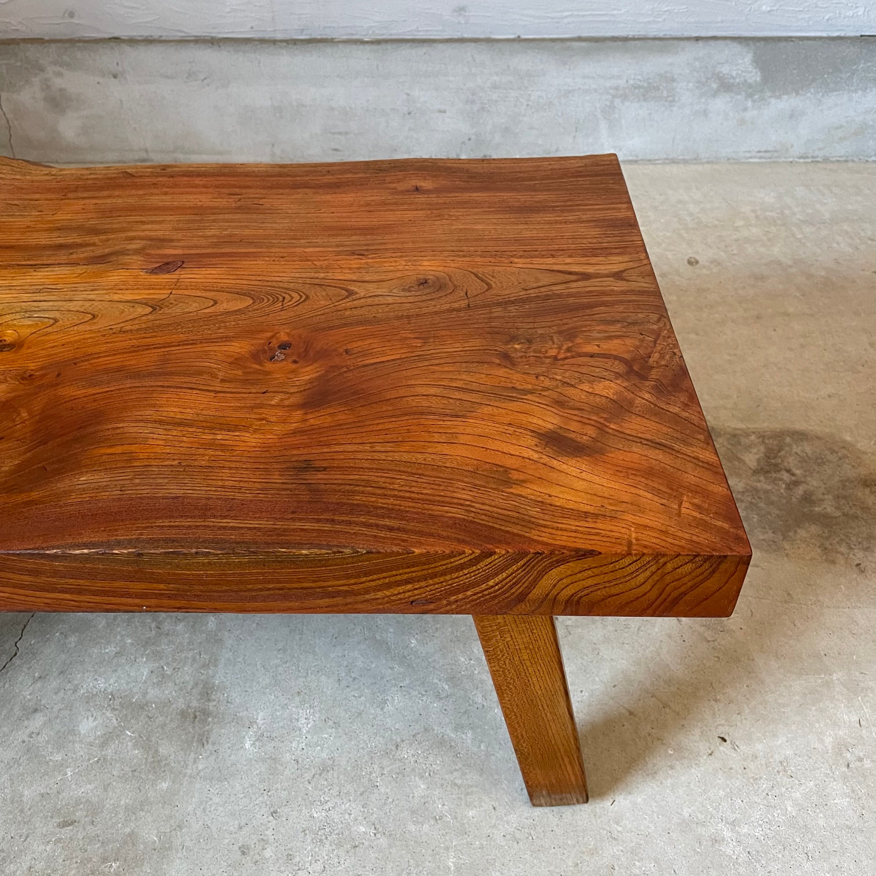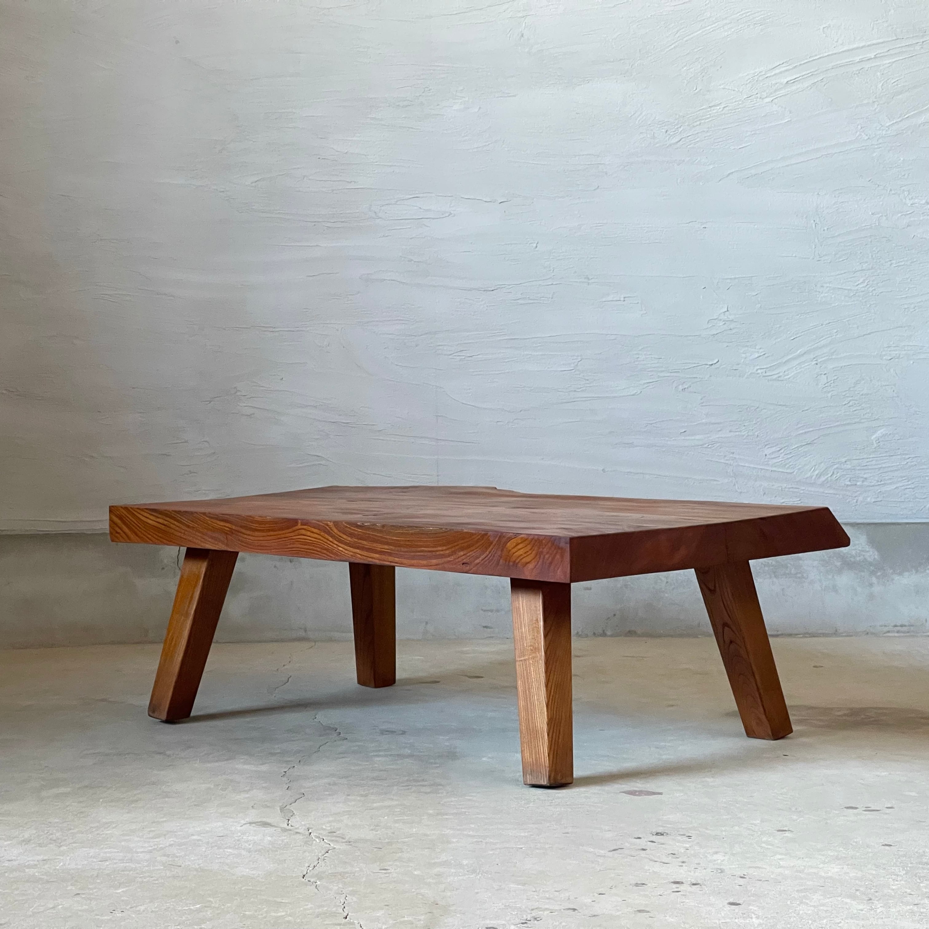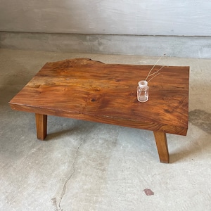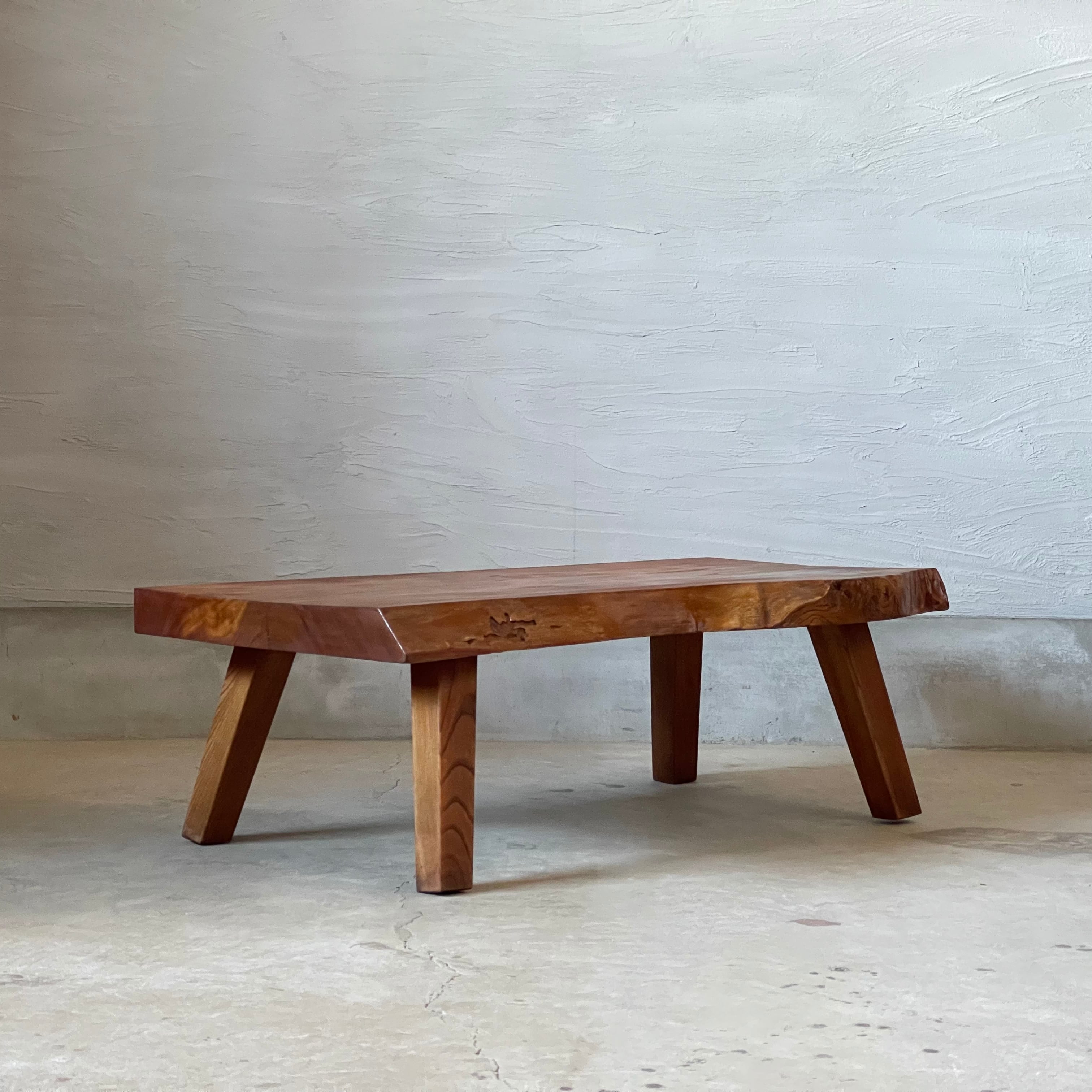 欅の木の流れるような木目と一辺に残されたライブエッジが美しい一枚板のコーヒーテーブルです。