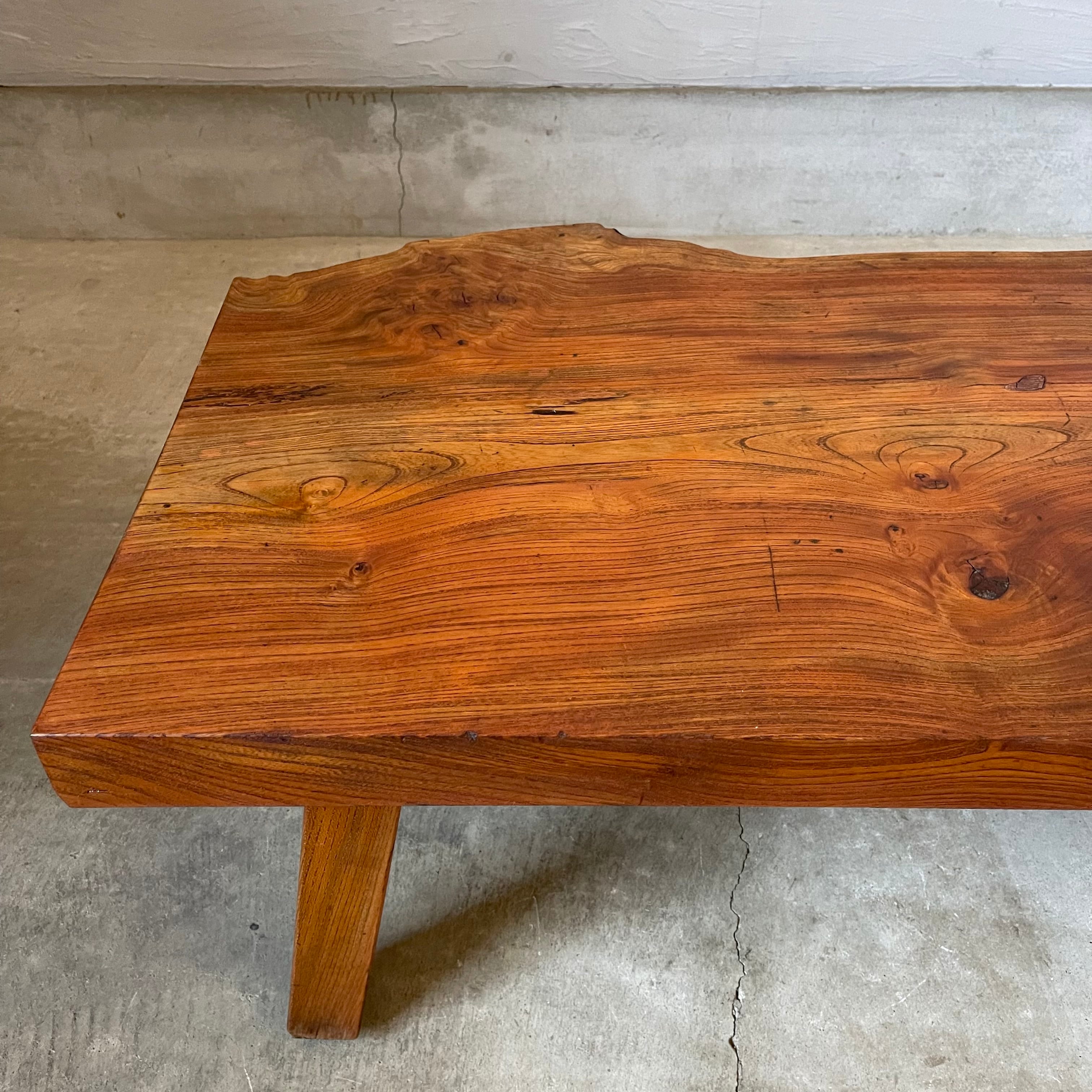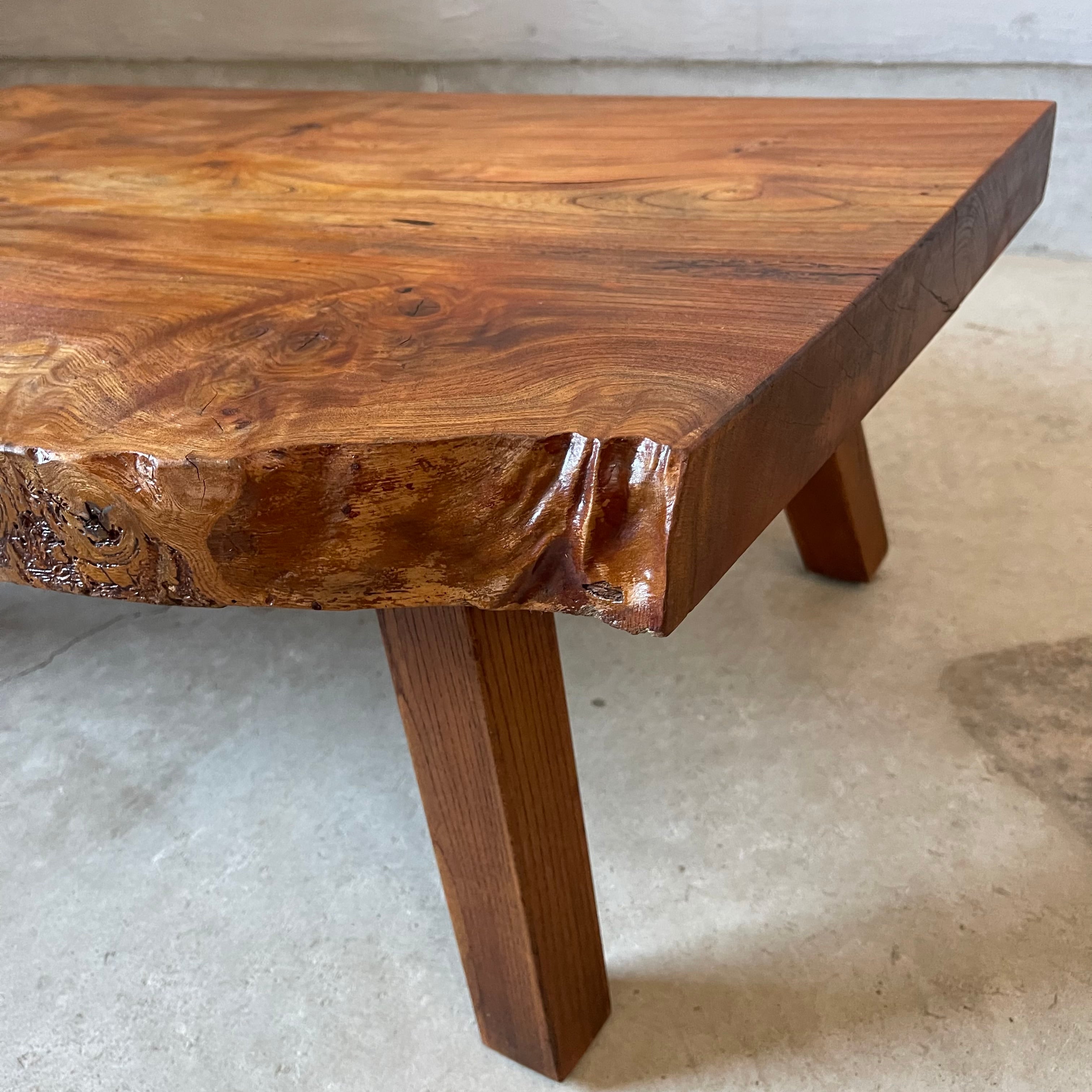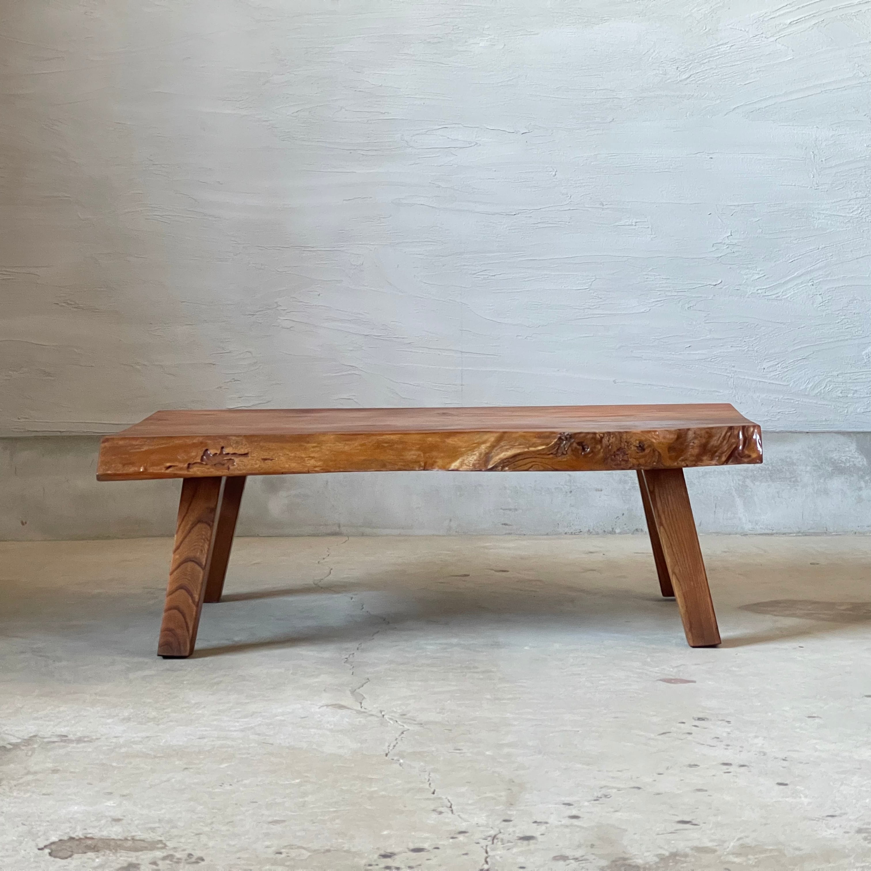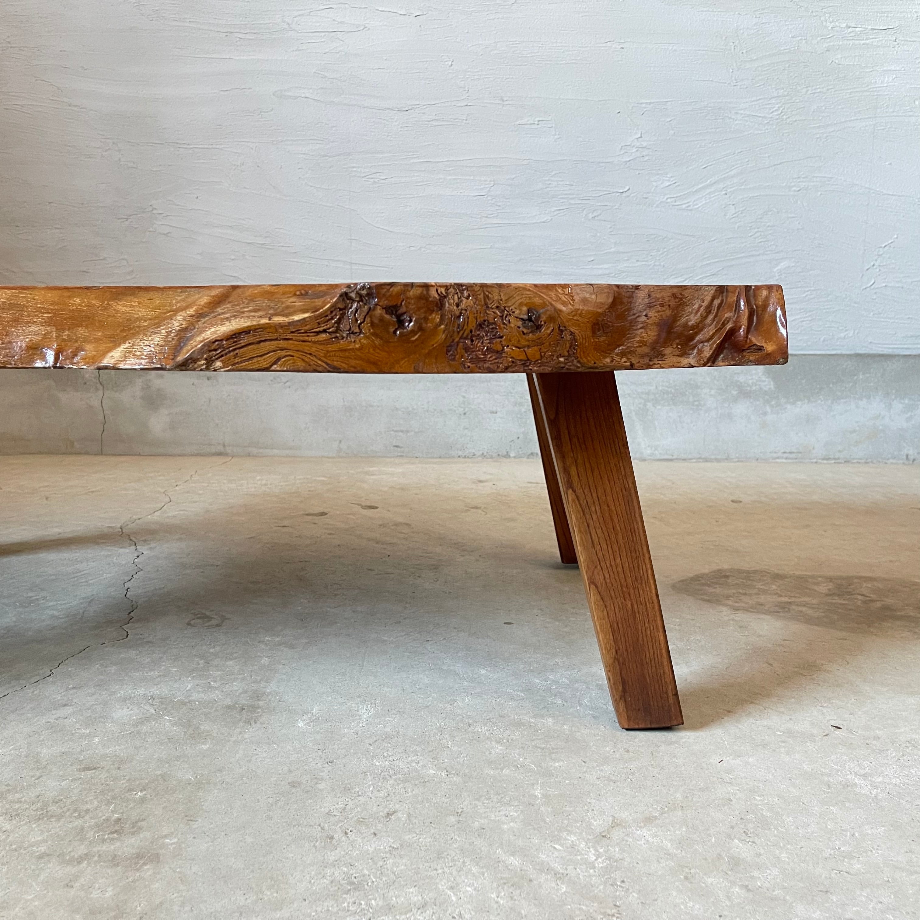 欅の木の流れるような木目と一辺に残されたライブエッジが美しい一枚板のコーヒーテーブルです。