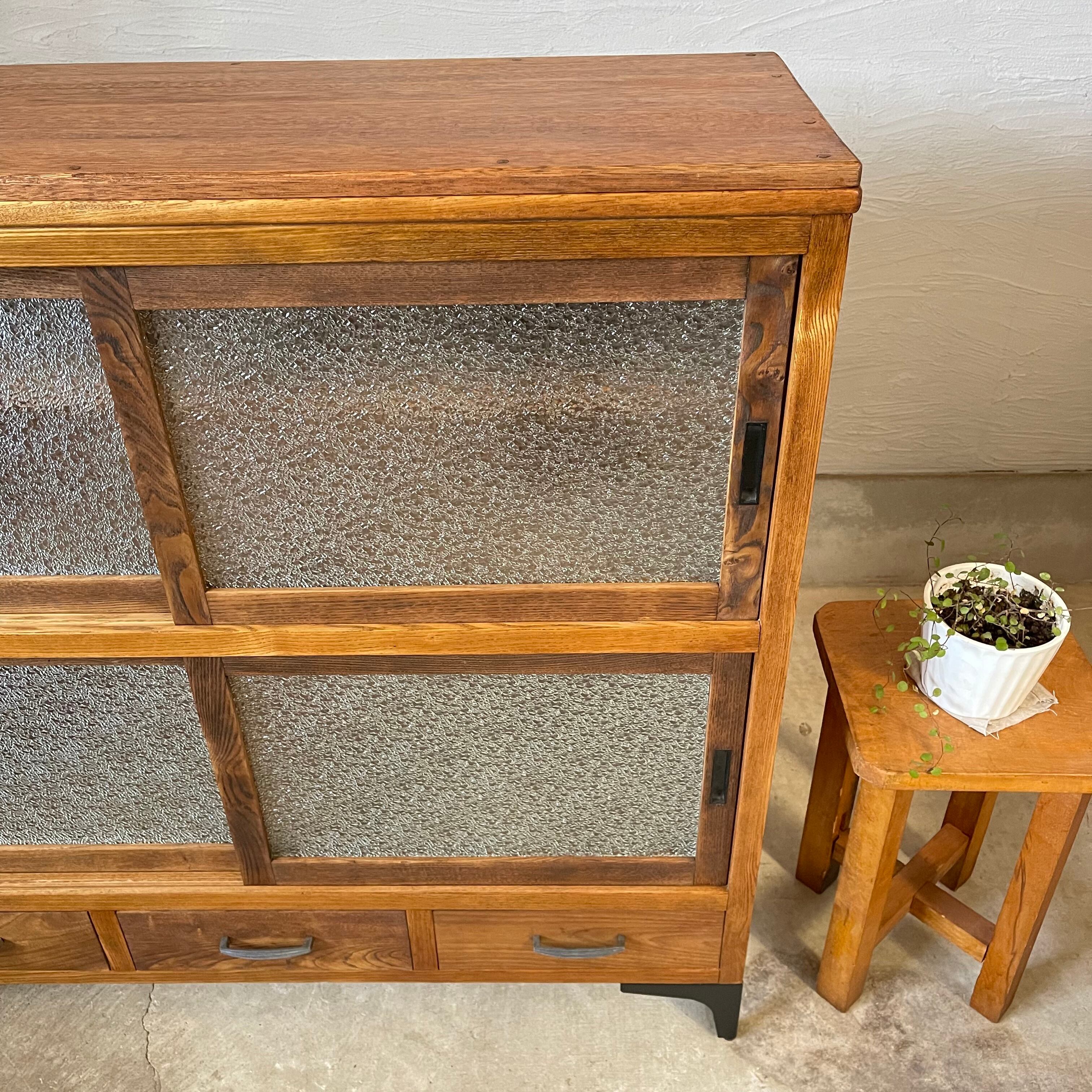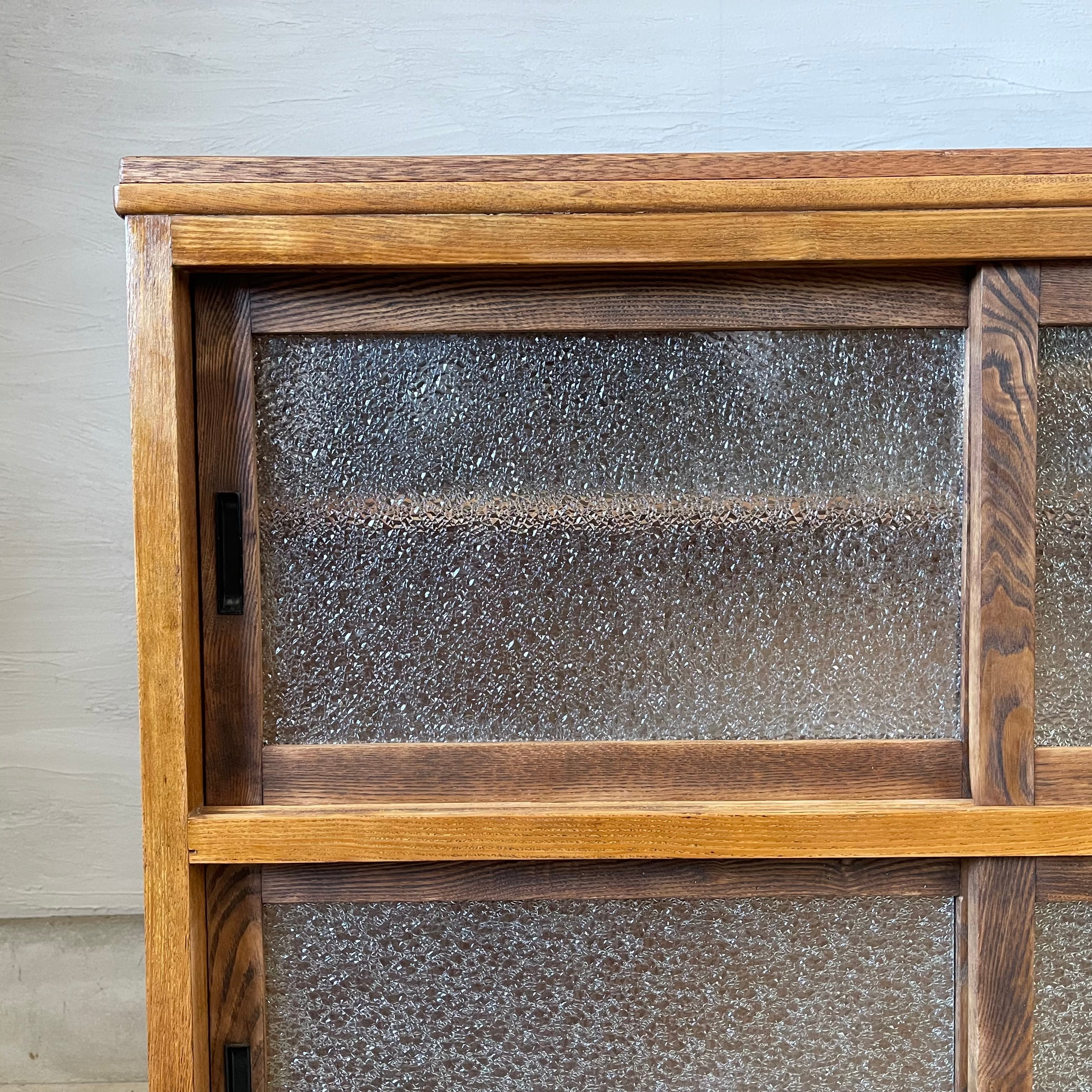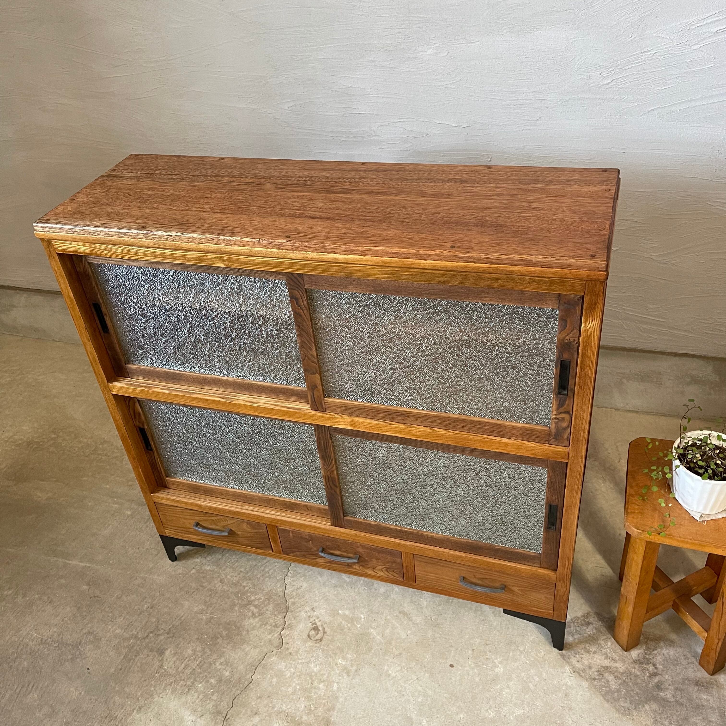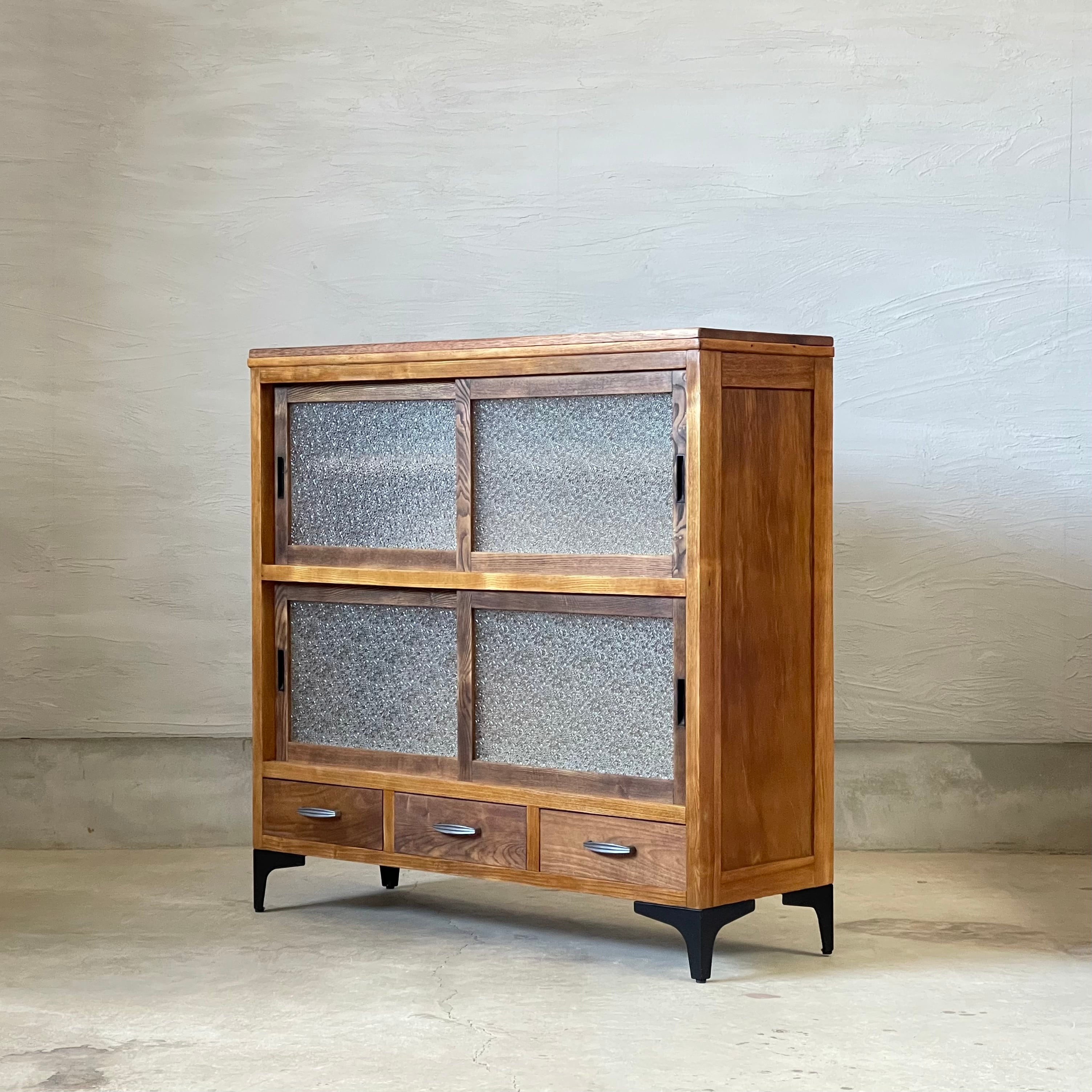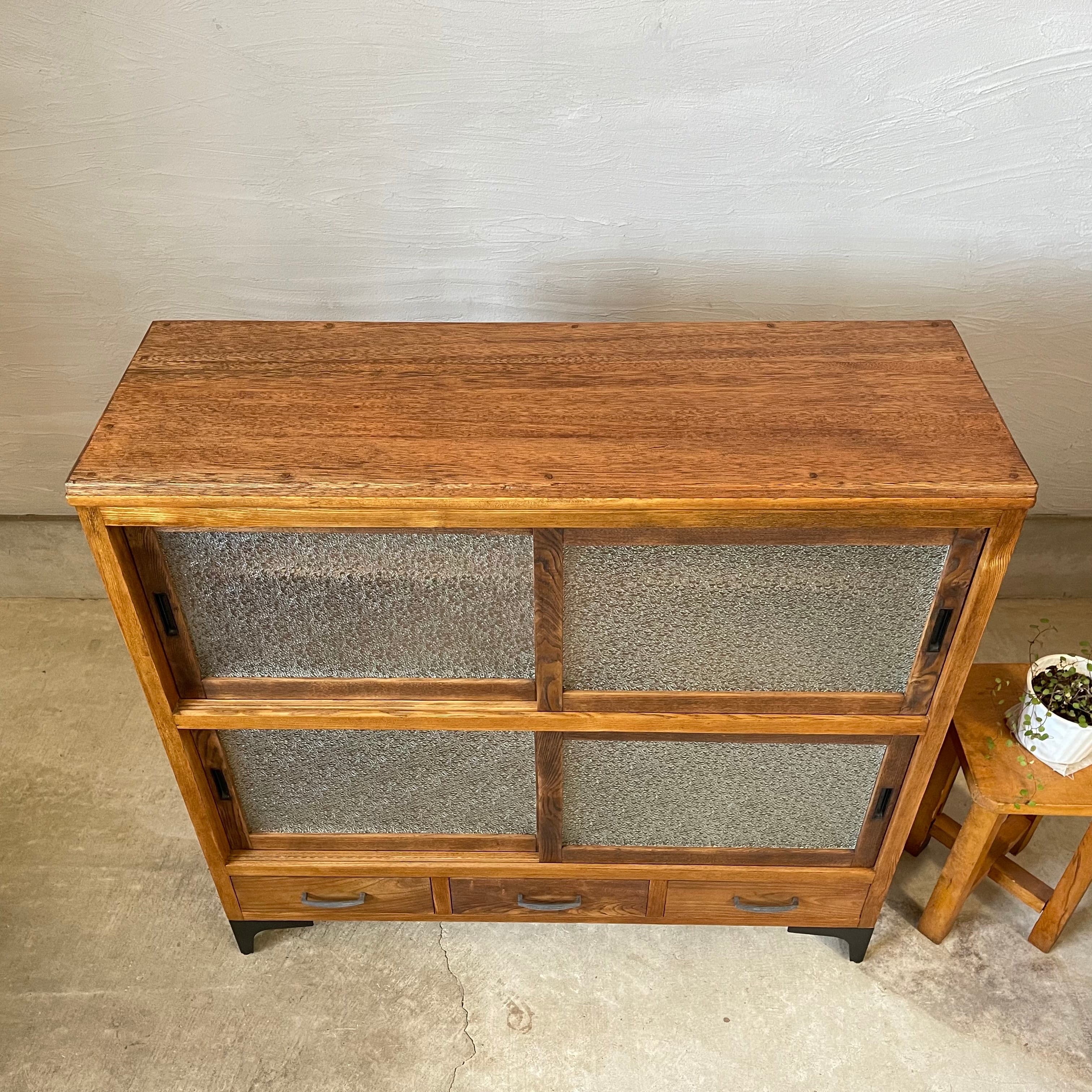 温かみのある経年変化とすっきりとしたアイアン脚が美しいダイヤガラスの食器棚です。